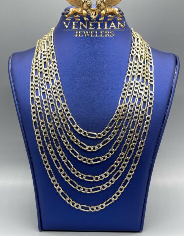 Elevate your style with this stunning 10KT Figaro chain featuring a diamond cut, available in 5MM width and lengths of 20″, 22″, or 24″. A beautiful fusion of white and yellow gold awaits you.