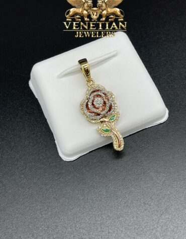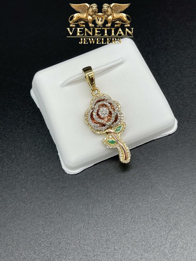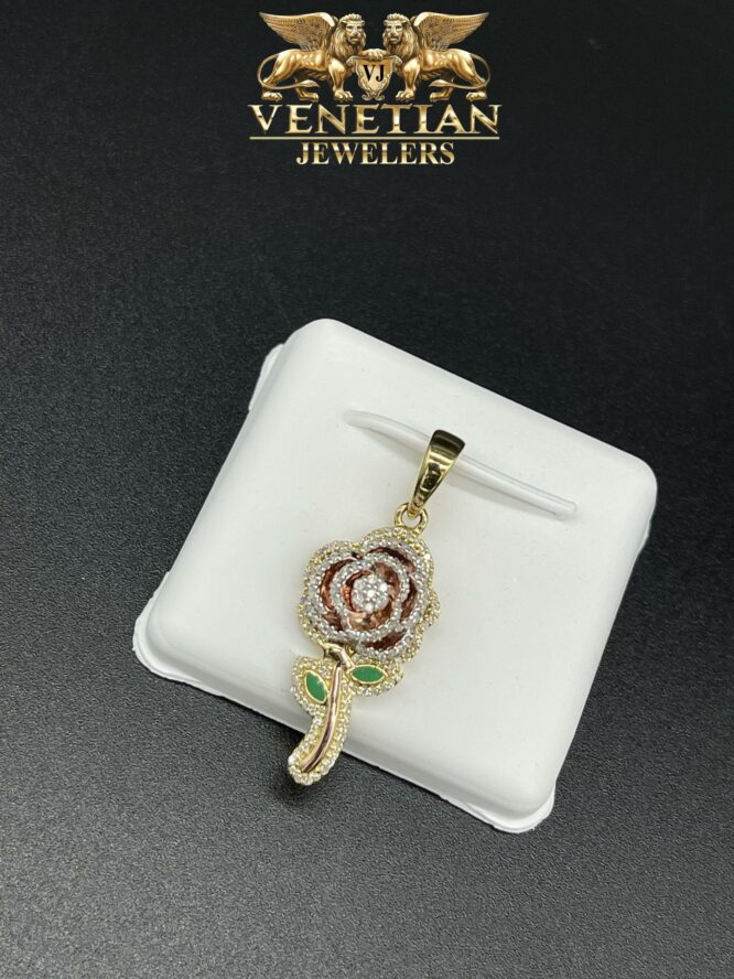 A custom made refreshing enamel painted red rose flower diamond pendant for your gorgeous loved one. Expertly crafted in cool 10K yellow gold, this pendant features a flower cluster of genuine diamonds.. An eye-catching look, this pendant has more than quater carat diamonds, red enamel paint and a polished shine. A look she is certain to adore.