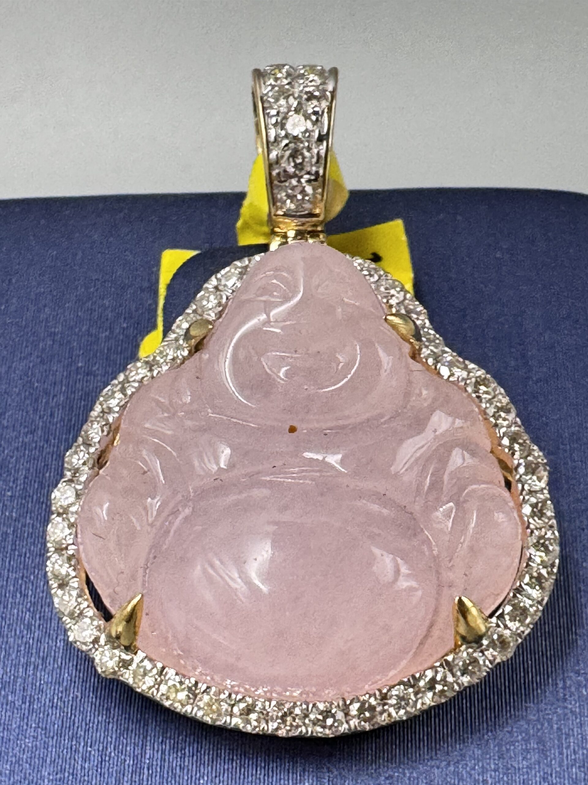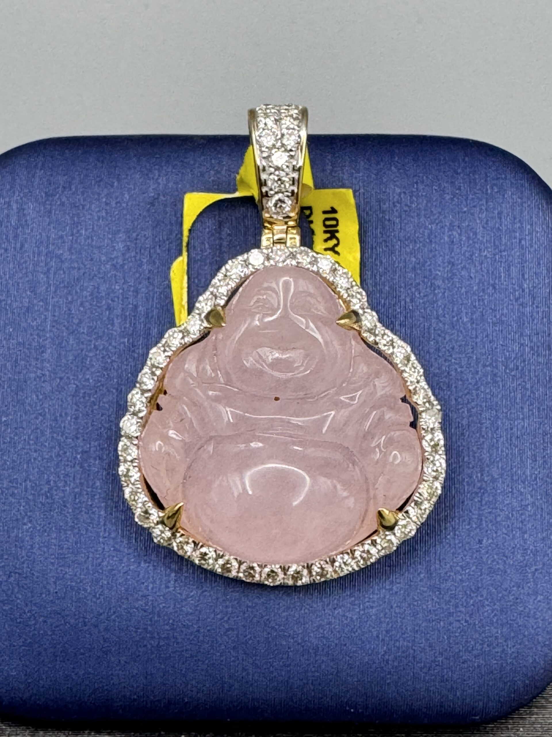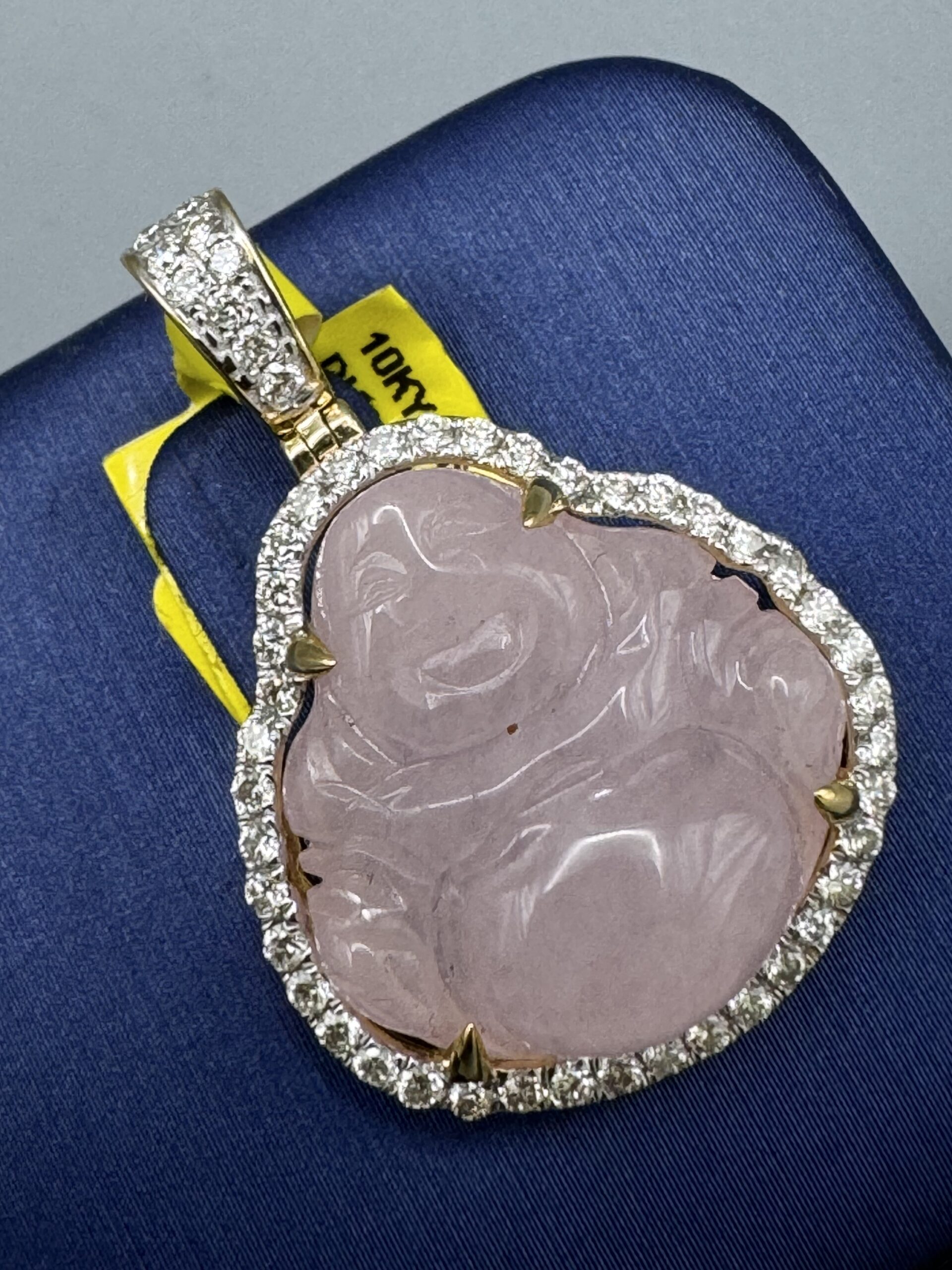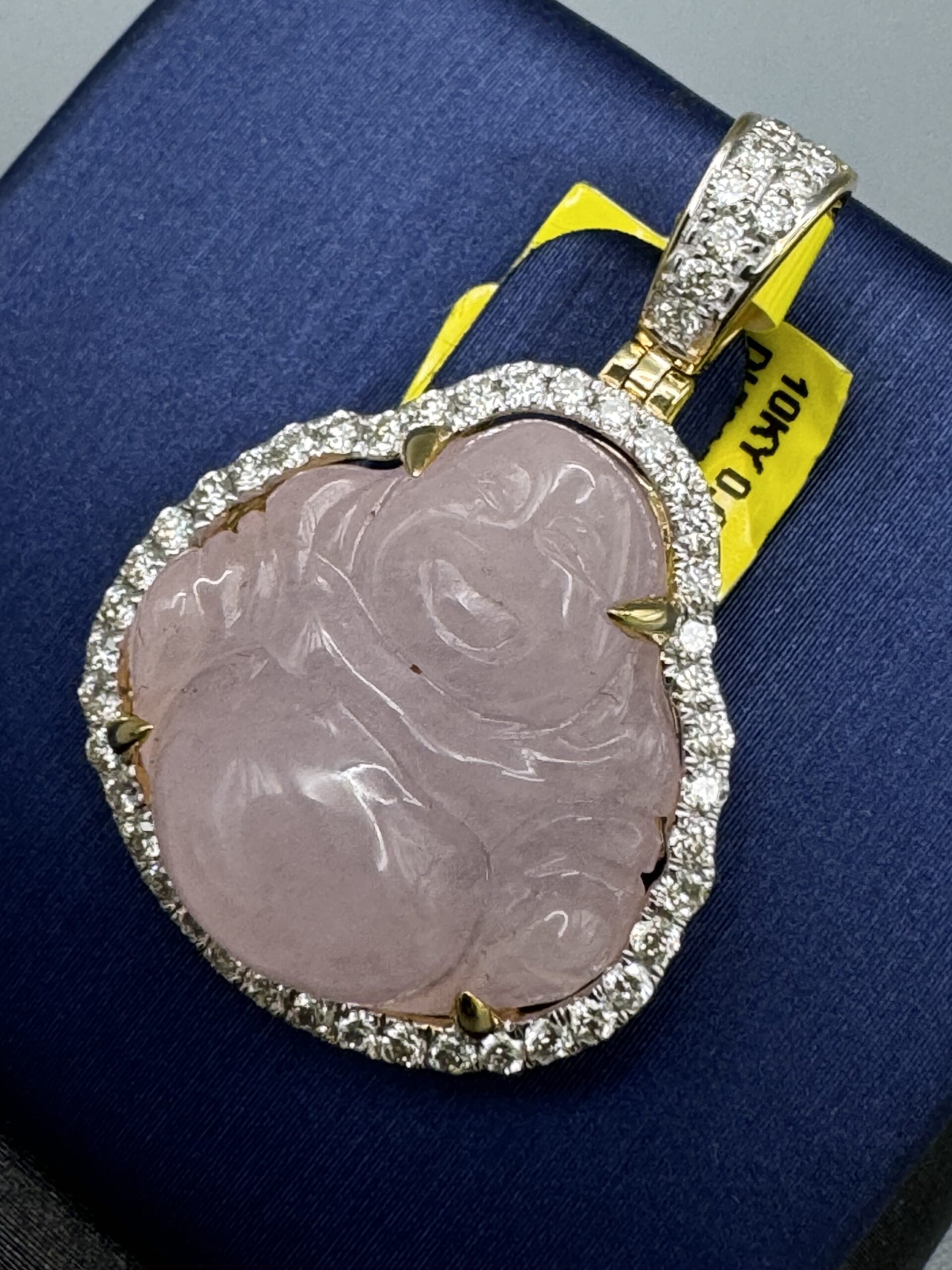 10KT Gold 0.65CT Diamond Pink Jade Buddah Pendant 25.0CT Jade 1.25″ Tall By 0.75″ Wide Approx Weight 5.3 Gram
