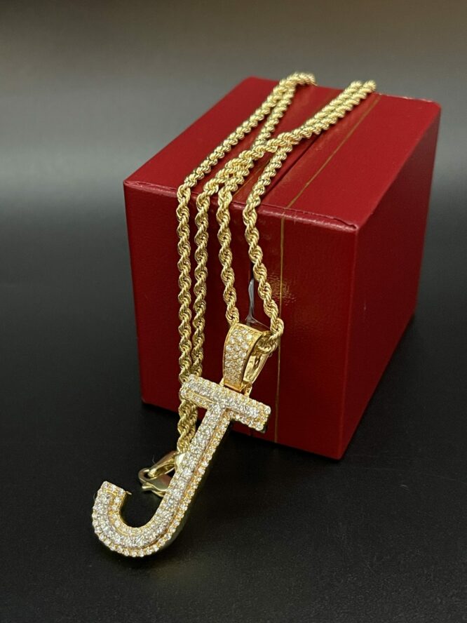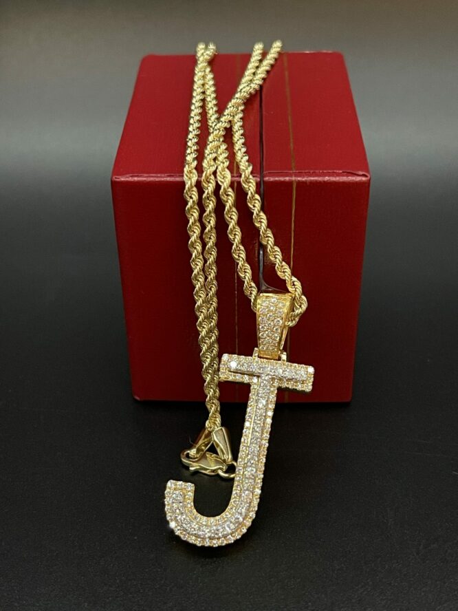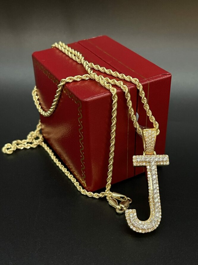 10KT Gold 1.15CT 2Tone Dia Initial “J” With VVS Diamonds Size 1.75 Inches Tall Comes With 20″ Rope Chain Approx Weight 2.5 Grams