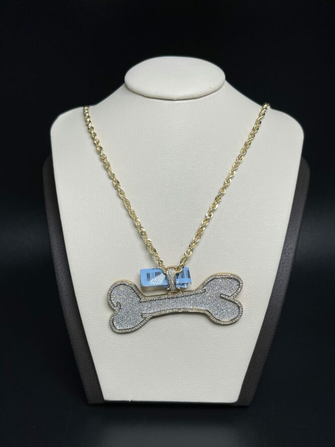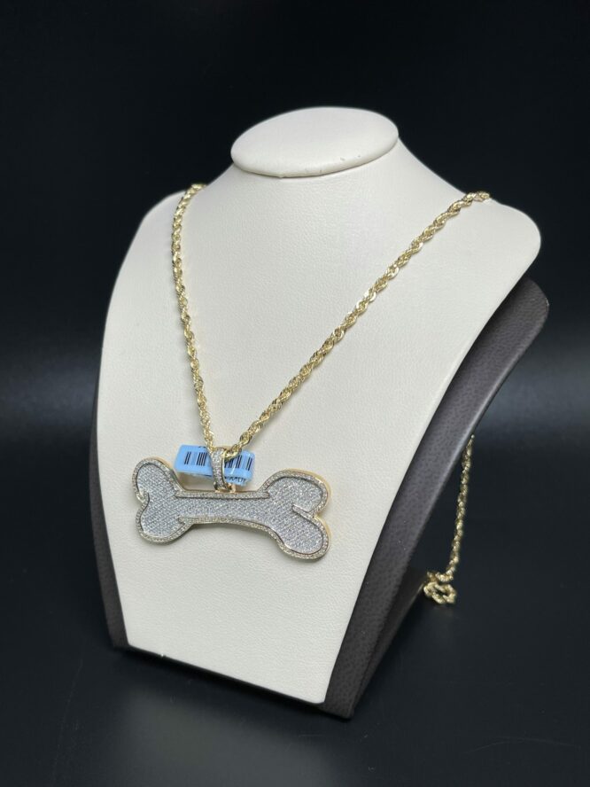 10KT Gold 1.15CT Diamond Dog Bone Pendant ComboSet 2″ Tall 0.5″ Wide Approx Gold Weight 5.24 Grams Comes With 10KT Gold Rope Necklace 2.5MM Approx Gold Weight 2.95 Grams