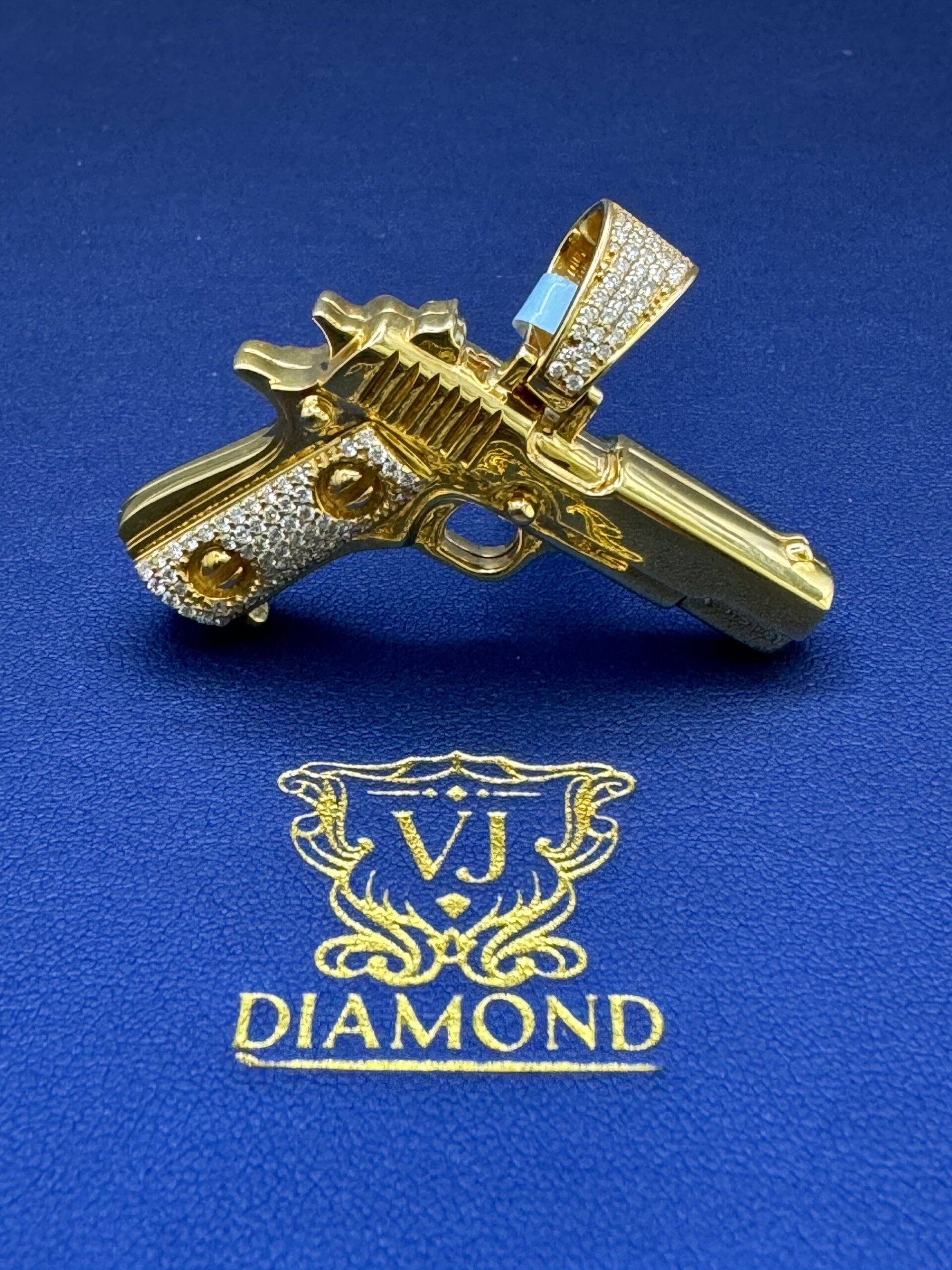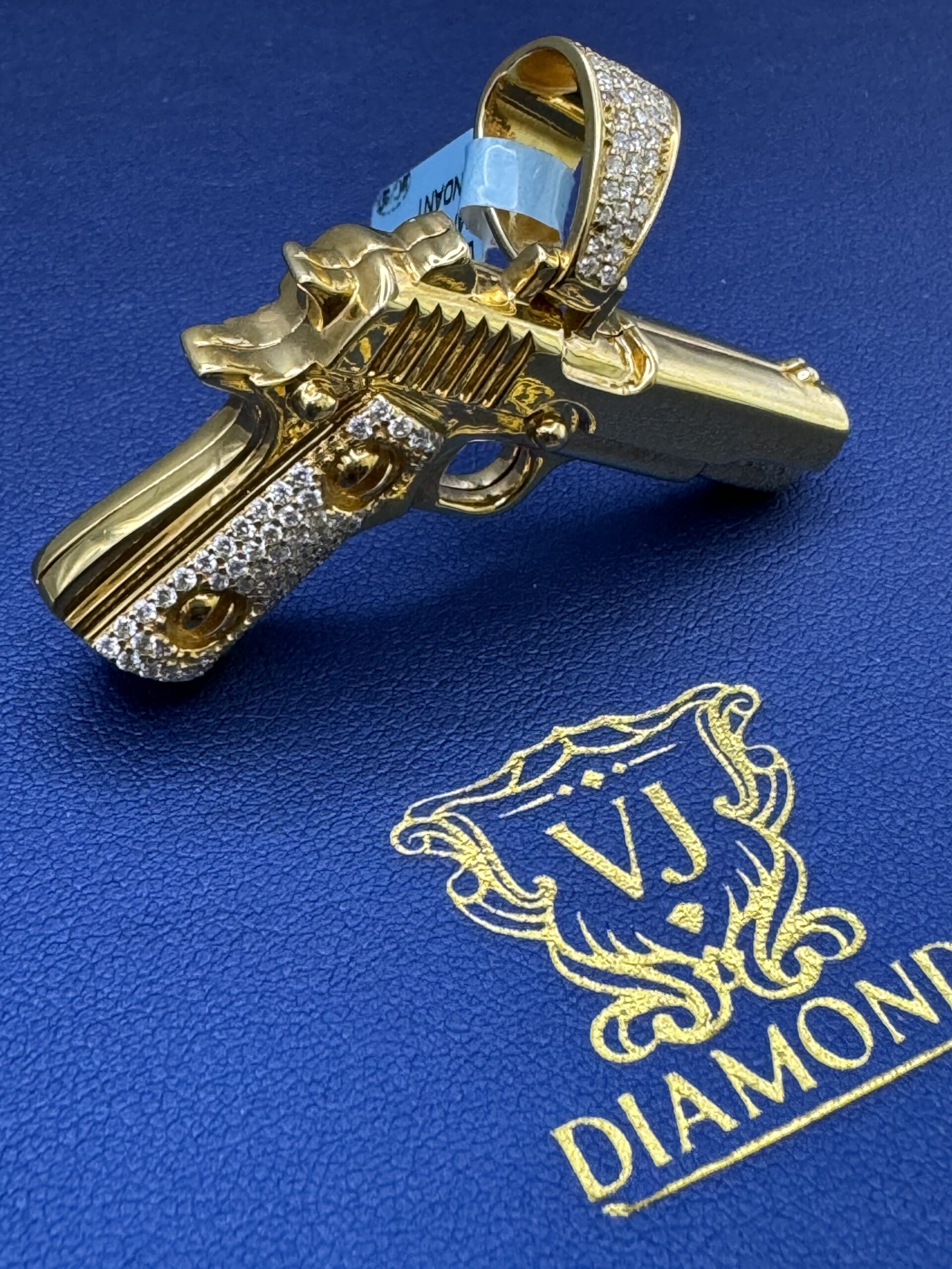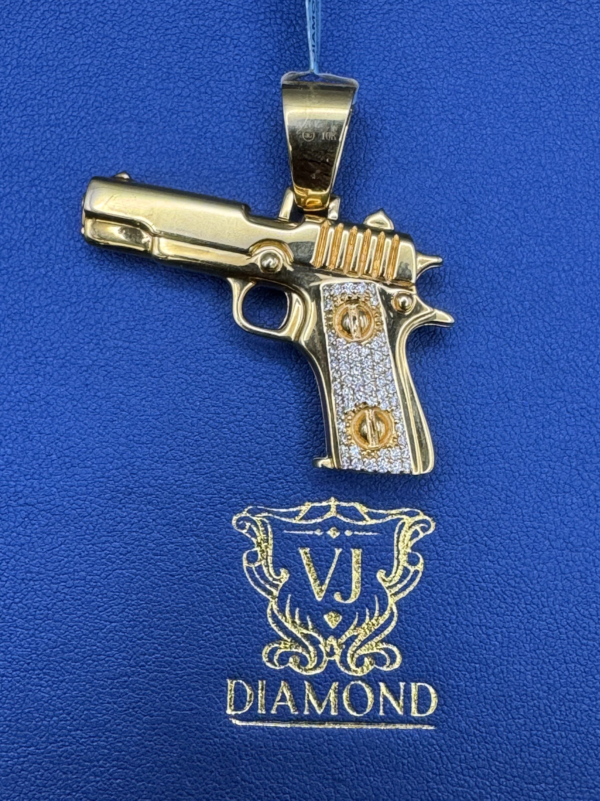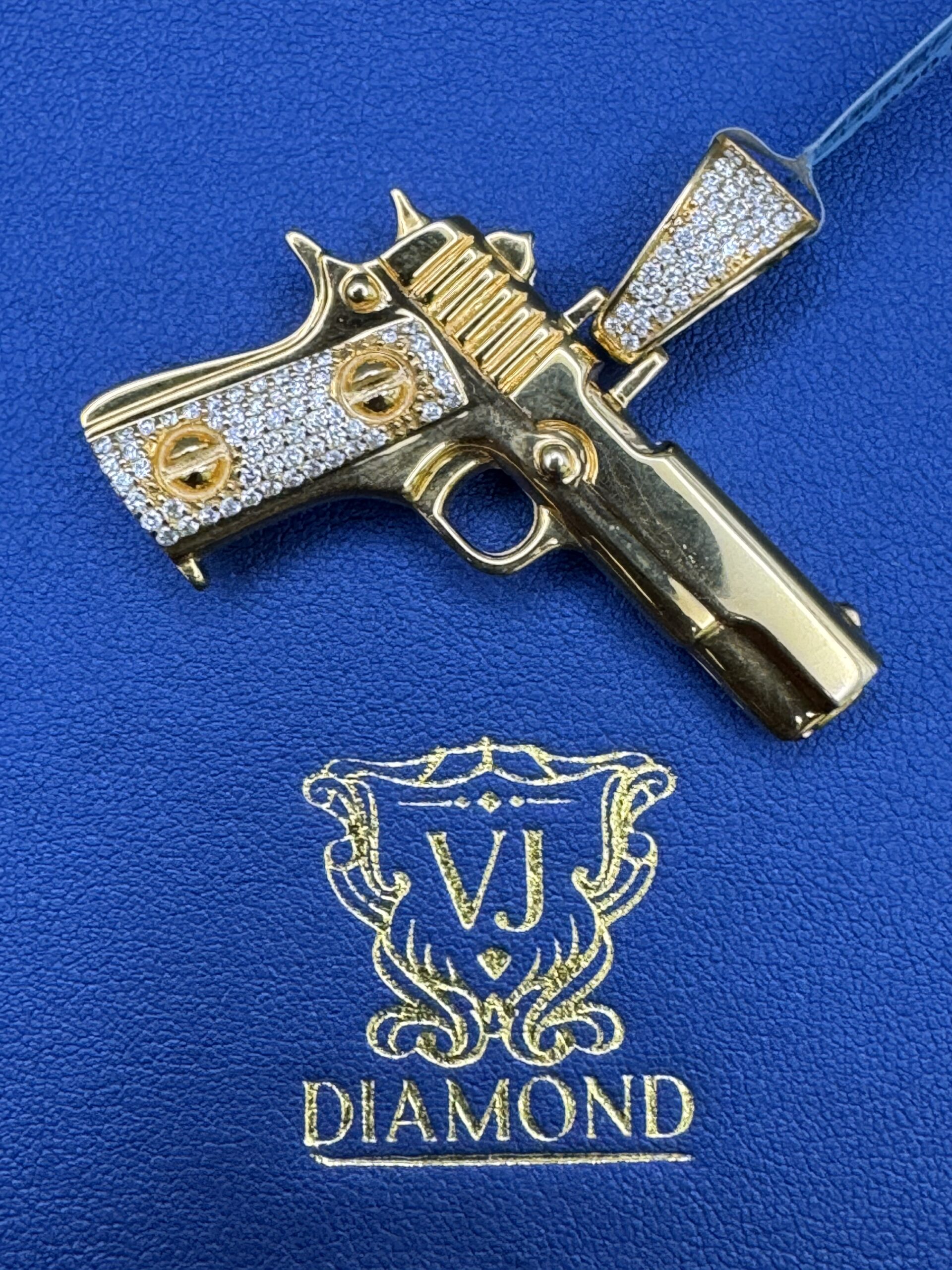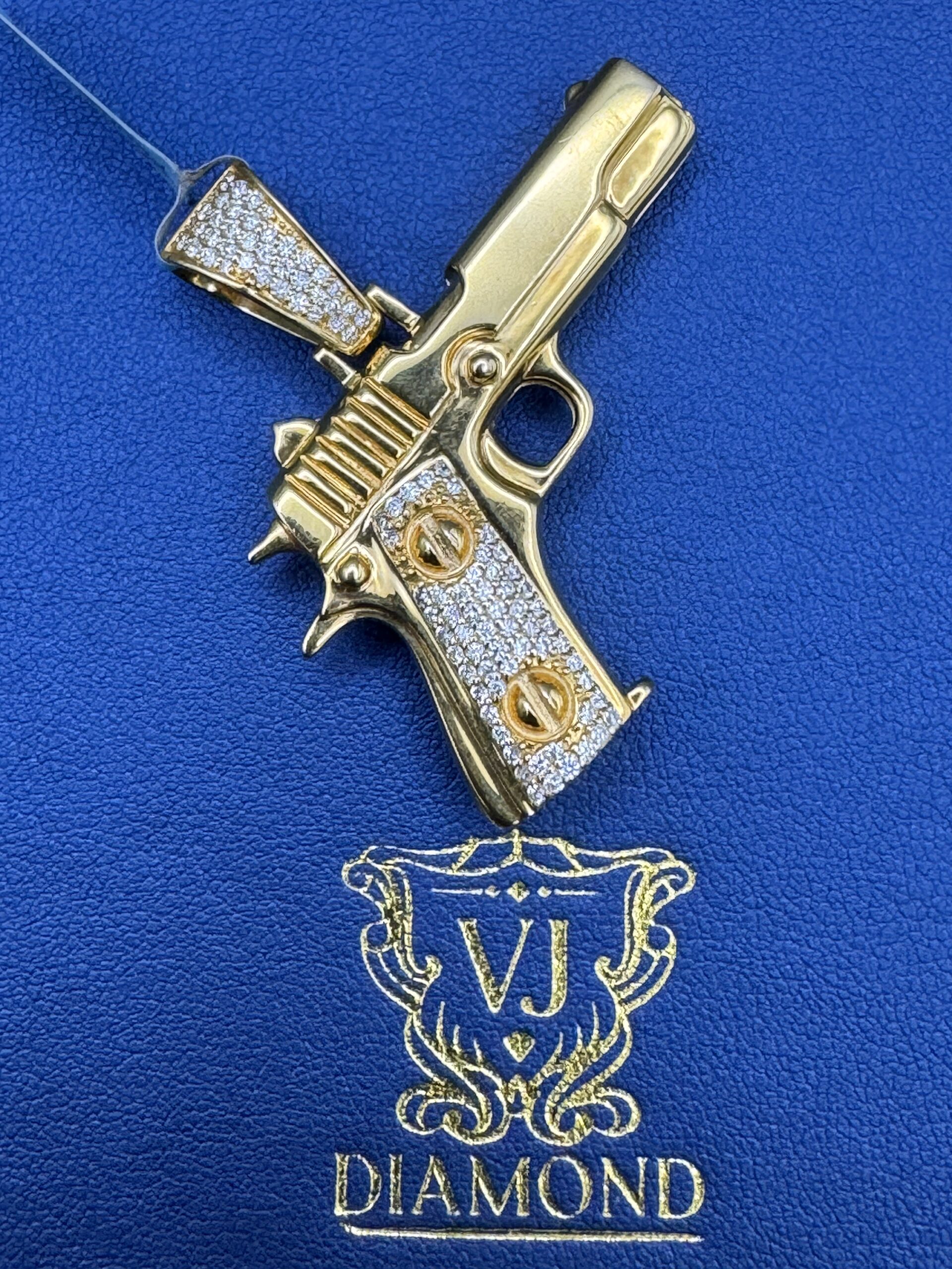 10KT Yellow Gold 1.20CT Diamond HandGun Pendant Resembles 1911 Style Semi Automatic Custom 3D Design Double Sided Can Wear On Both Sides 1.75″ Wide By 1.75″ Tall Approx Gold Weight 13.3 Gram Bug Opening Bell Can FitUp 8MM Chain