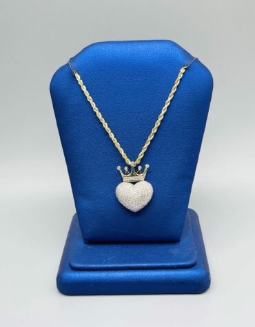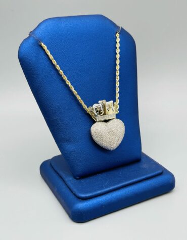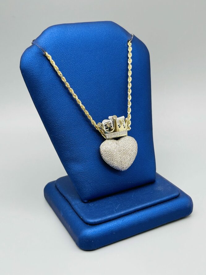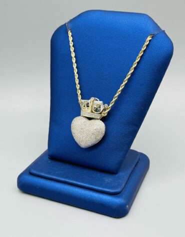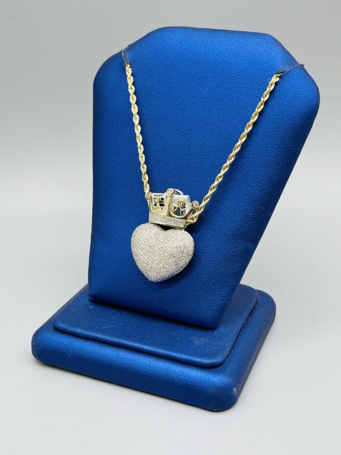 10KT Gold 1.20CT Diamonds Puff Heart With Crown Bell 1″ Tall By 1″ Wide Approx Gold Weight 4.55 Grams Comes With 2MM 18″ Rope Necklace Approx Gold Weight 2.91 Grams