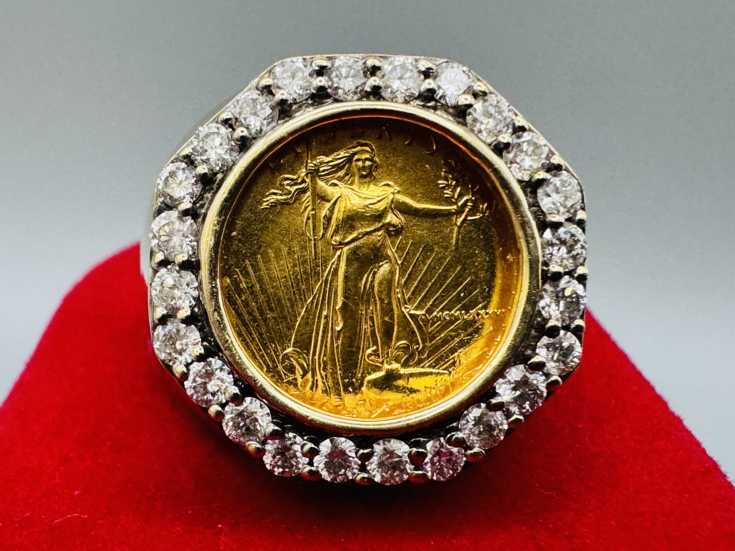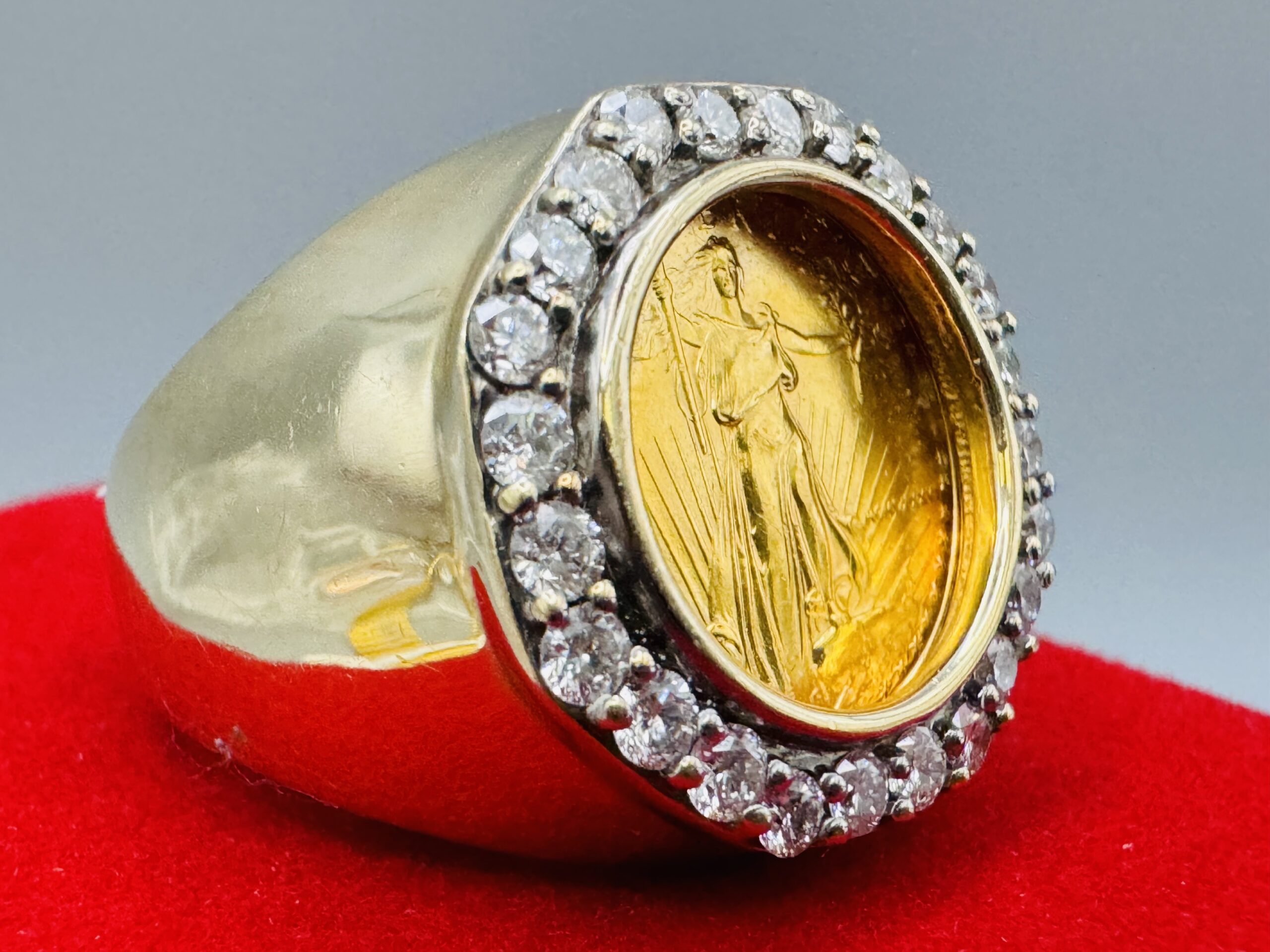 10KT Gold 1.25CT Diamond Liberty Coin Ring 24KT Gold Coin In Middle With 10KT Gold Mounting Size 10 20MM Width Approx Gold Weight 11.9 Gram