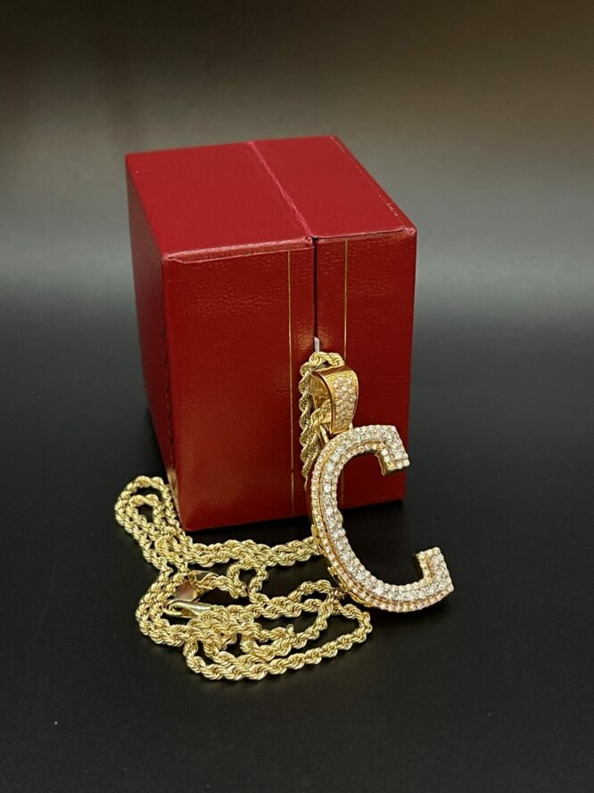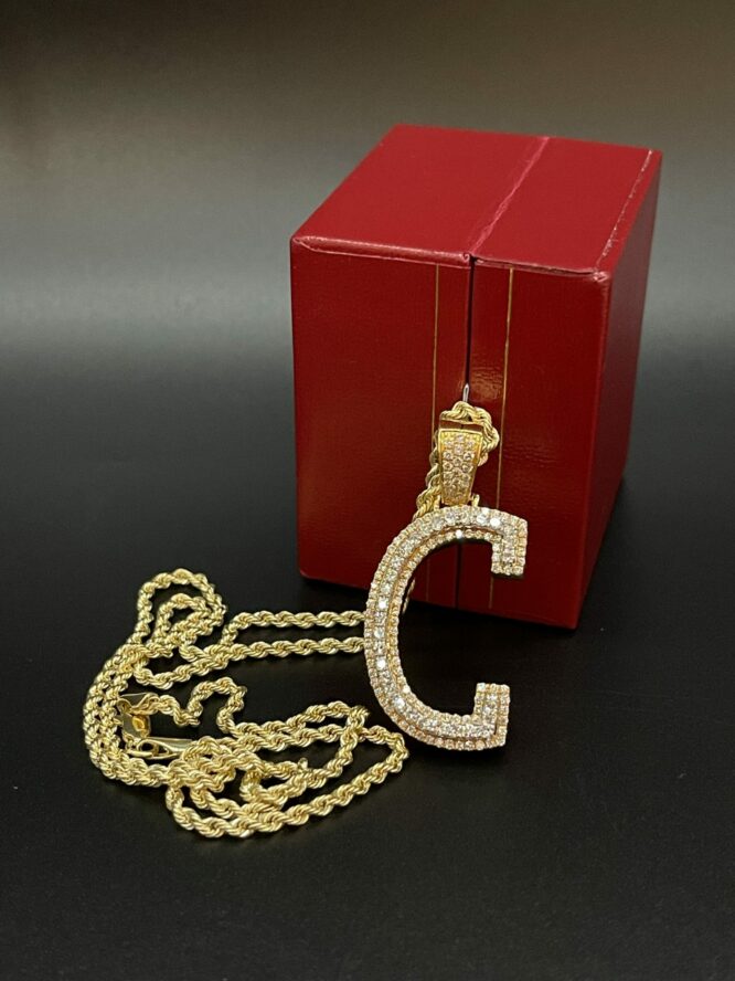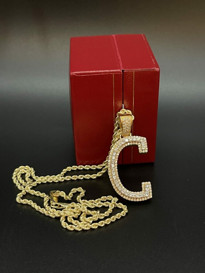 10KT Gold 1.25CT 2Tone Dia Initial “C” With VVS Diamonds Size 1.75 Inches Tall Comes With 20″ Rope Chain Approx Weight 2.5 Grams