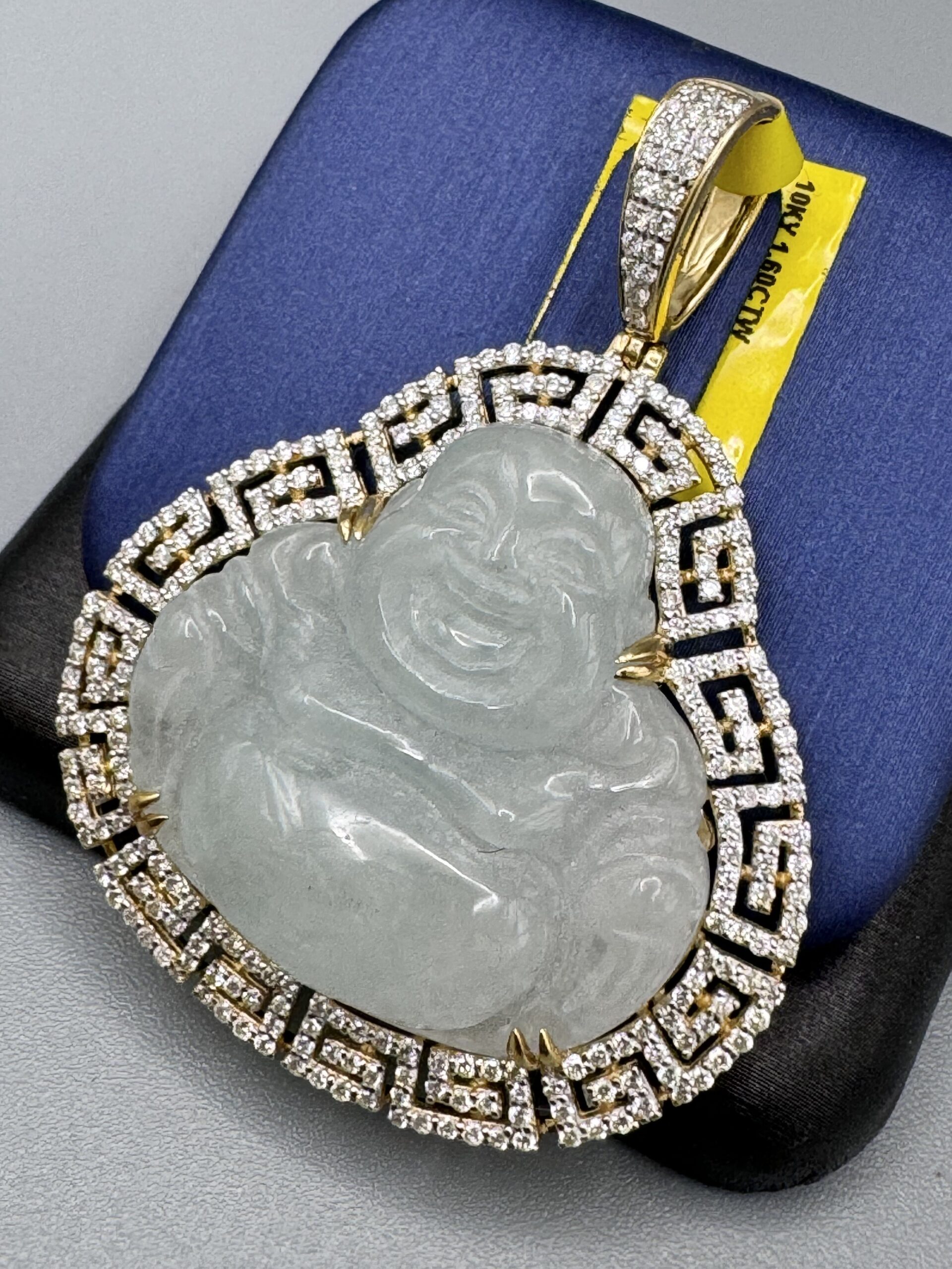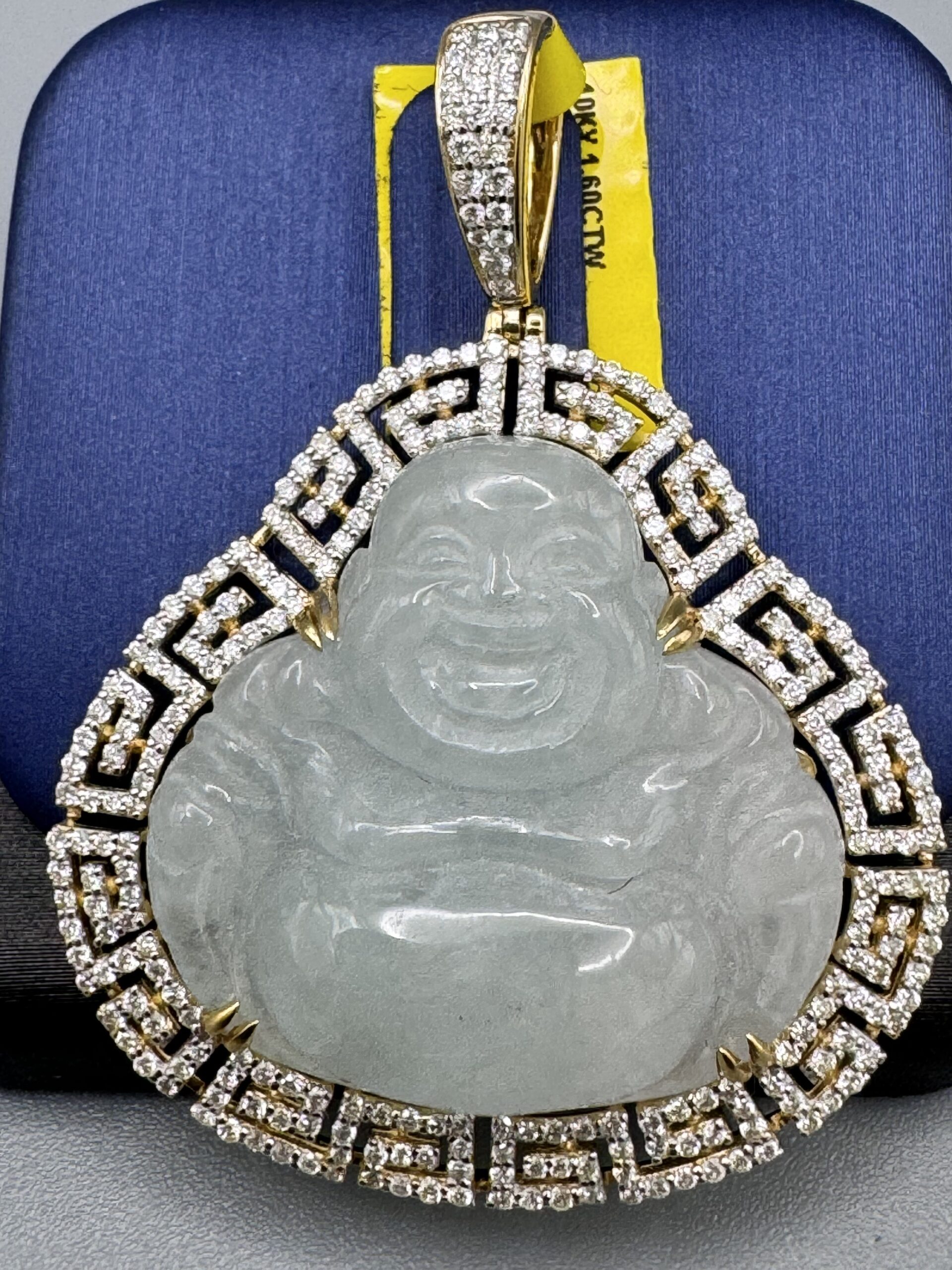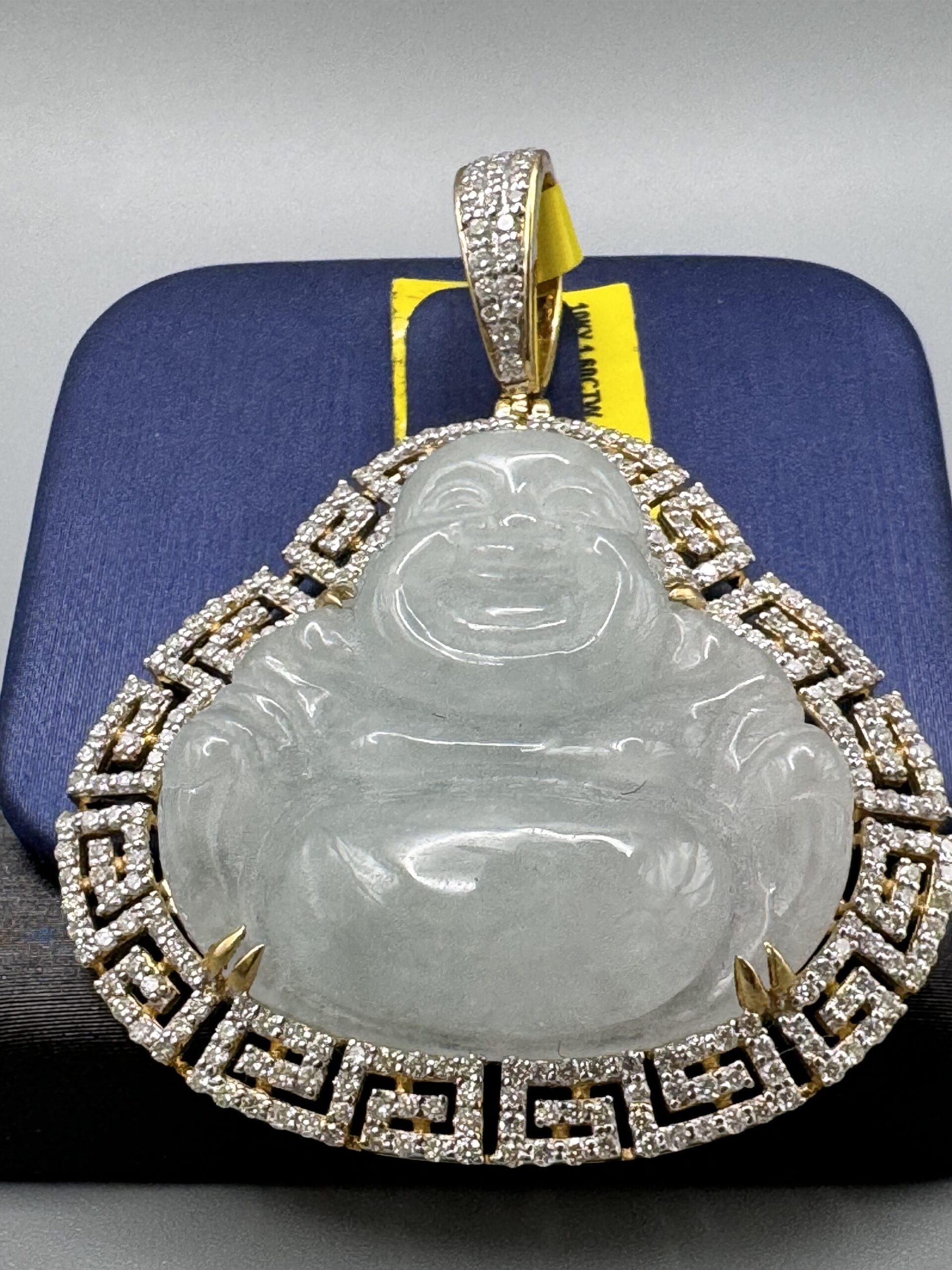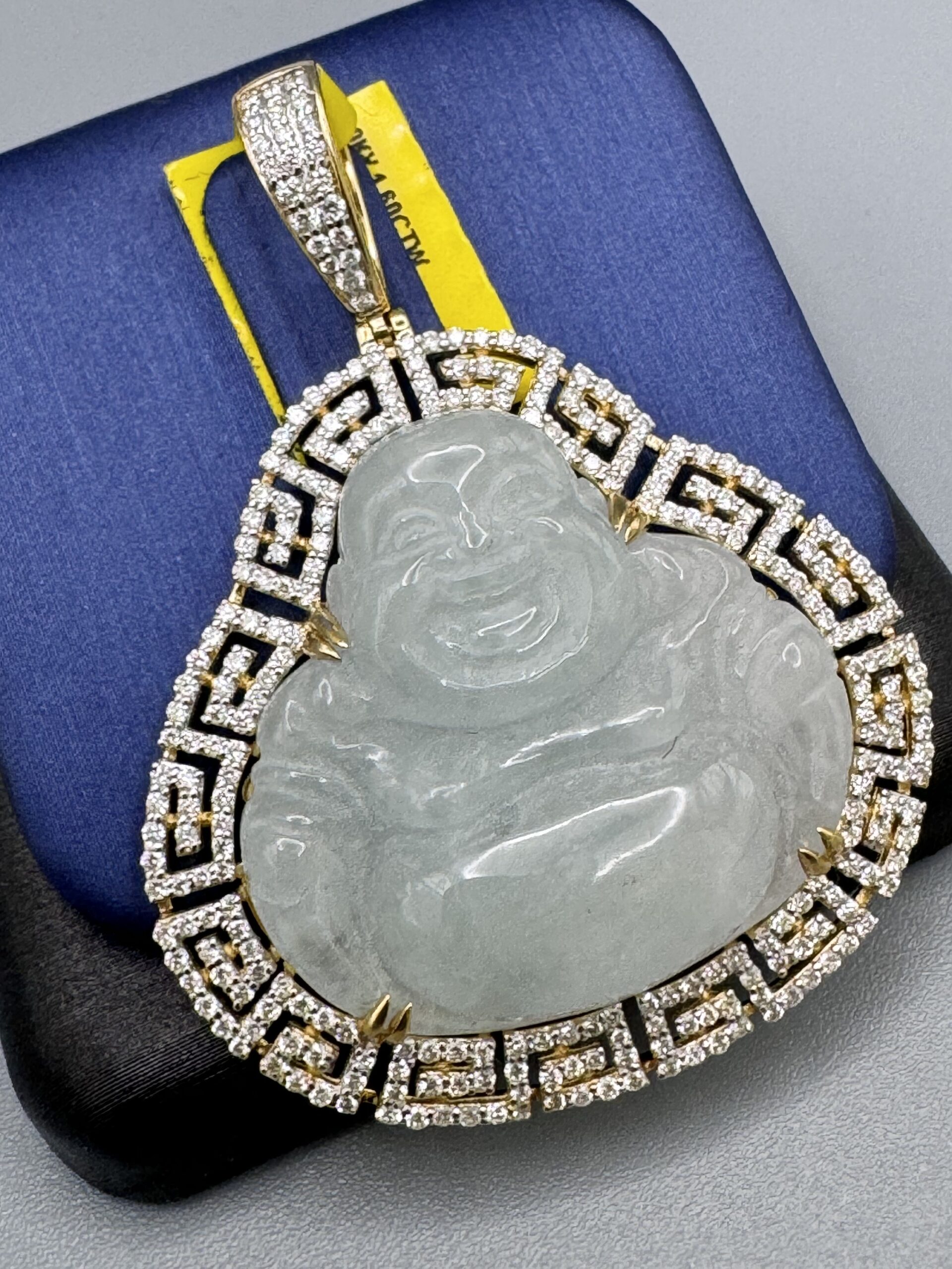 10KT Gold 1.60CT Diamond Jade Happy Buddah Pendant With Greeky Design Pure GoodLuck Pendant 2″ Tall By 1.5″ Wide Approx Weight 12.7 Gram 50.0CT Jade Stone