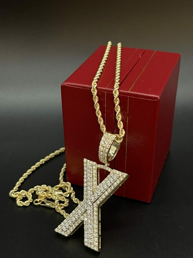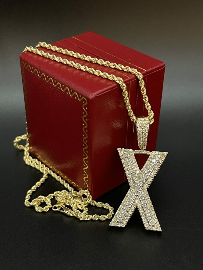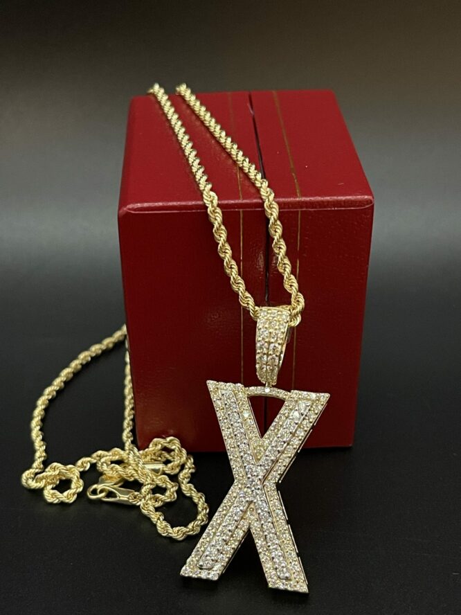 10KT Gold 1.65CT 2Tone Dia Initial “X” With VVS Diamonds Size 1.75 Inches Tall Comes With 20″ Rope Chain Approx Weight 2.5 Grams