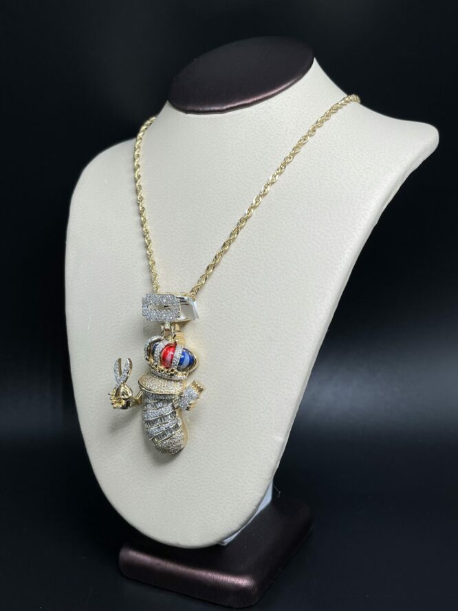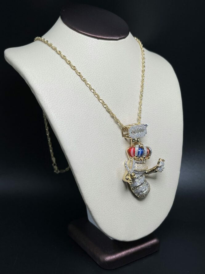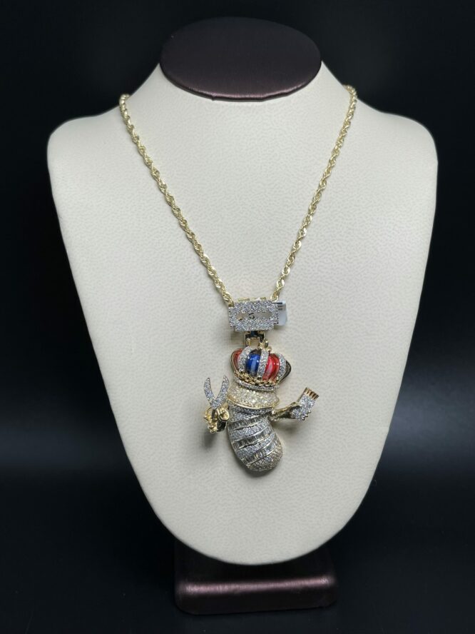 10KT Gold 1.80CT Diamonds King Barber With Scissors And Clippers On Hands 2 Inches Tall Approx Gold Weight 20.10 Grams Comes with 10KT Gold Rope Necklace 20″ 2.5MM Approx Gold Weight Of Necklace 2.39 Grams