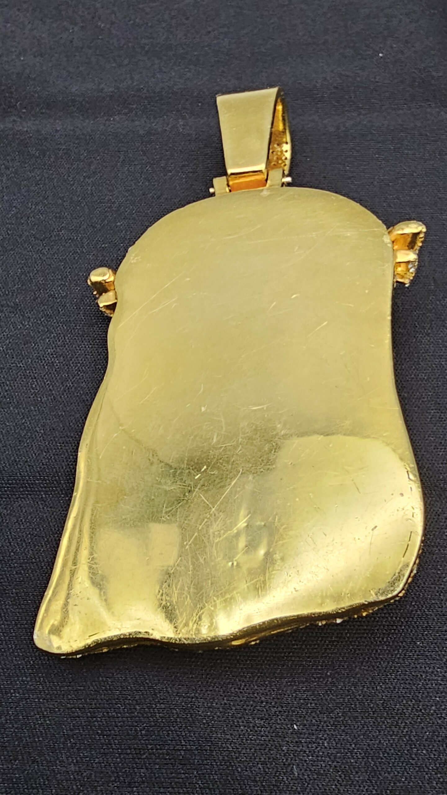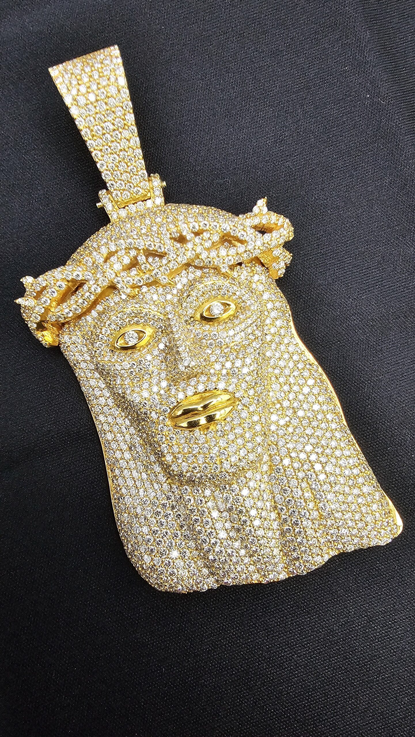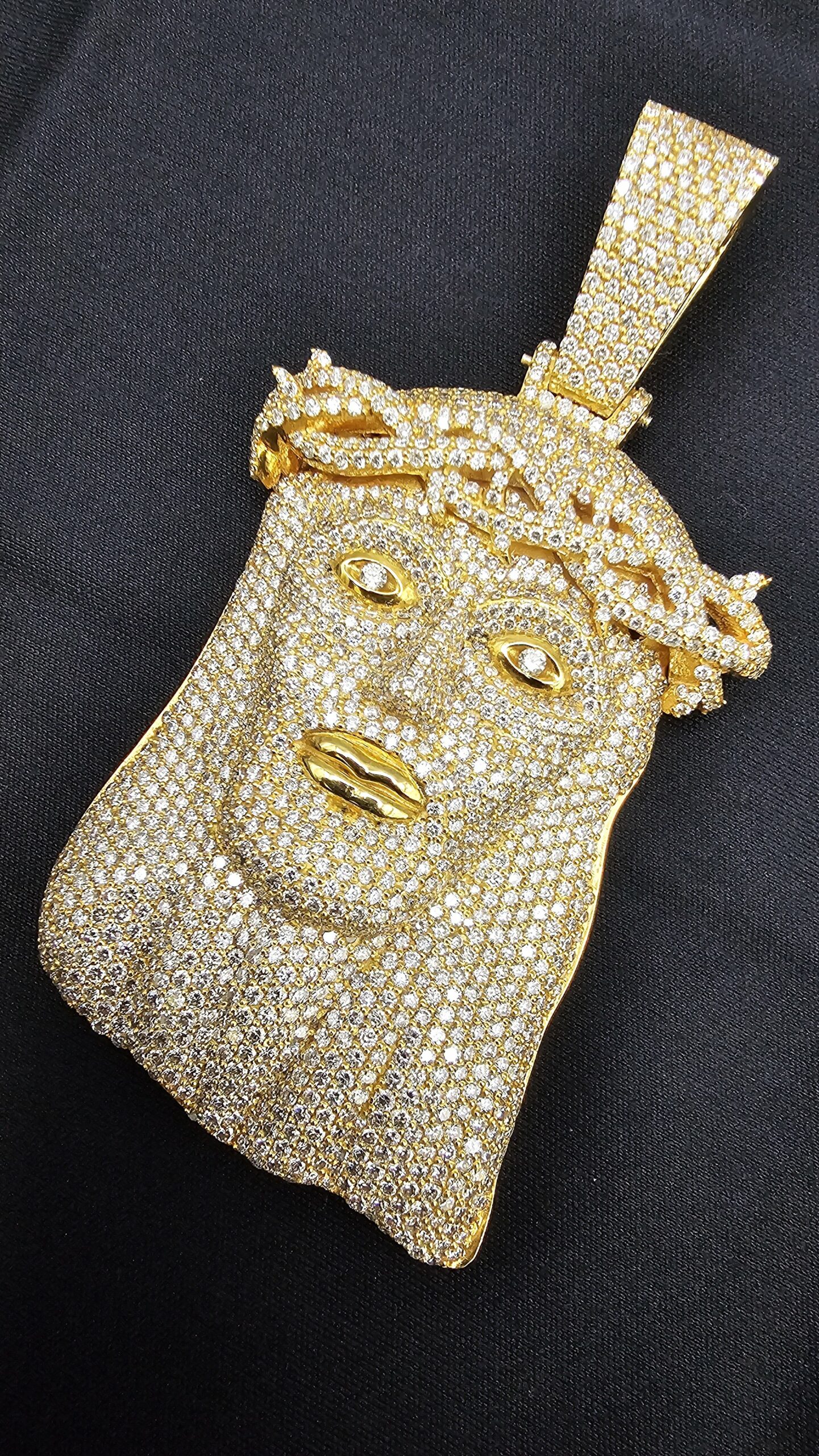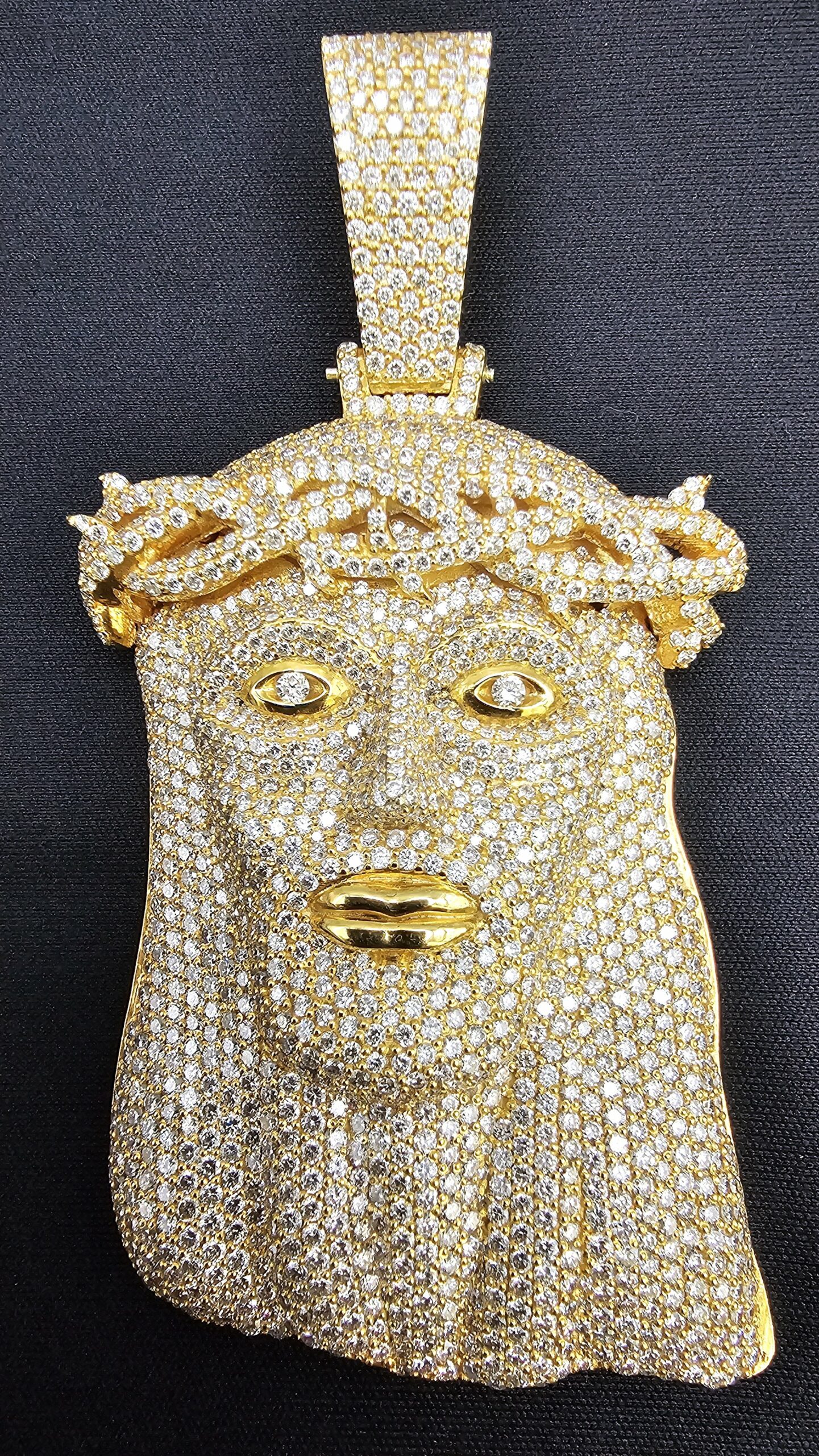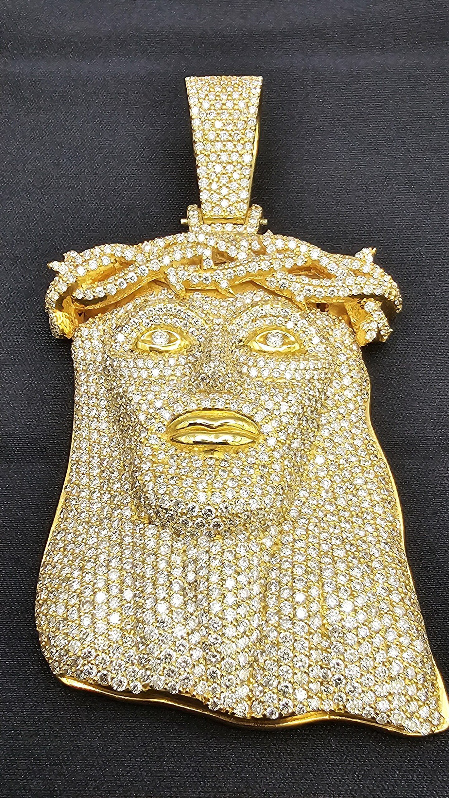 10KT Gold 12.25CT Diamond Jesus Pendant Solid Back 3.25″ Tall 1.5″ Wide Approx Gold Weight 68.4 Gram 0.75″ Tall Bell 0.50″ Wide Opening