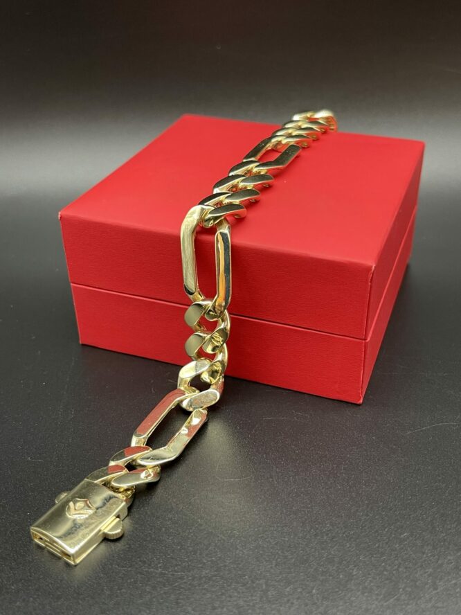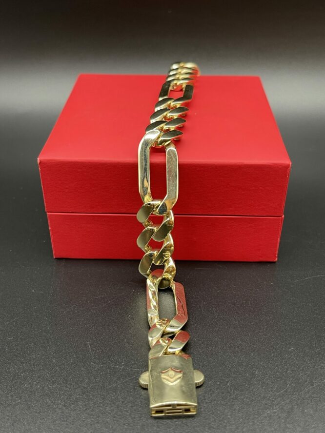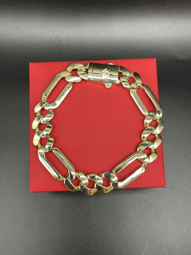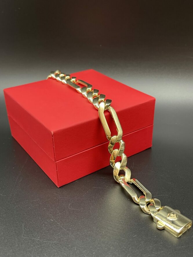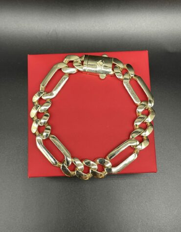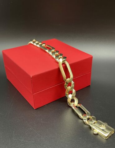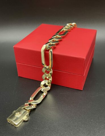 10KT Gold 14.5MM Figaro Monaco Bracelet 10KT Gold 14.5MM Figaro Monaco Bracelet Original price was: $3,536.99.Current price is: $2,374.79.