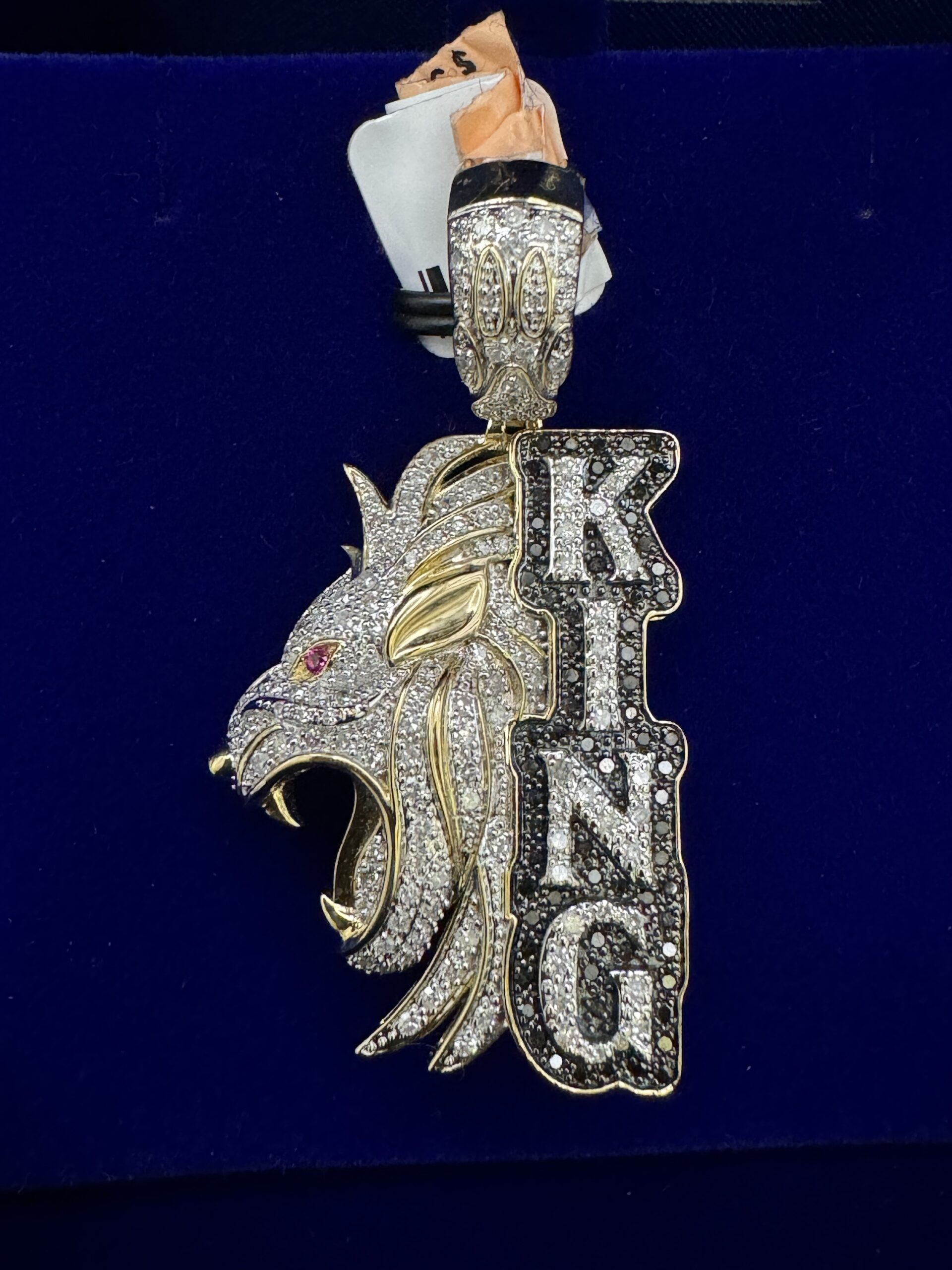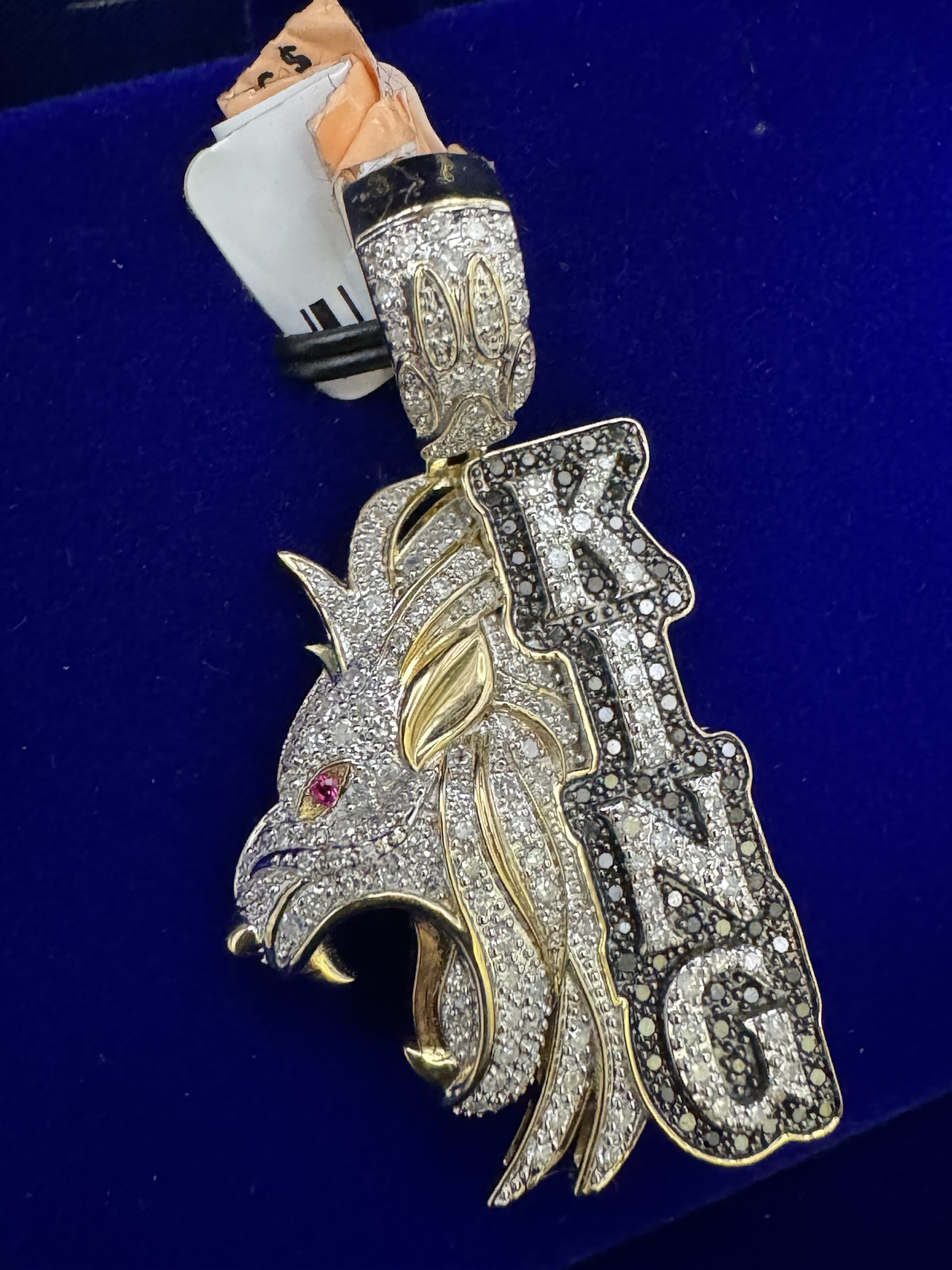Elevate your style with this stunning 10Kt Gold King Lion Pendant. Measuring 2″ tall by 1″ wide and adorned with 1.00CT diamonds, it weighs approximately 8.5 grams. A true statement piece!
