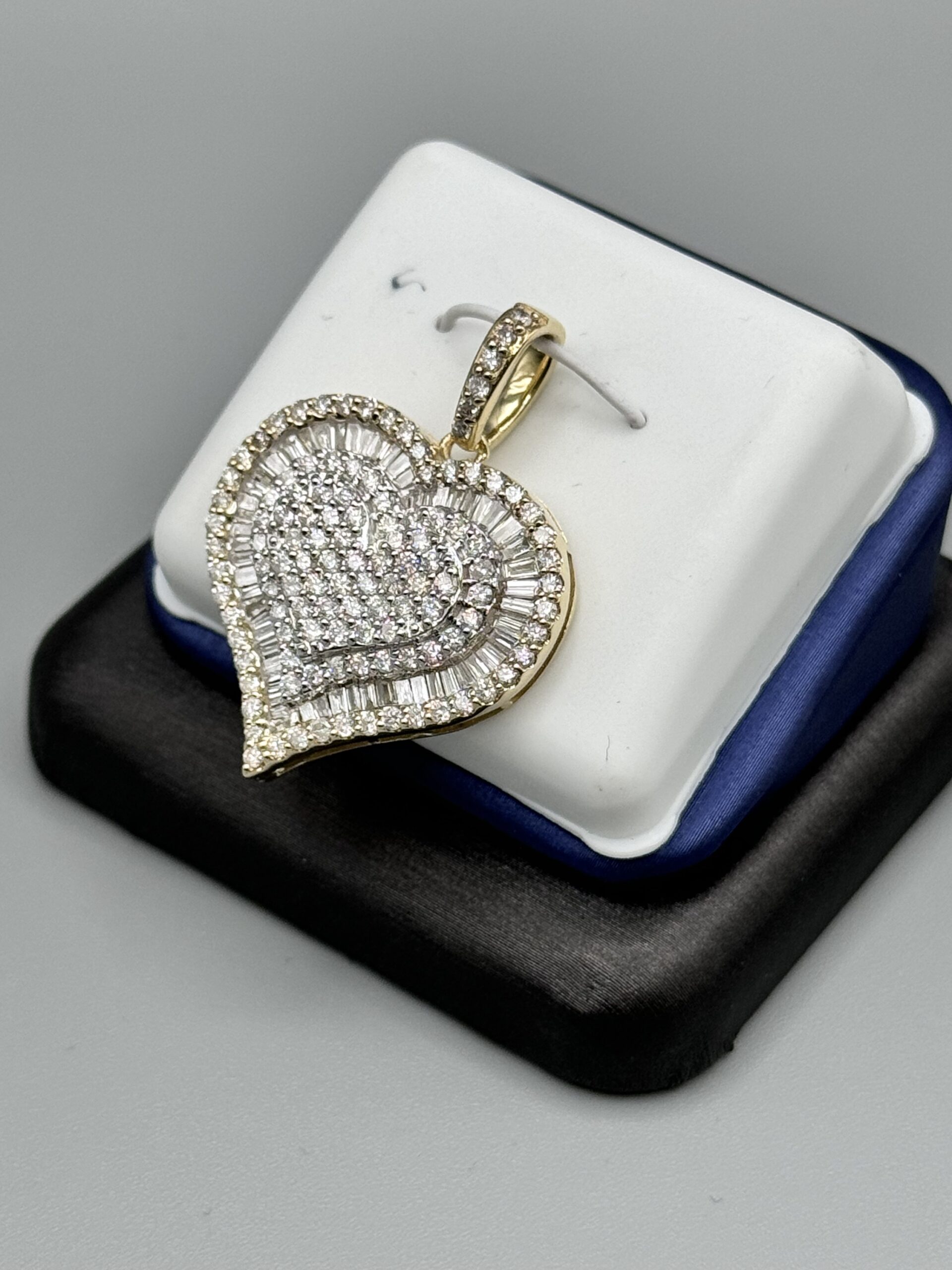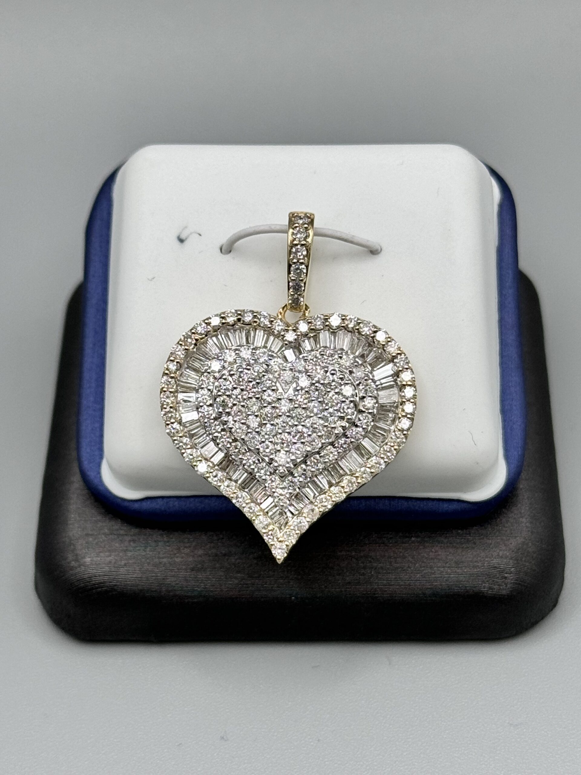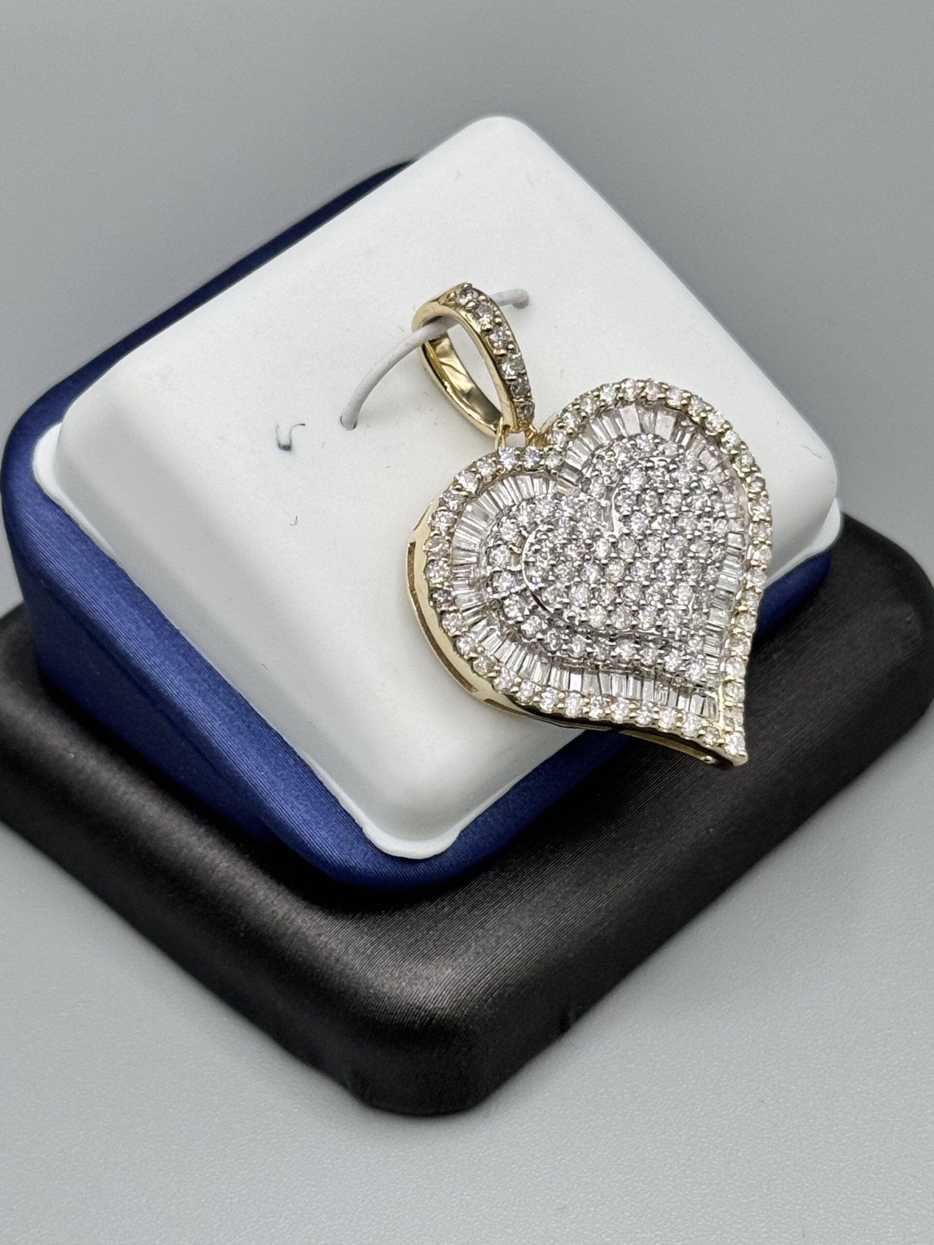10KT Gold 2.05CT Diamond Heart Pendant 1.25″ Tall By 1″ Wide All VS Clarity Baguette And Round Cut Diamonds Big Look
