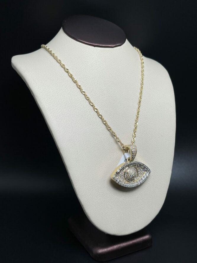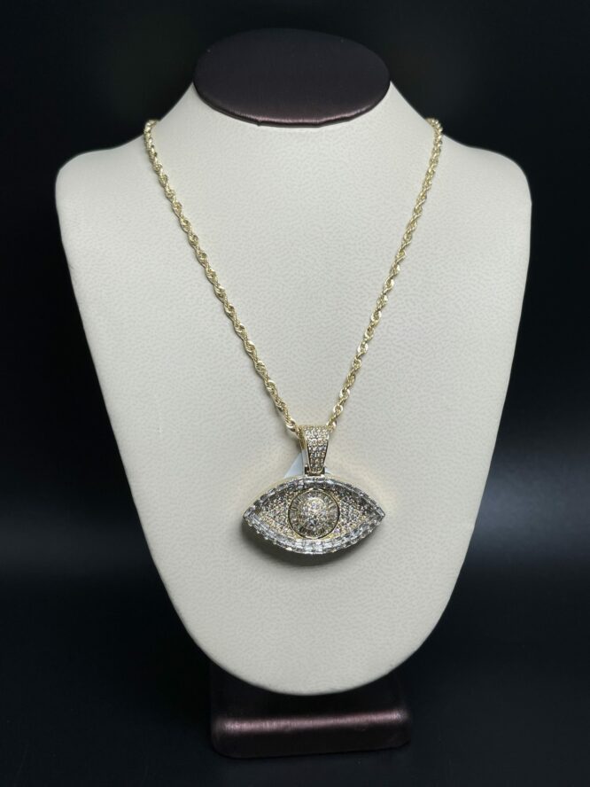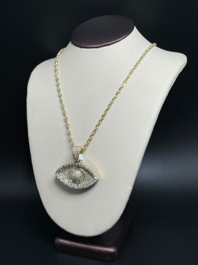 10KT Gold 2.10CT Dia Evil Eye Pendant ComboSet Comes With 10KT 20″ Rope 2.5 MM Approx Gold Weight 2.39 Grams 1.5″ Wide With Baguette Diamonds 1″ Tall Approx Gold Weight On Pendant 9.52 Grams