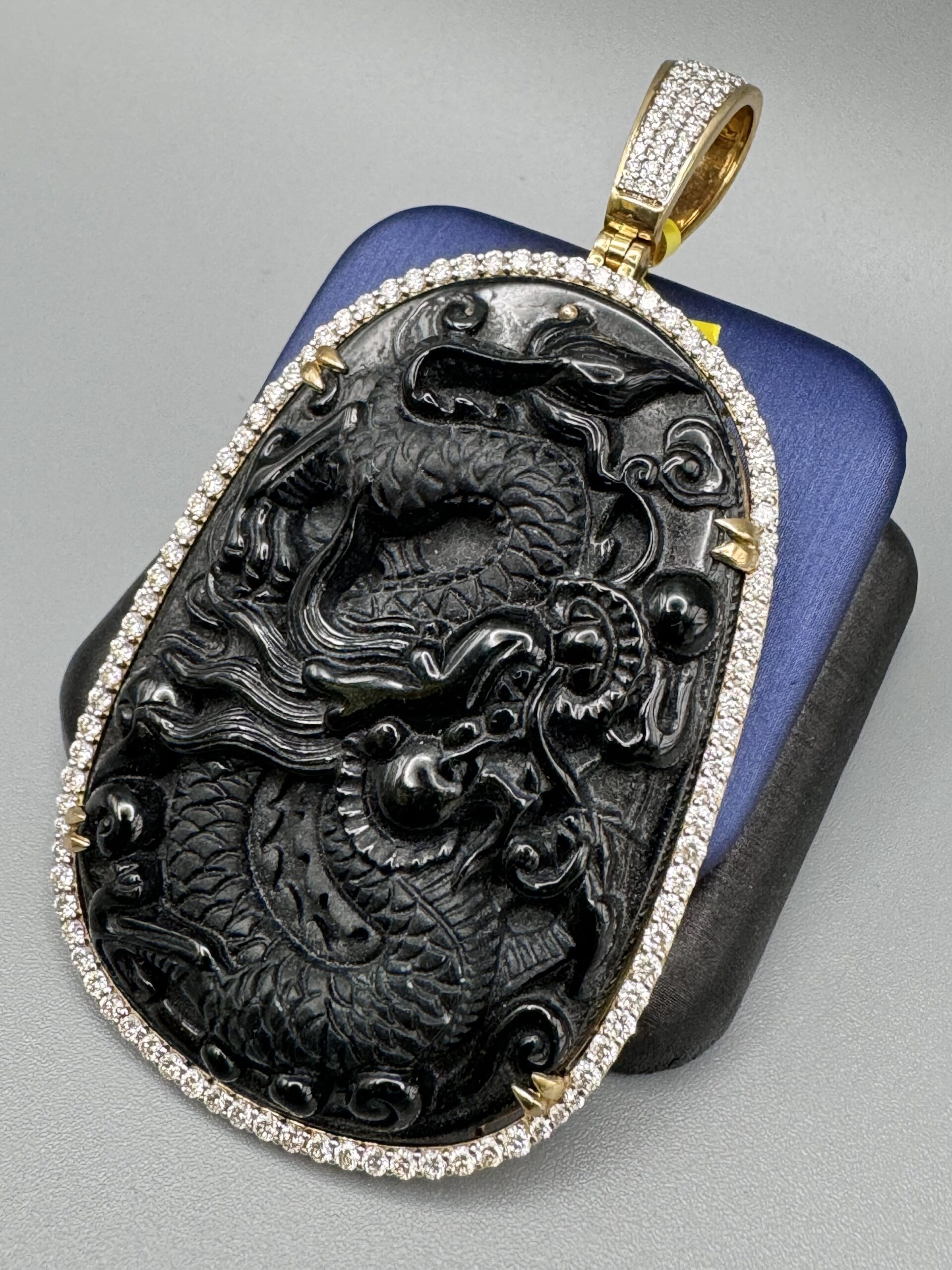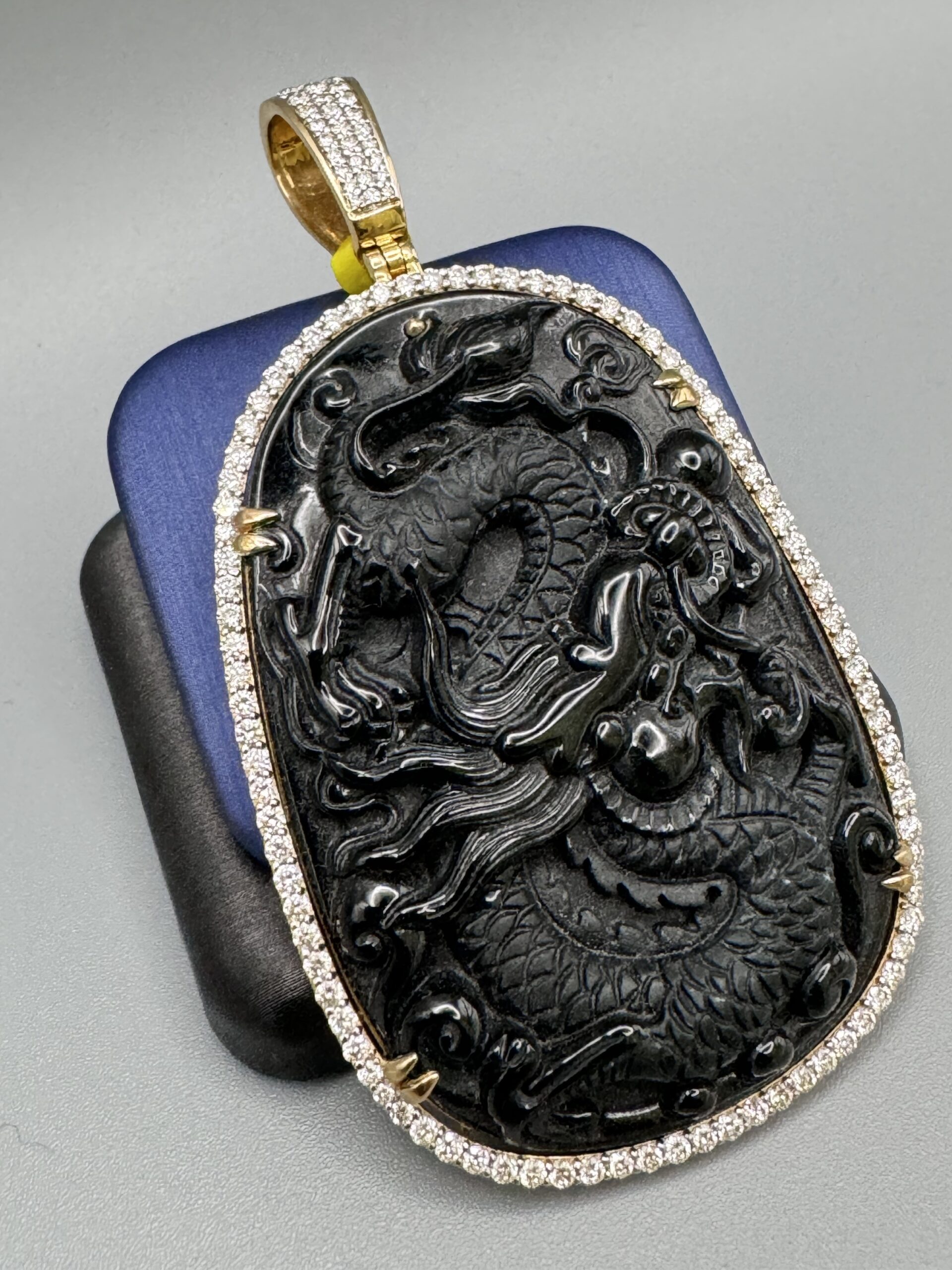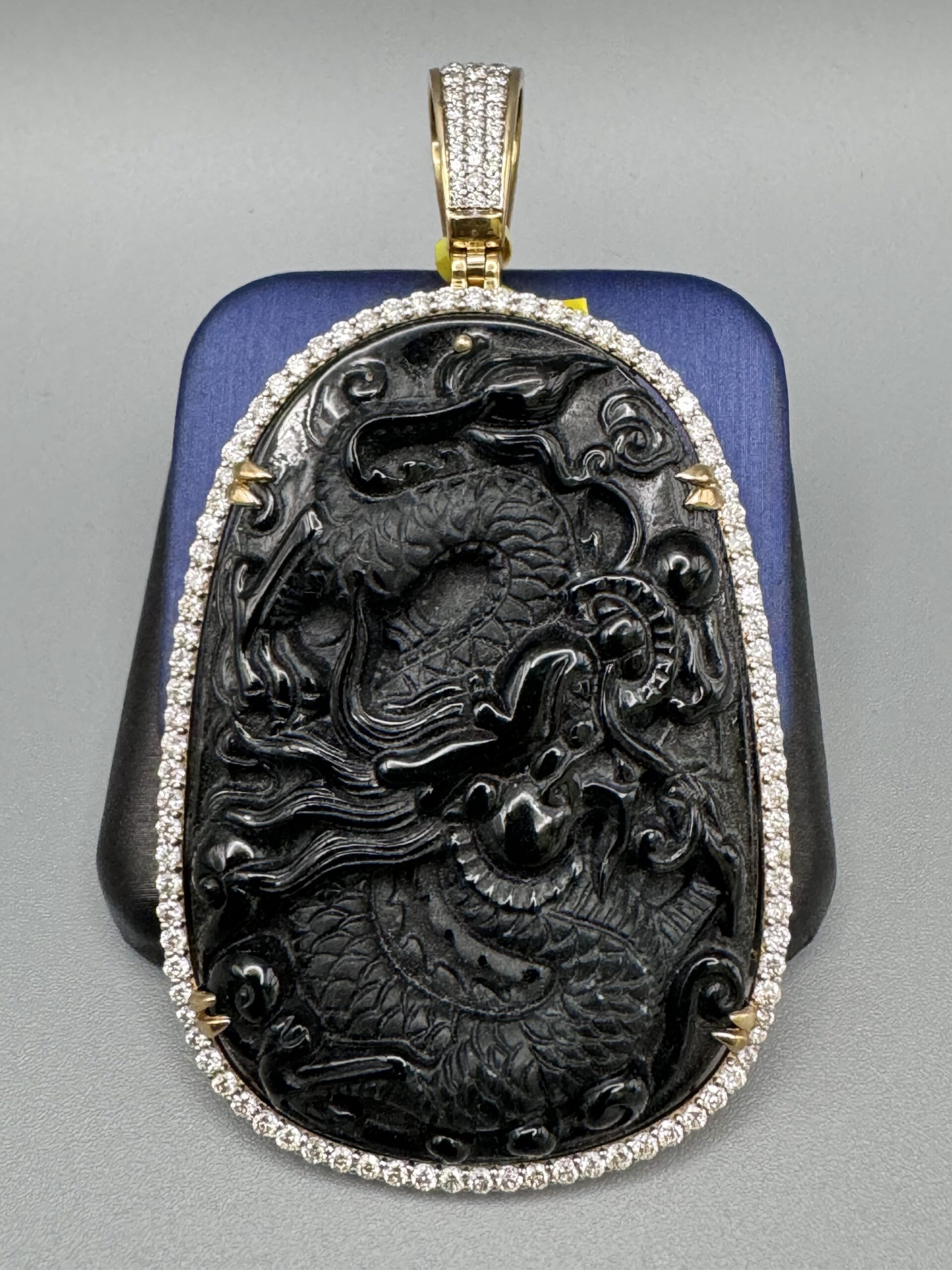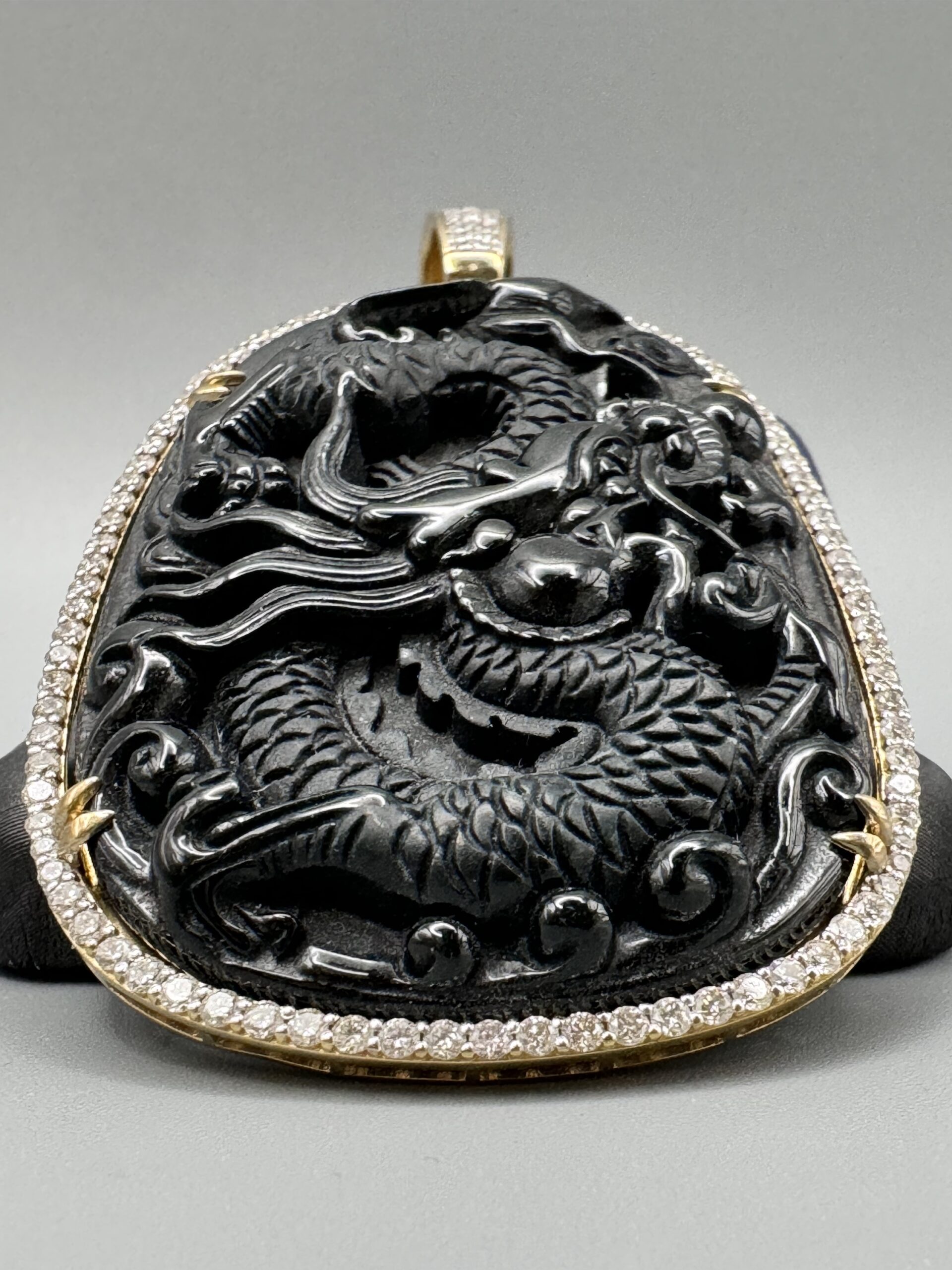 10KT Gold 2.24CT Diamond Dragon Carved Black Jade Pendant Aka Obsidian Carved 3.25″ Tall By 1.75″ Wide All True VS Quality Diamond Big Opening Diamond Bell Approx Weight 32.4 Gram