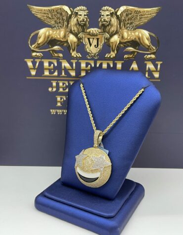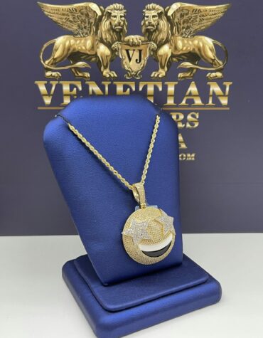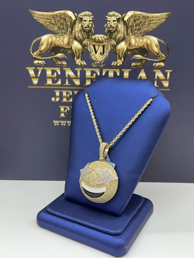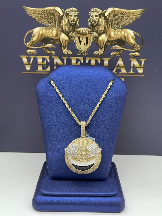 10KT Gold 2.60CT Diamond Star Face Smily Emoji Pendant ComboSet 1.75″ Tall Includes Bell By 1.25″ Wide All Around Approx Gold Weight 10.34 Gram Comes With 10Kt 2.5MM Rope Necklace 22″ Approx Gold Weight 2.79 Grams