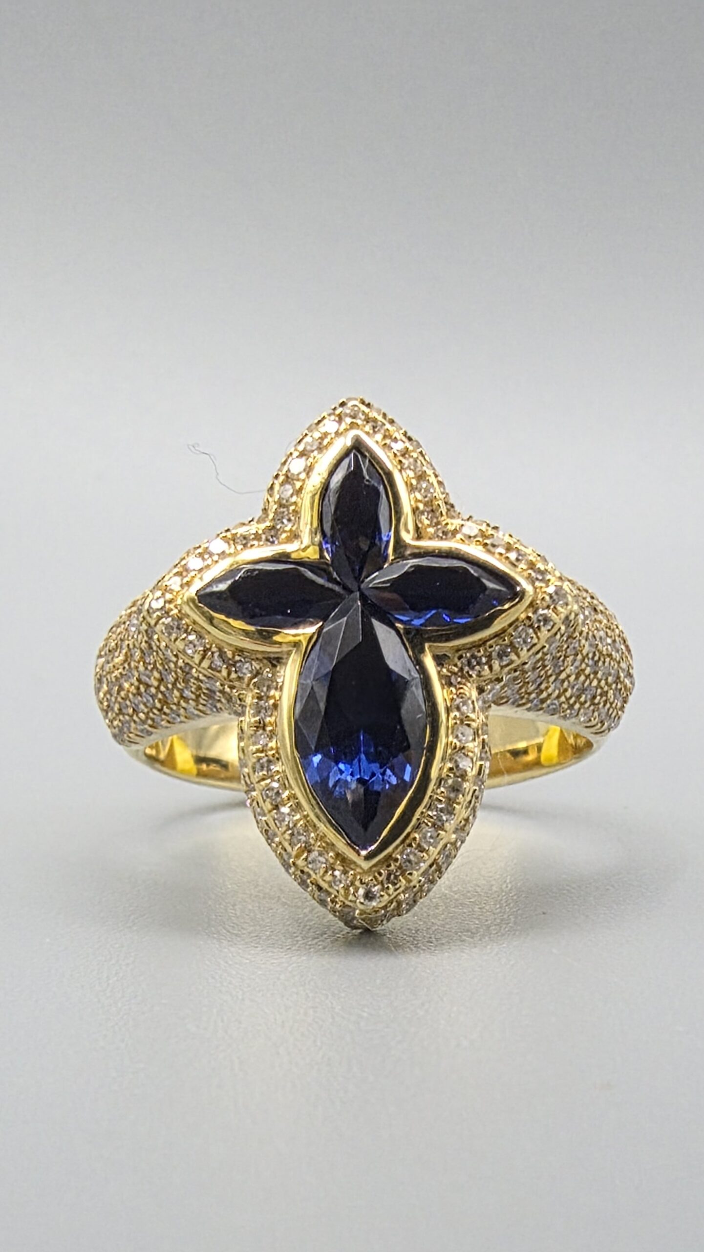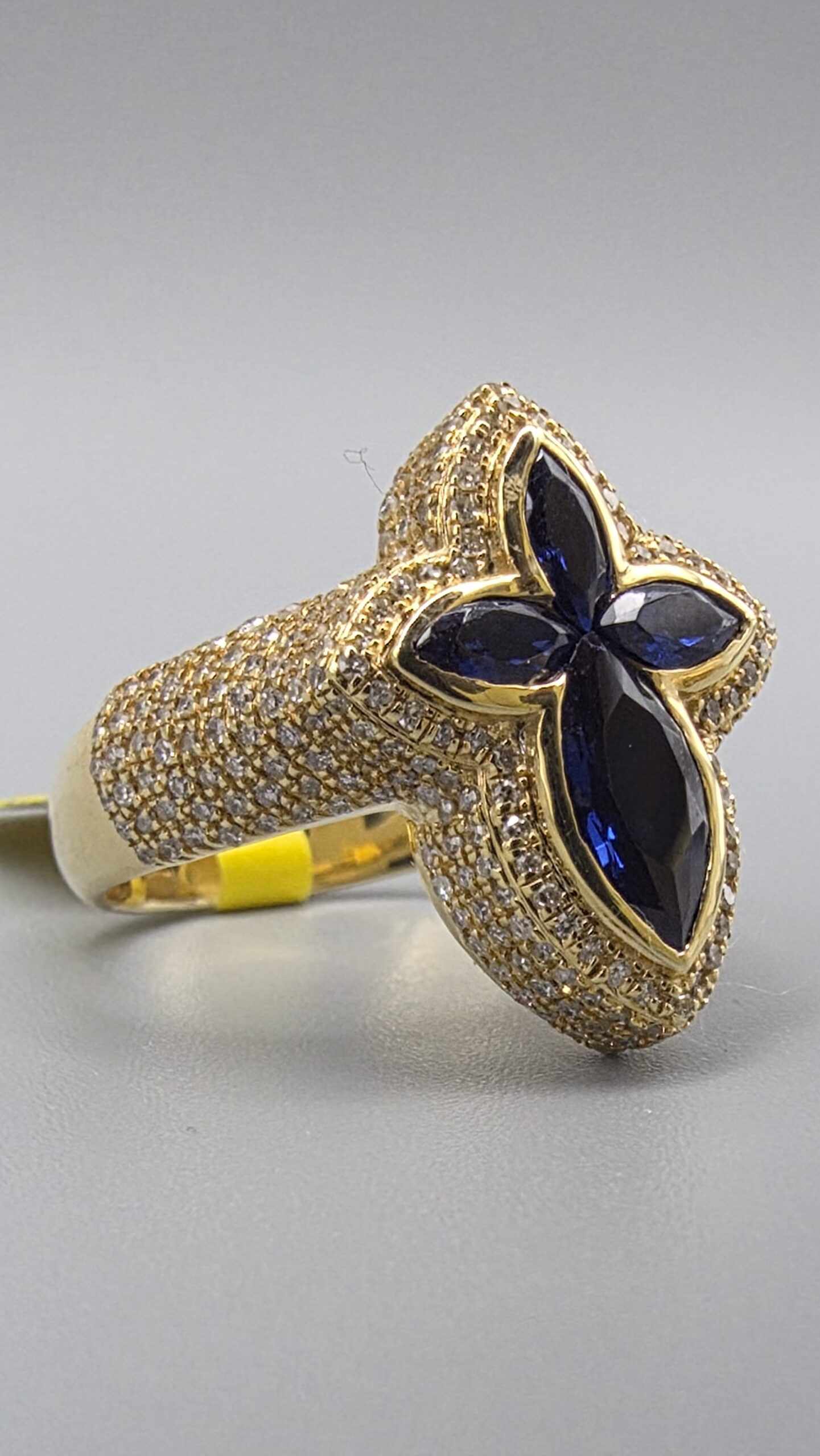 Shine brighter than your ex with this stunning 10KT Gold Cross Ring, featuring 2.72CT of diamonds and dazzling blue sapphires. Size 10 with sizing available. Weighs 9.6 grams, all natural elegance!