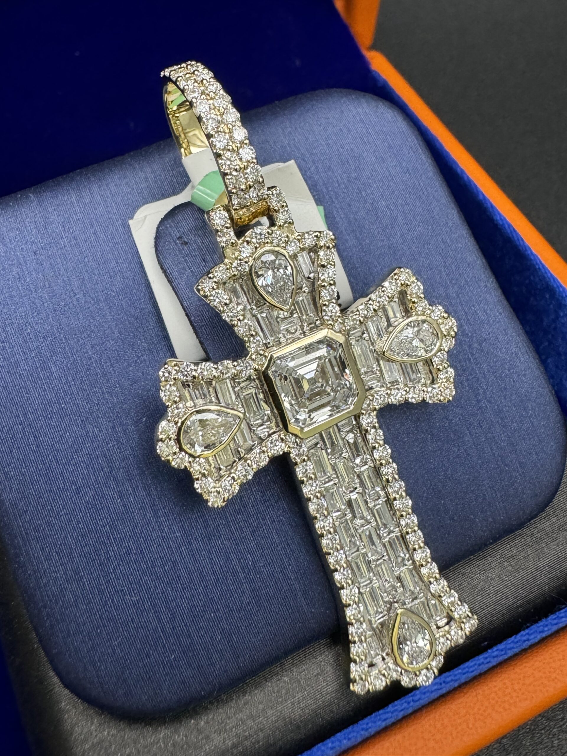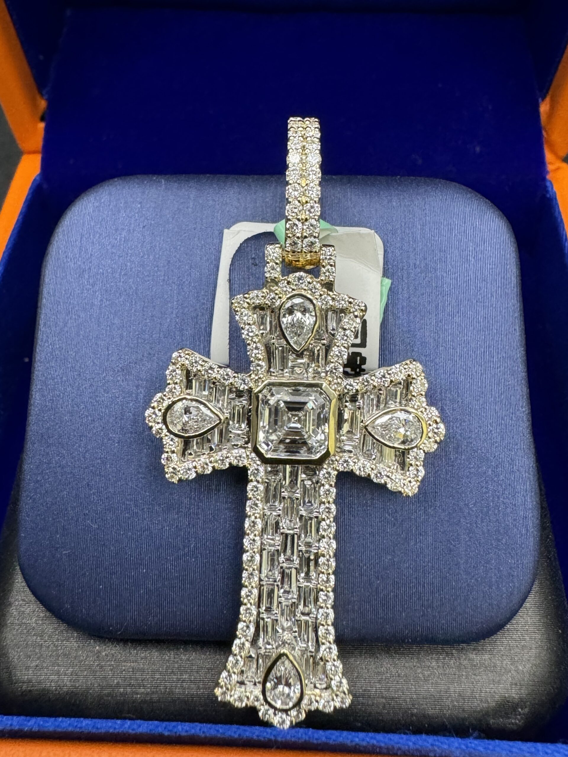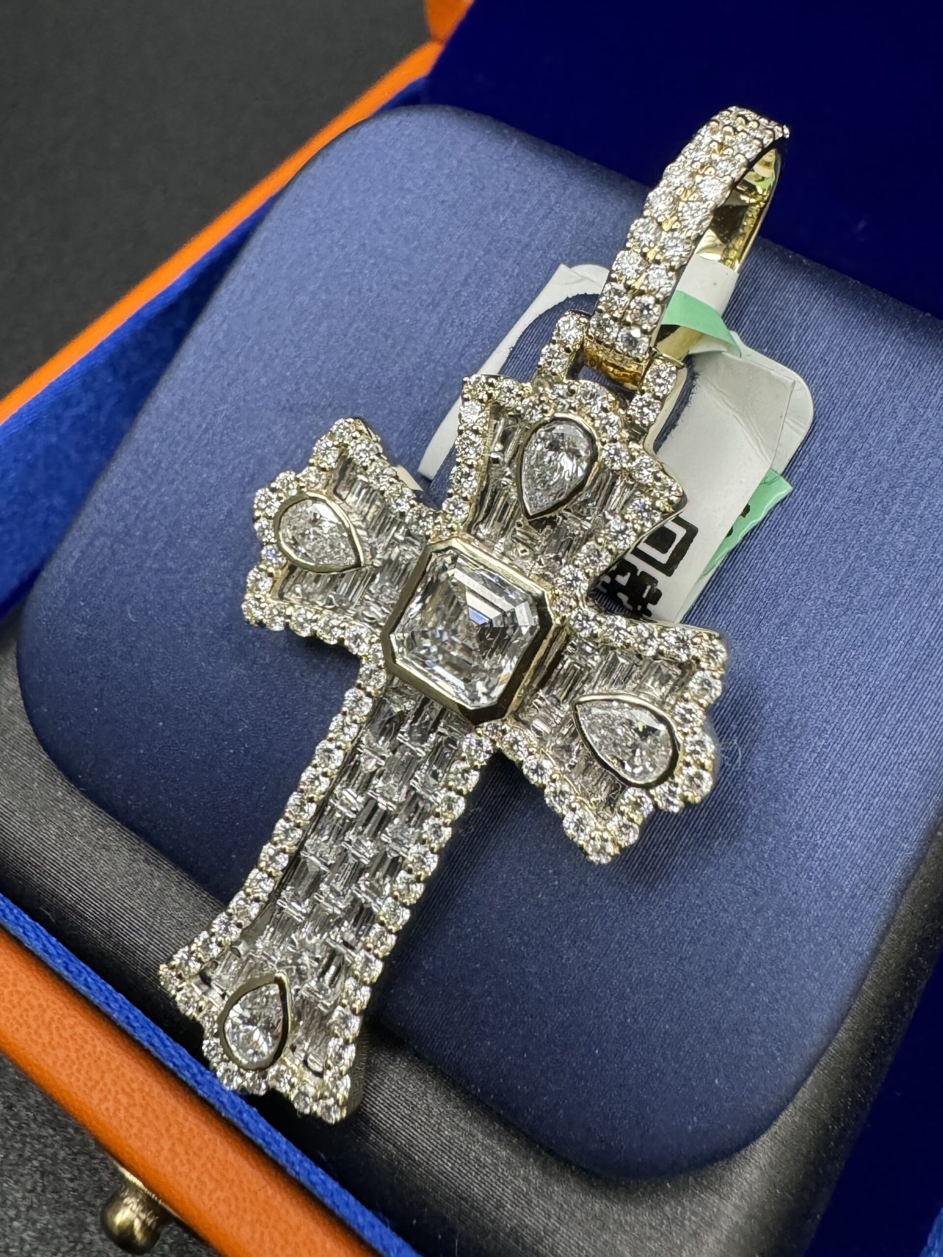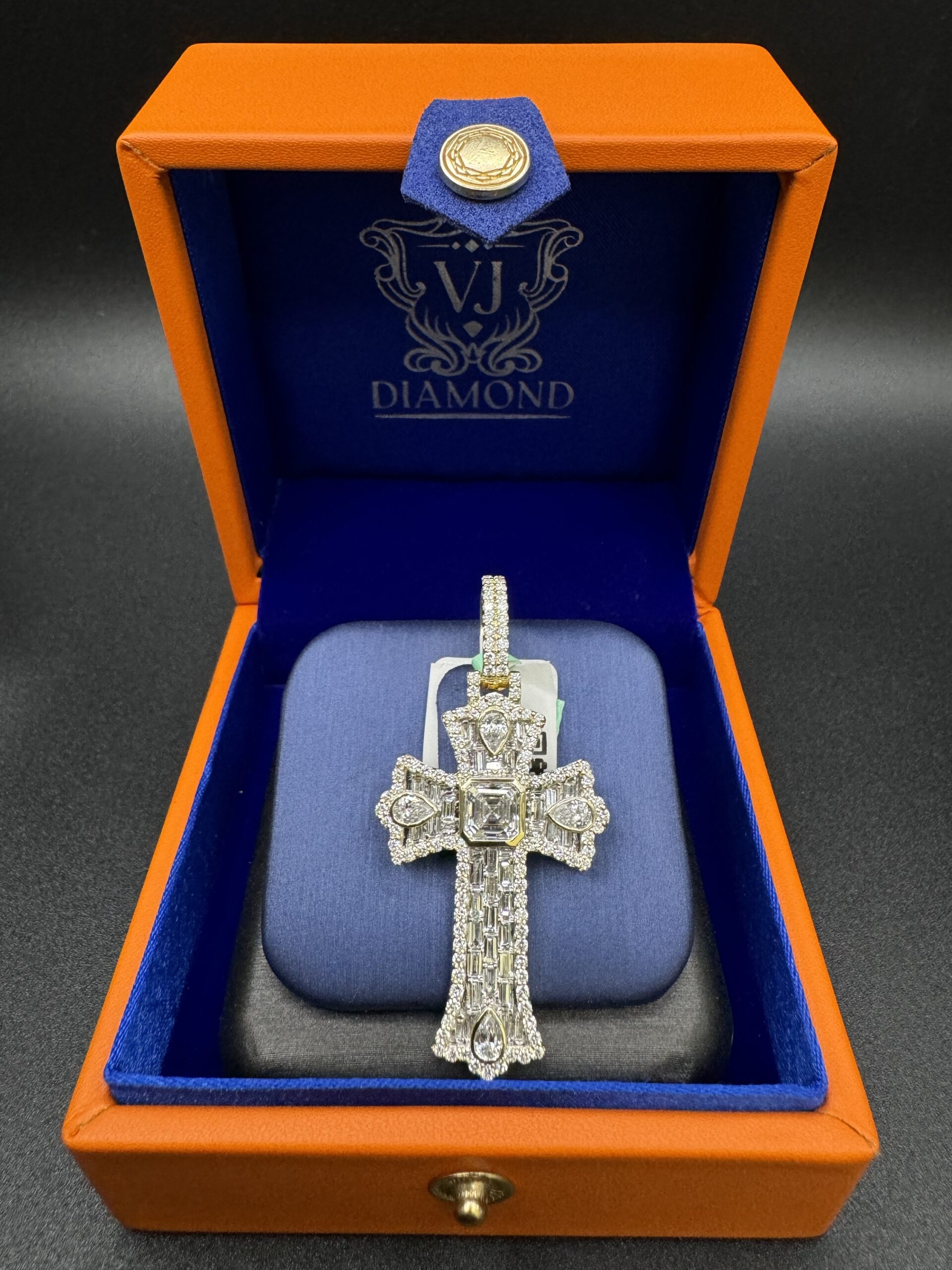 10KT Gold 3.39CT LGD Diamond Cross Pendant 2″ Tall By 1″ Wide CushionCut Solitaire In Middle Pear Shapes On Side With Baguette Diamonds Approx Gold Weight 6.6 Gram VVs Clarity