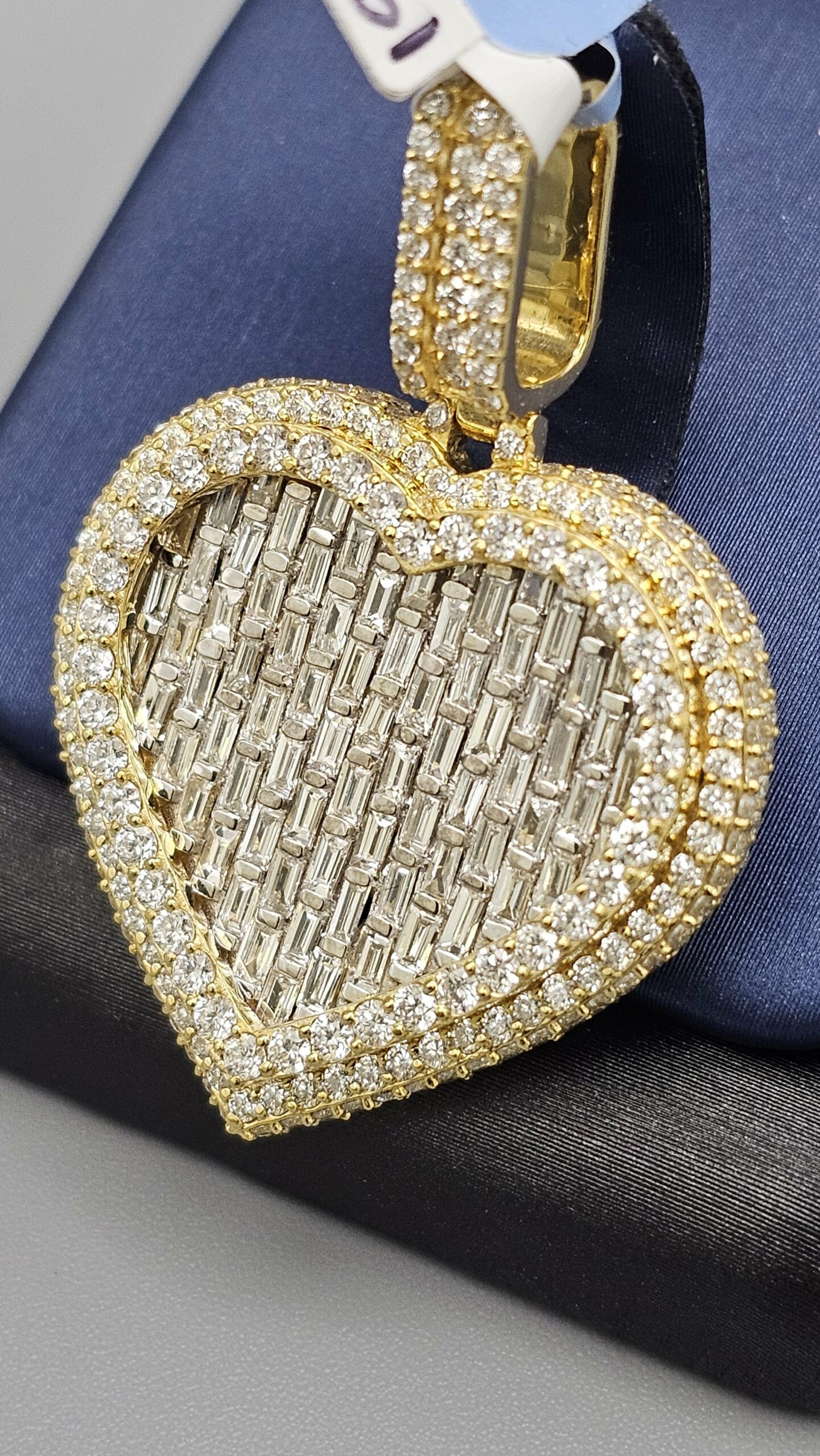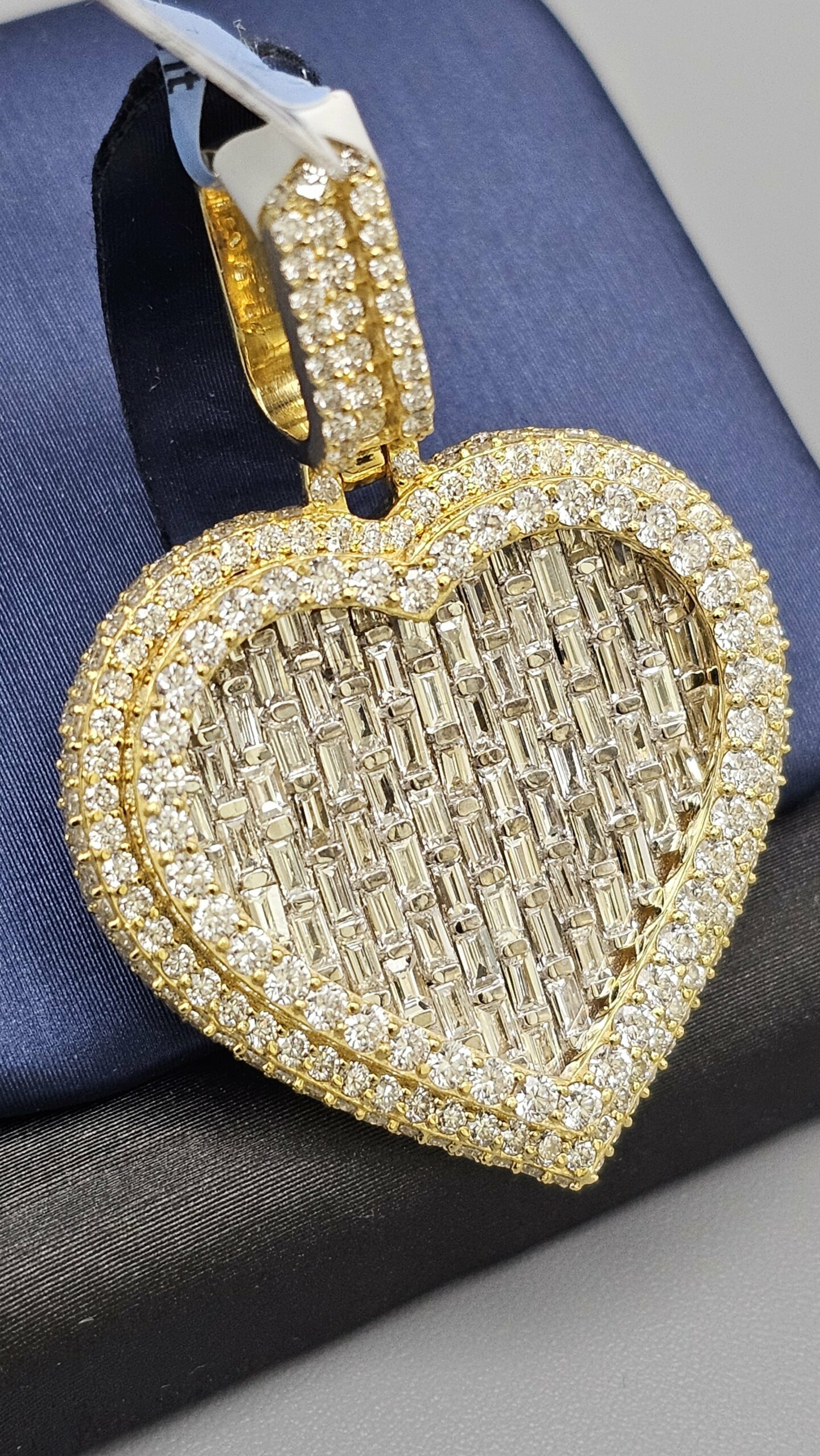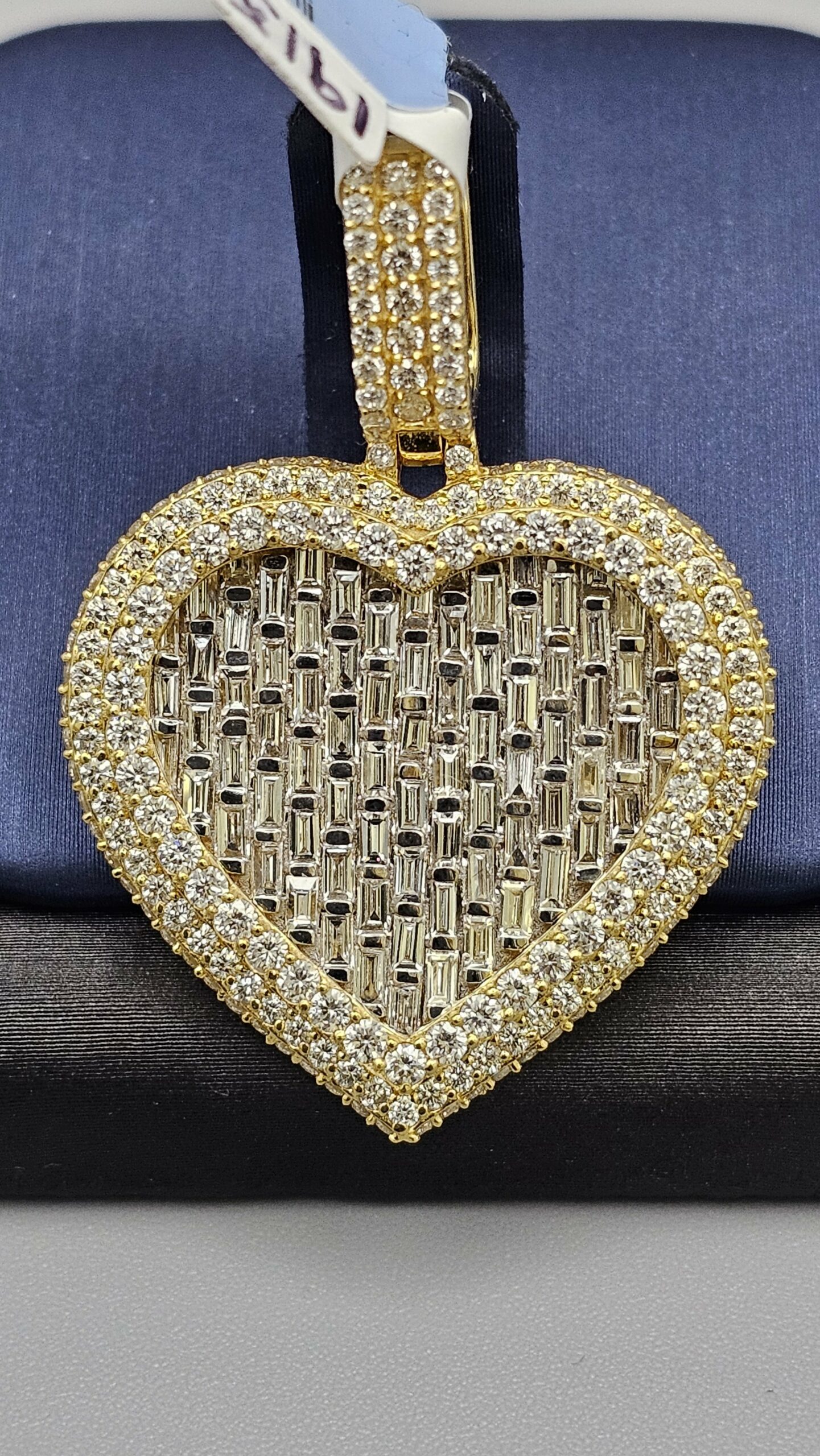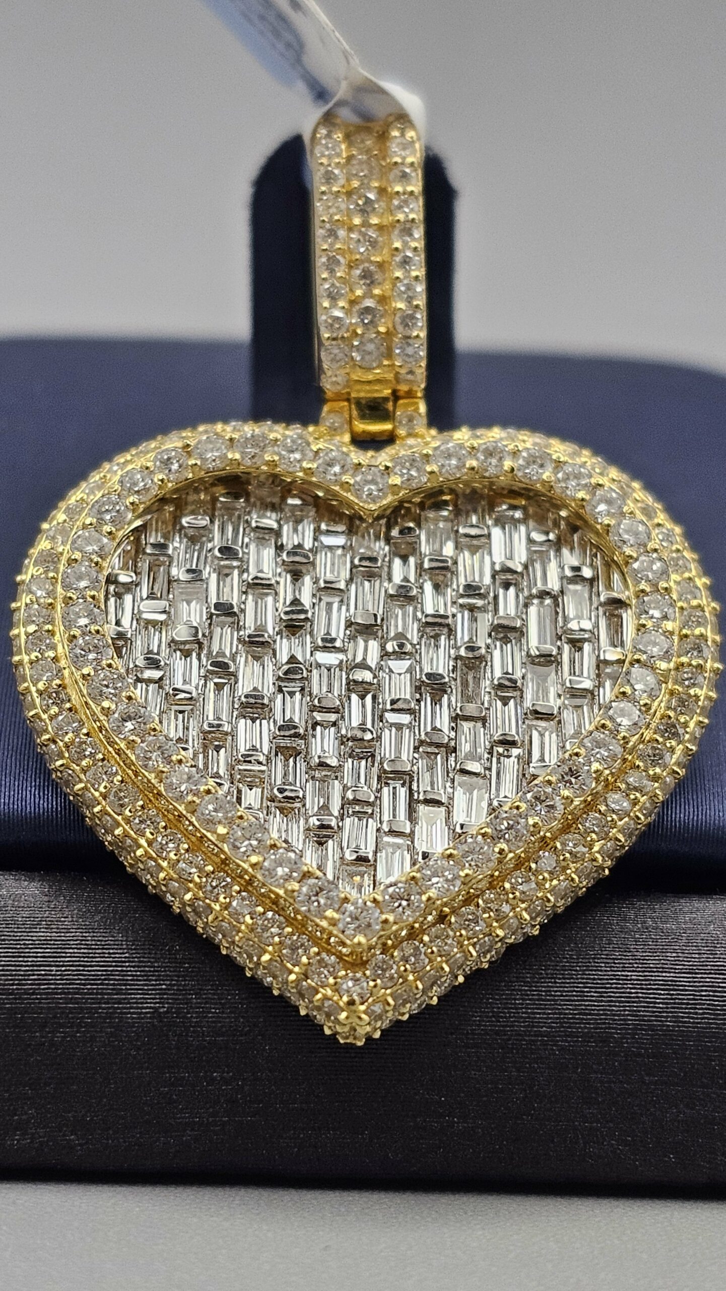 Adorn yourself with elegance with this stunning 10KT gold heart pendant featuring 3.76CT of VVS clarity emerald cut diamonds. A perfect blend of luxury and love, it weighs 10 grams and measures 1.5″ tall.