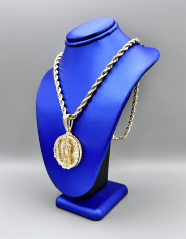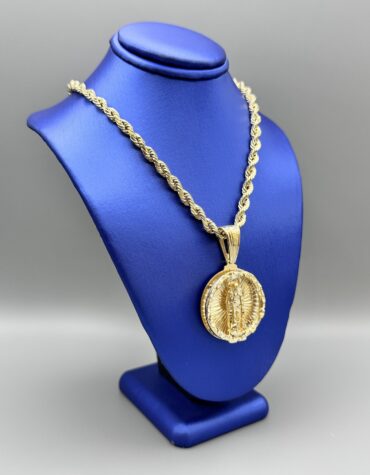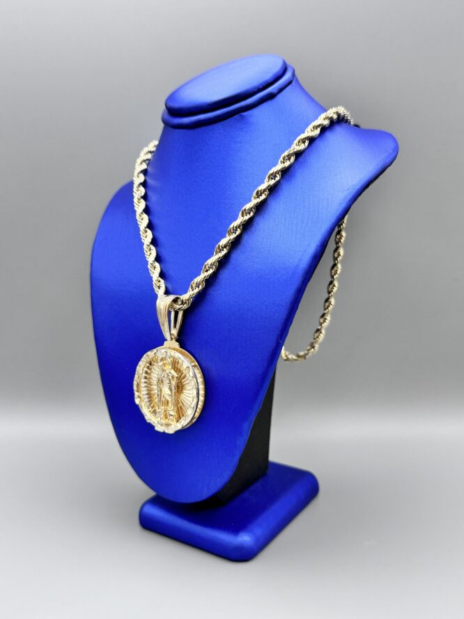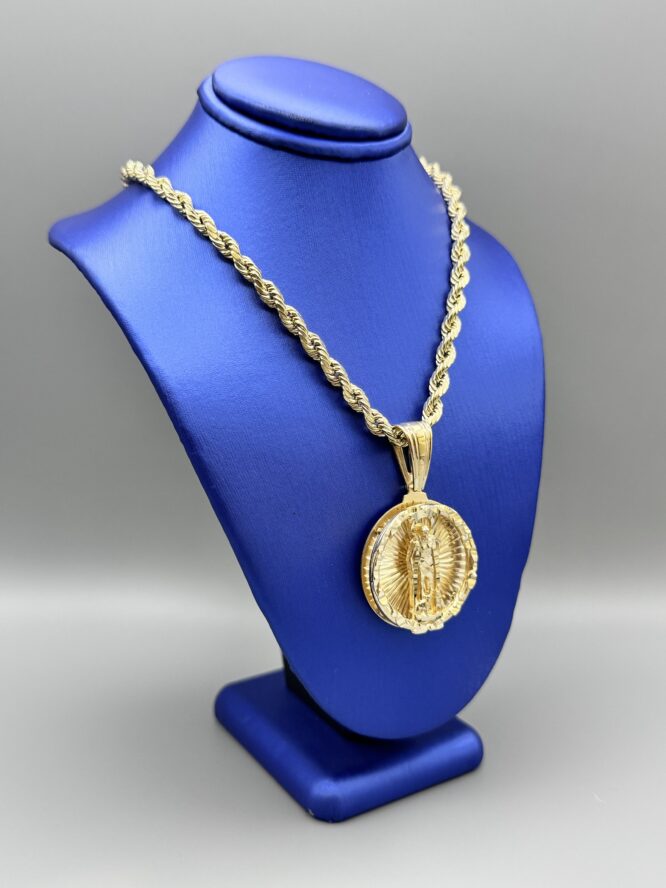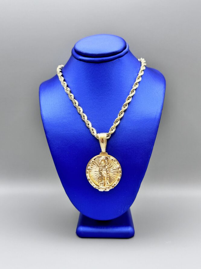 10KT Gold 3D Solid Small St.Lazaro Pendant ComboSet Comes With 5MM 20″ Rope Necklace Pendant 2″ Tall Includes Bell 1.25″ Round Approx Gold Weight of Necklace 8.0 Gram Pendant 12.6 Gram