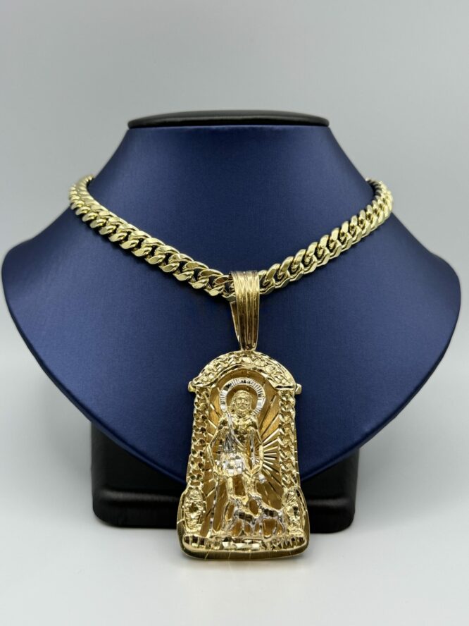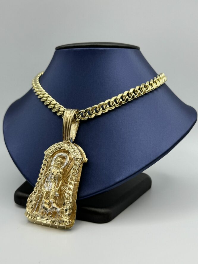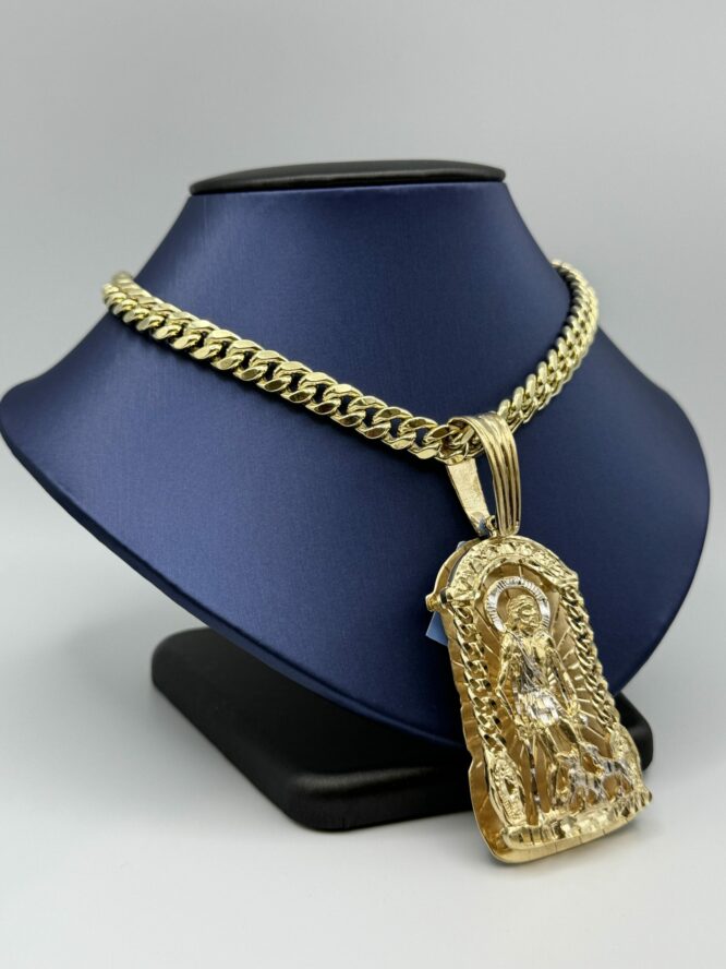 10KT Gold 3D St.Lazaro Pendant ComboSet Comes With 9MM 10KT Gold MiamiCuban Necklace 22″ Approx Gold Weight 43.9 Gram Pendant 3.5″ Tall By 1.5″ Wide Approx Gold Weight 41.6 Gram