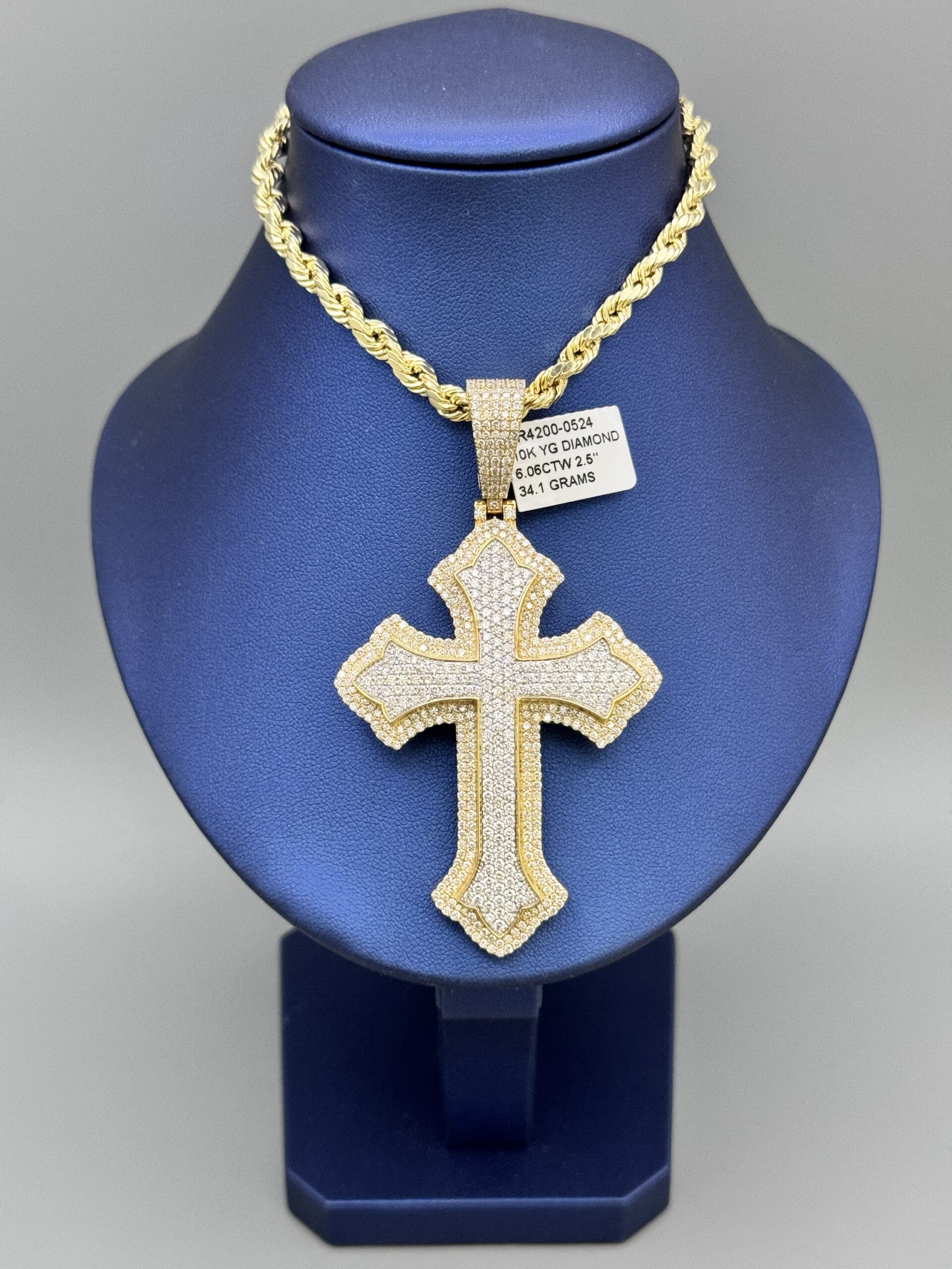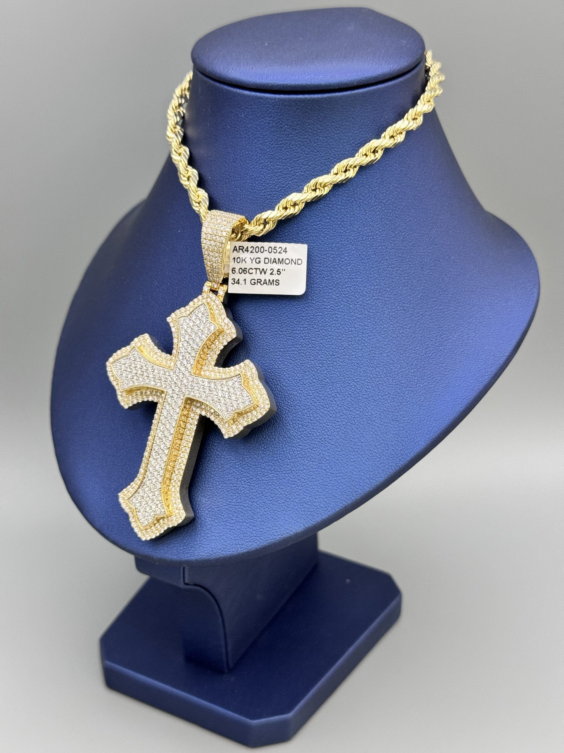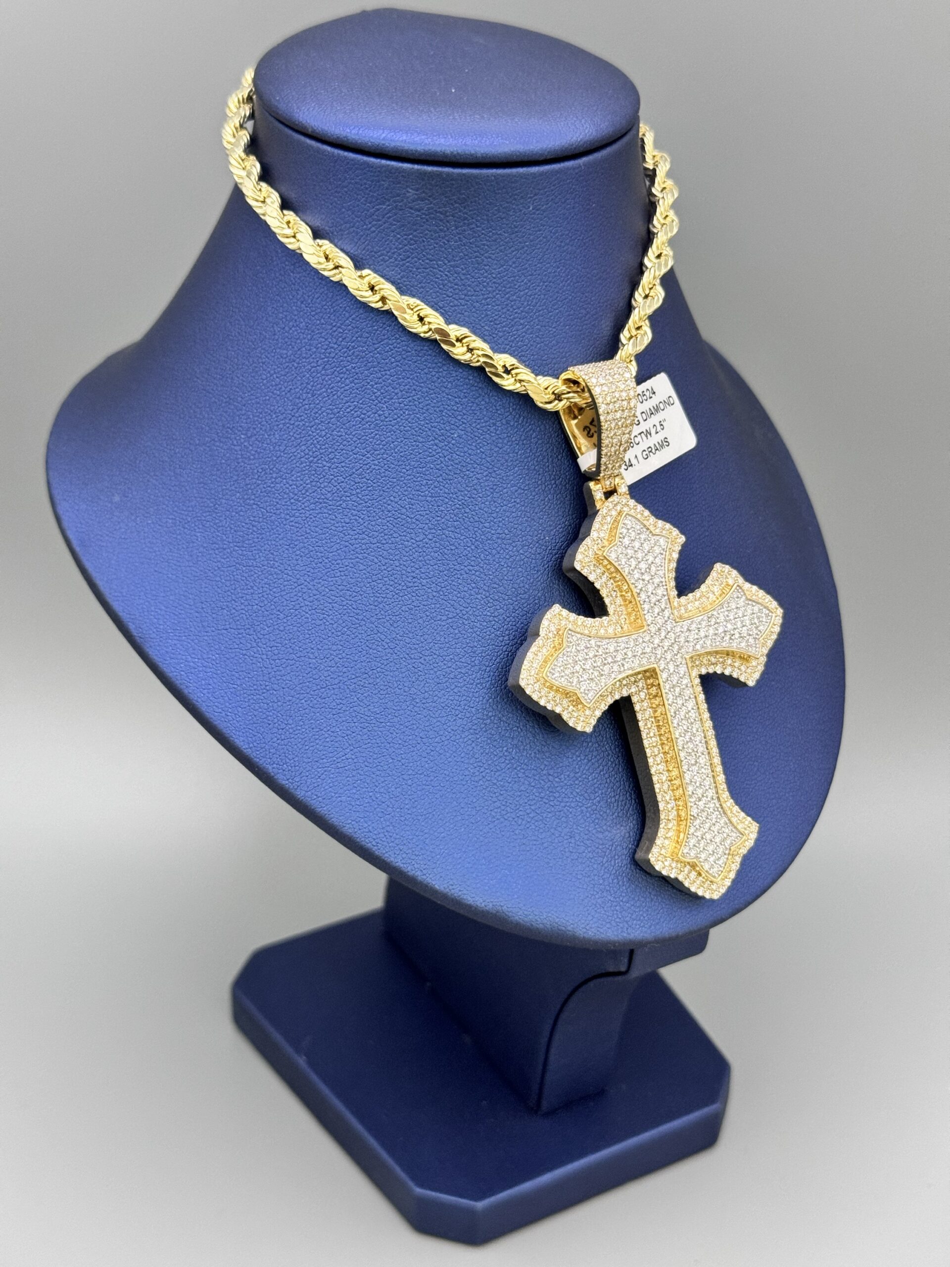 10KT Gold 6.06CT Diamond Solid cross Pendant ComboSet Comes With 10Kt Gold Rope 5MM 20″ Approx Gold Weight 8.2 Gram Pendant 3” Tall By 2″ Wide All VS Double Layered Approx Gold Weight 34.1 Gram