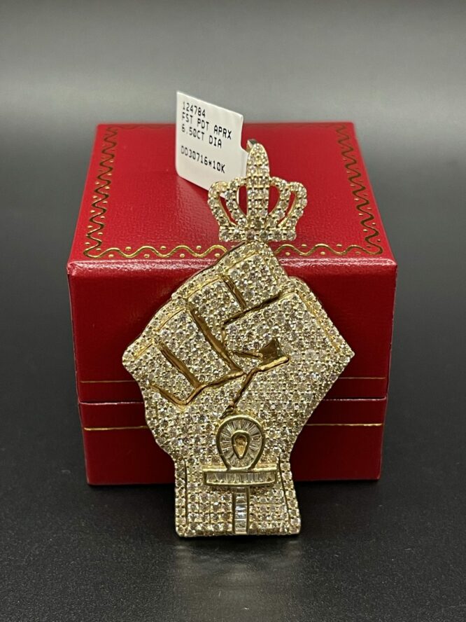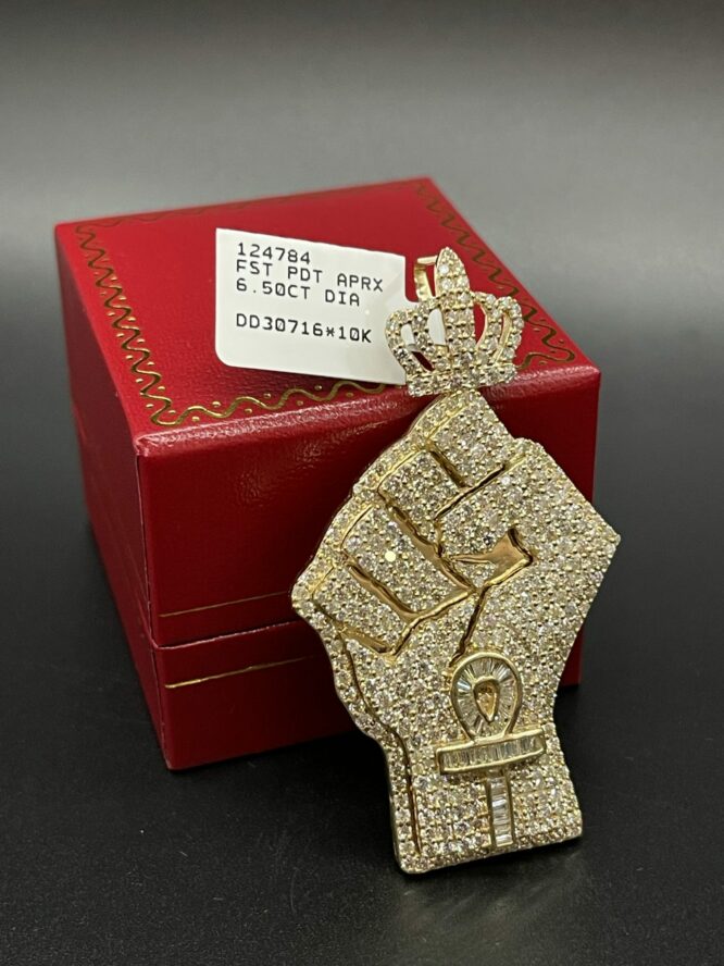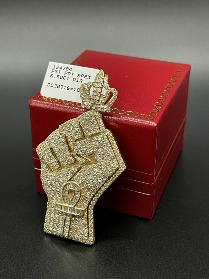 10KT Gold 6.50CT Diamond Fist Pendant With Ankh Cross And Crown Bell 2.5 Inches Tall Solid Gold Back Custom Made