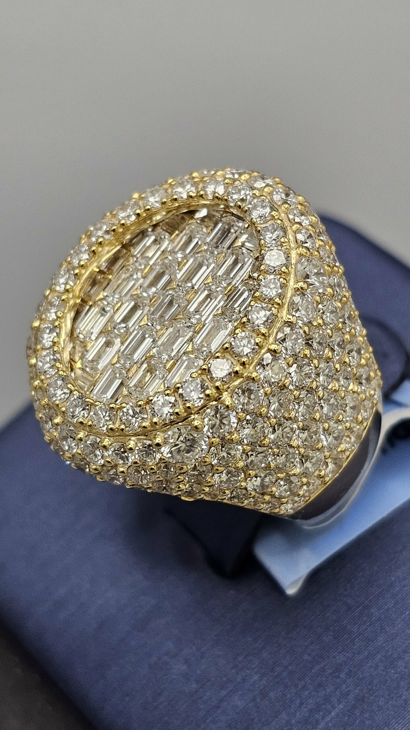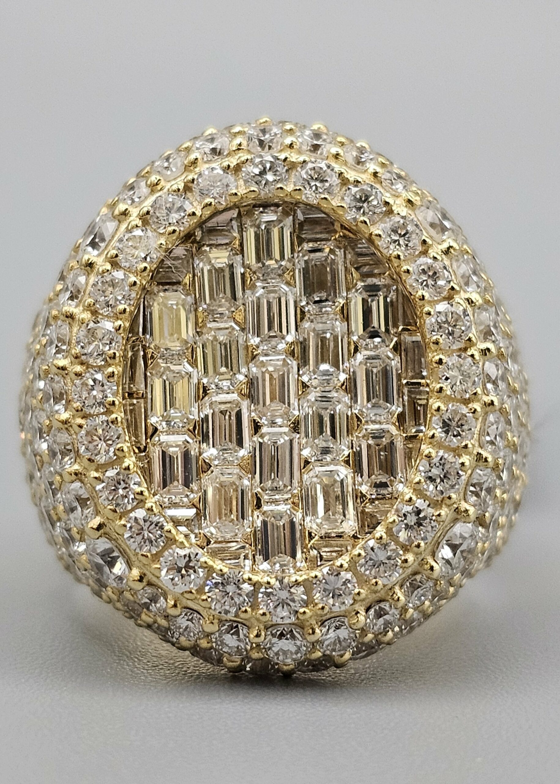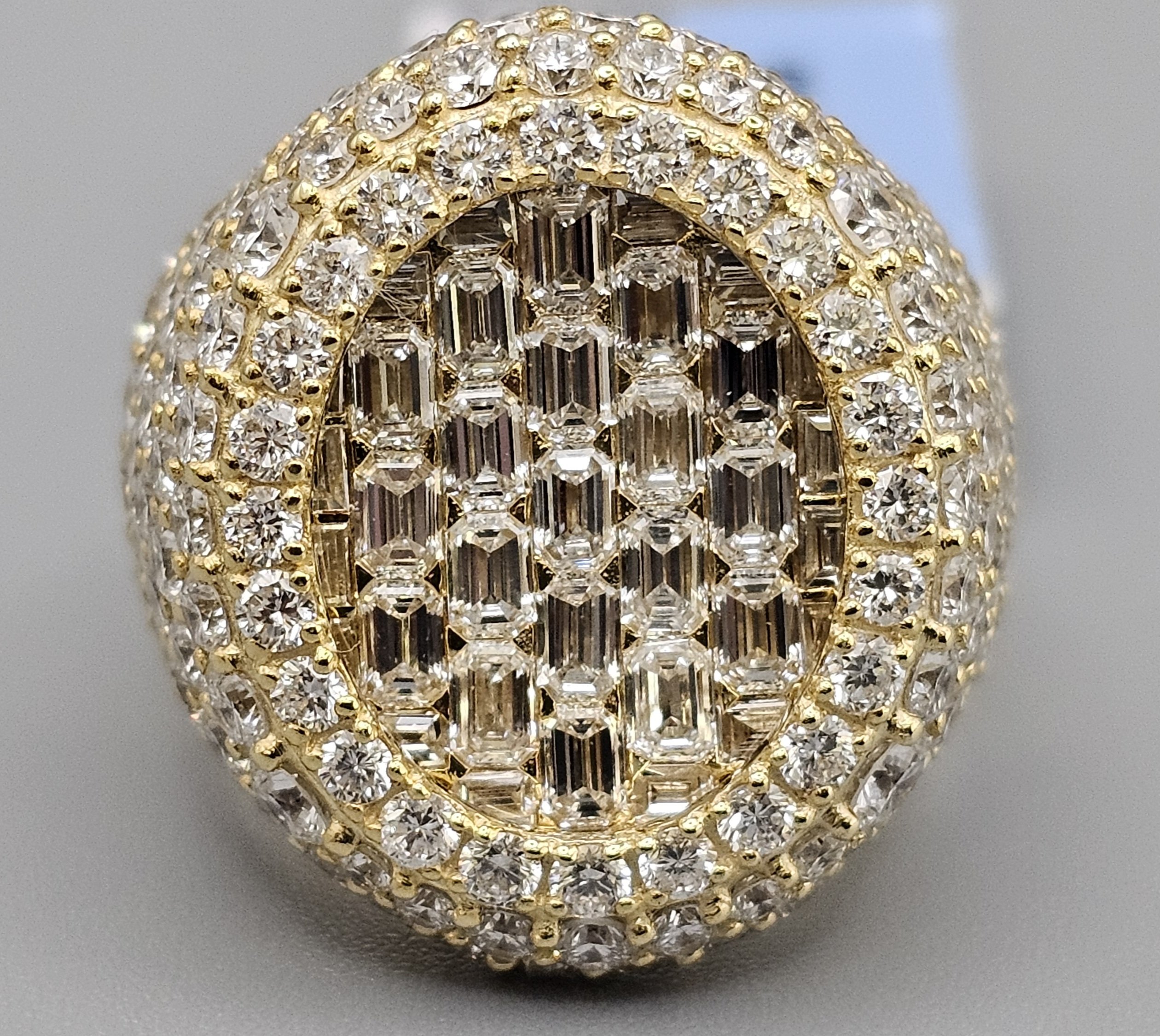 This stunning 10KT gold men’s ring features 7.16CT of VVS quality diamonds in a unique honeycomb setting, complemented by emerald cut stones. Weighing approximately 17.4 grams, it’s a stylish addition to any collection.