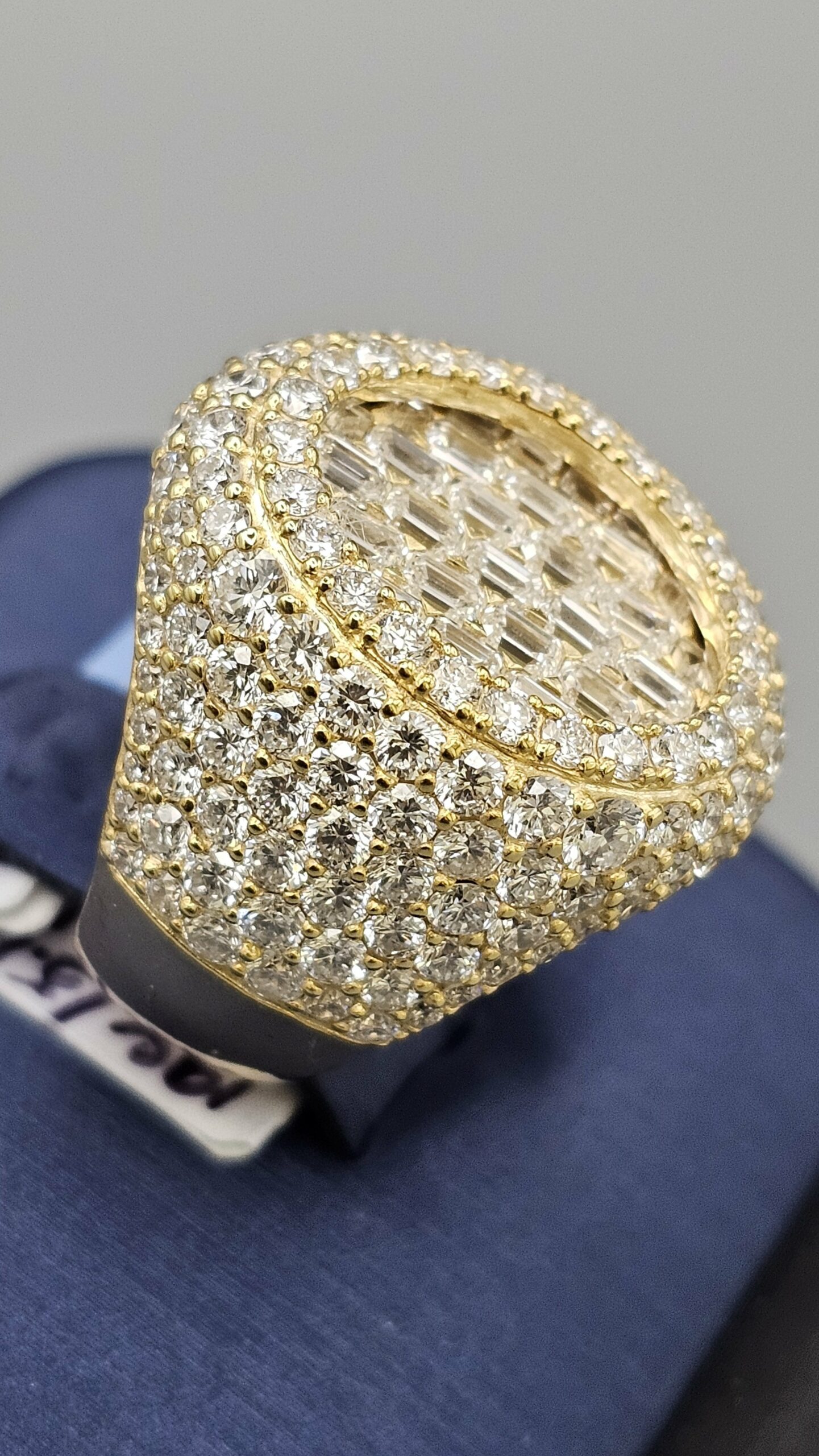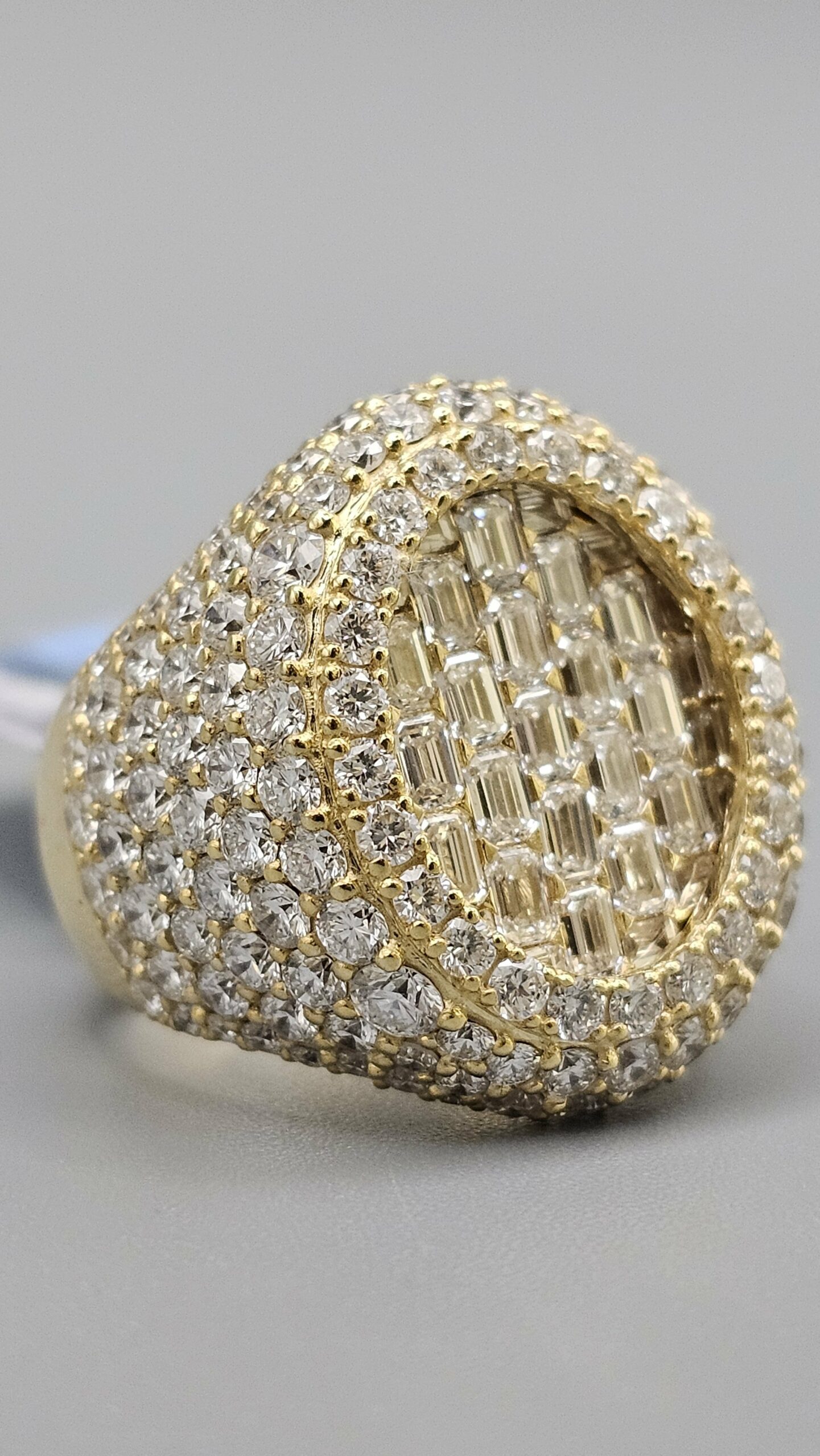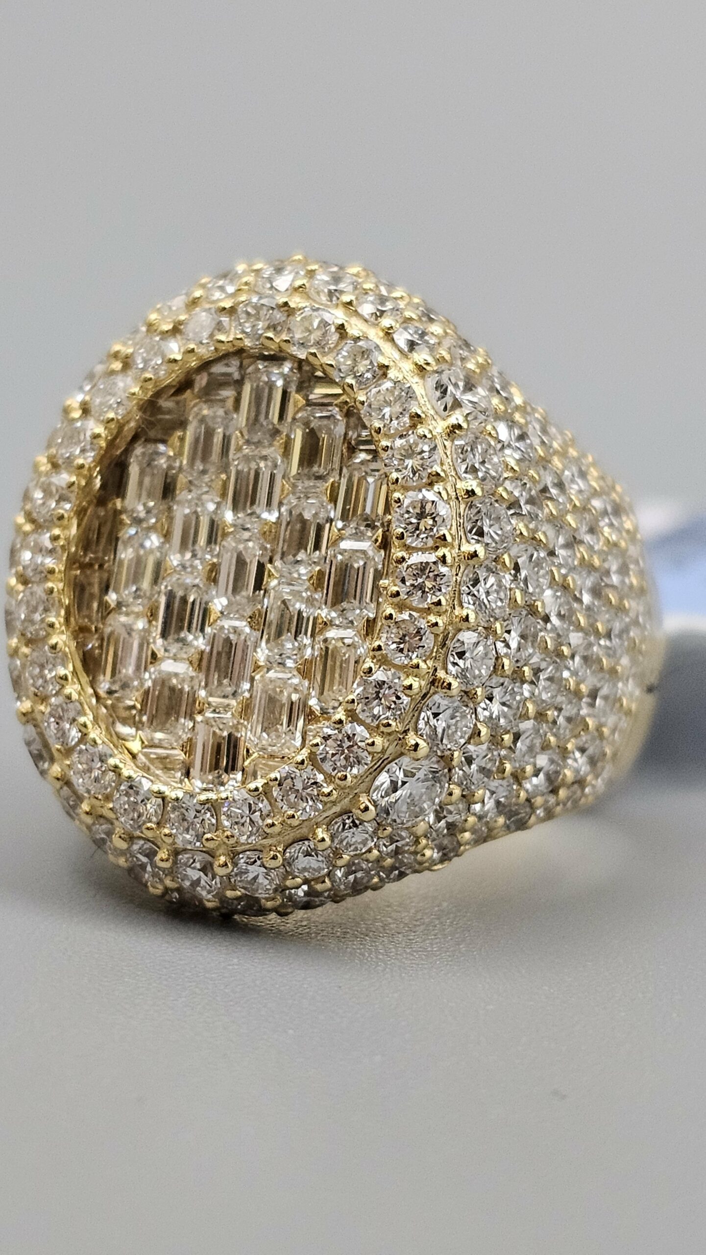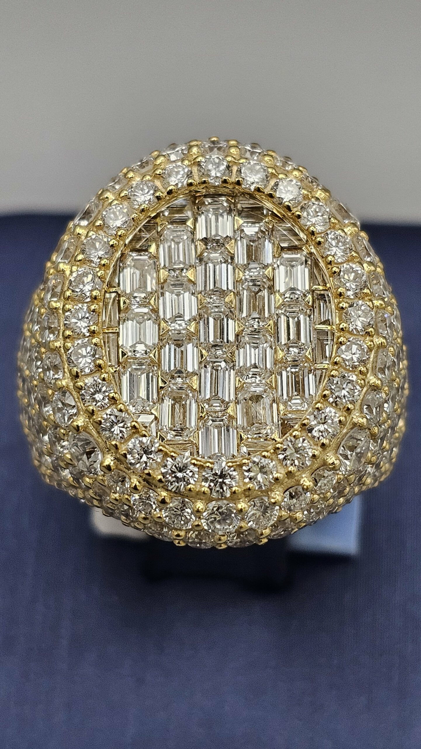 This stunning 10KT gold men’s ring features 7.16CT of VVS quality diamonds in a unique honeycomb setting, complemented by emerald cut stones. Weighing approximately 17.4 grams, it’s a stylish addition to any collection.