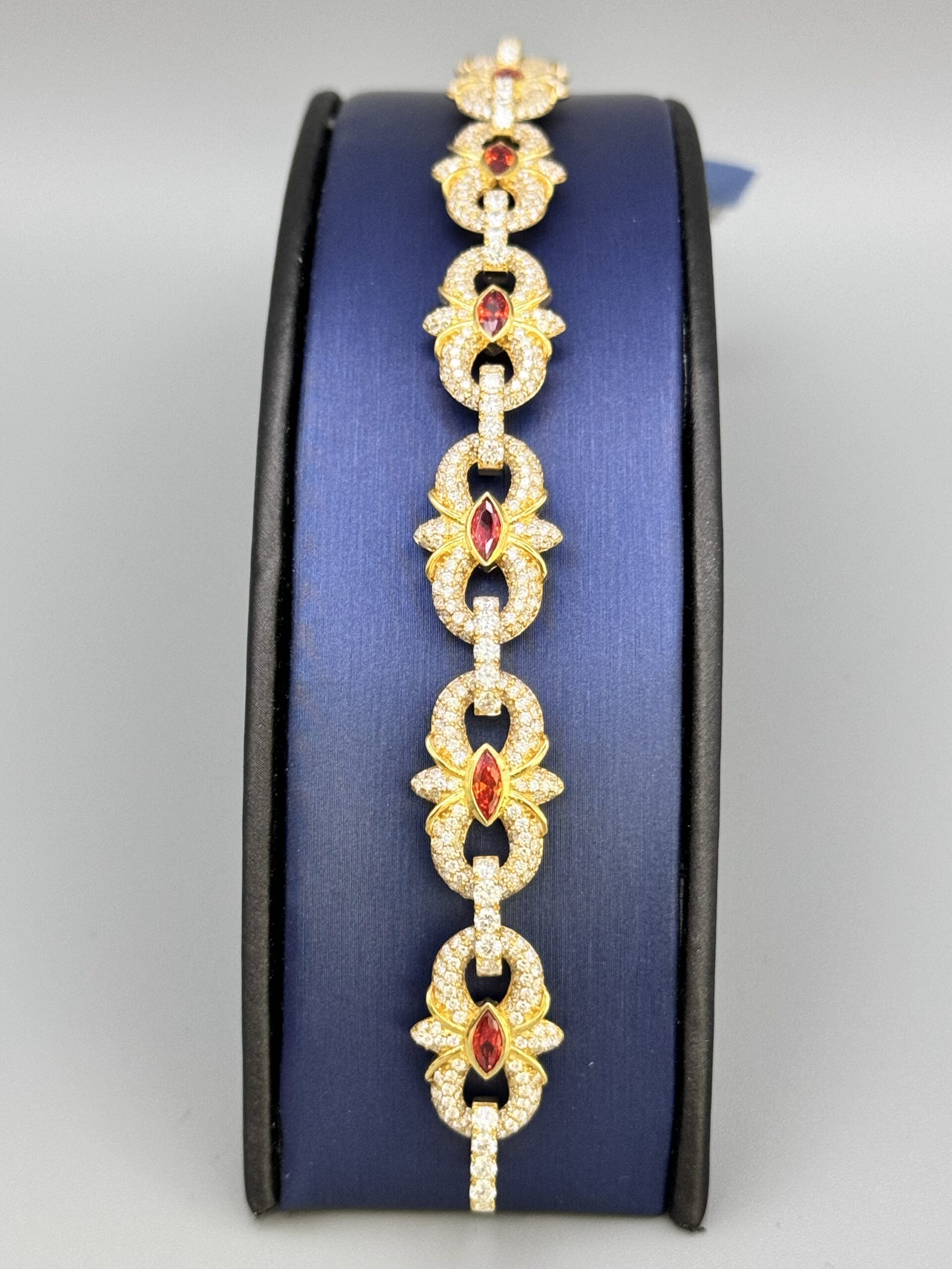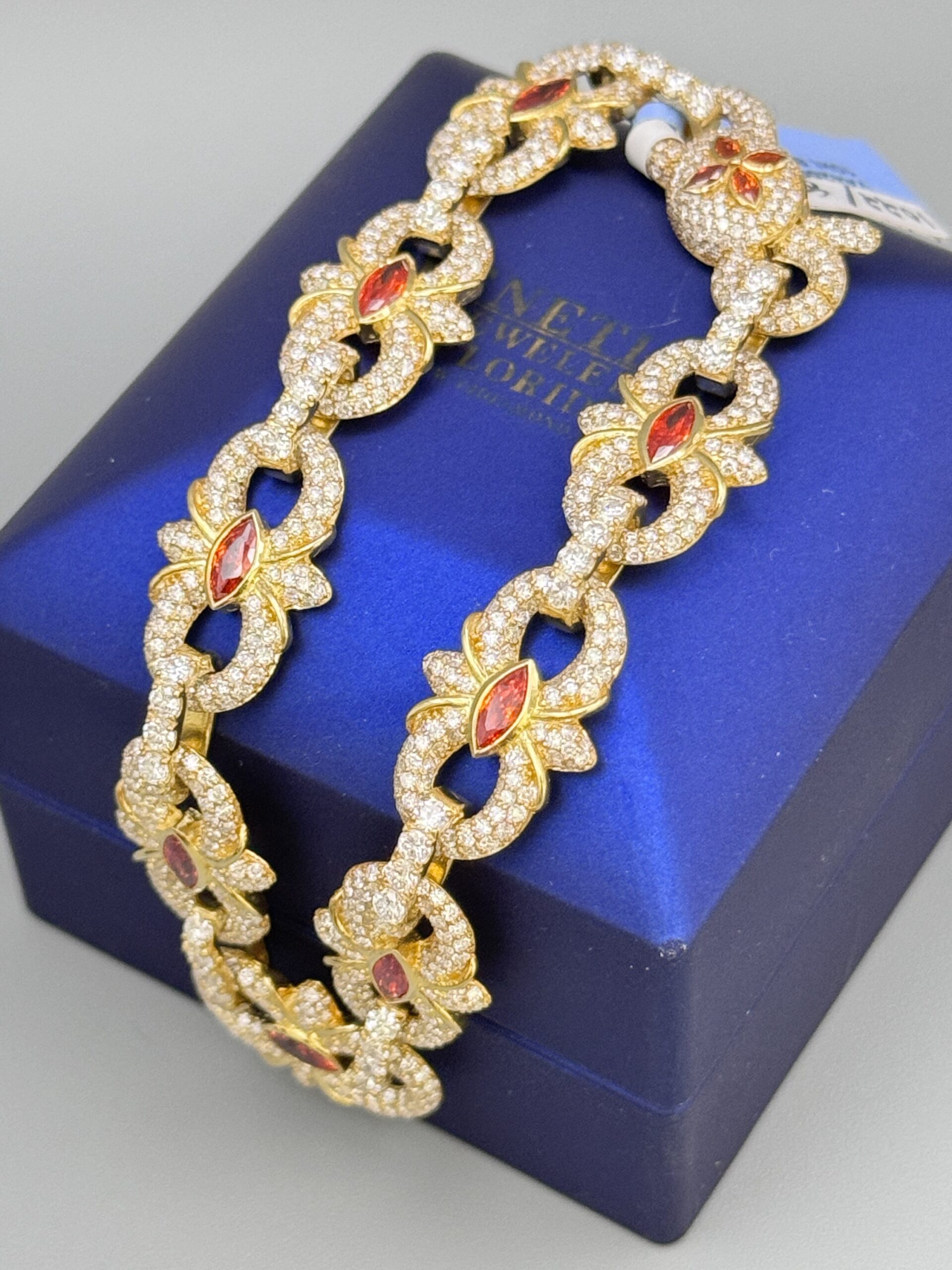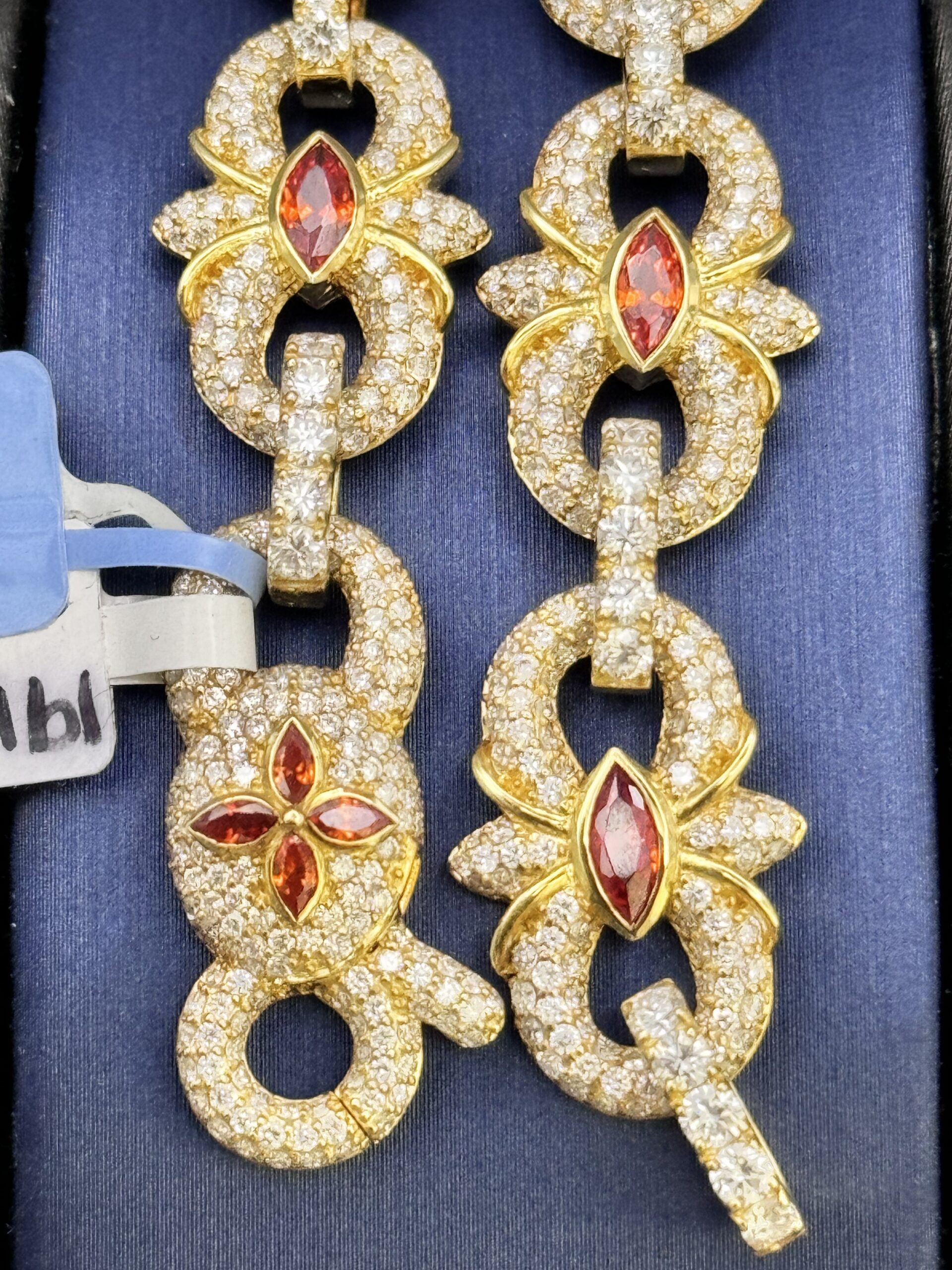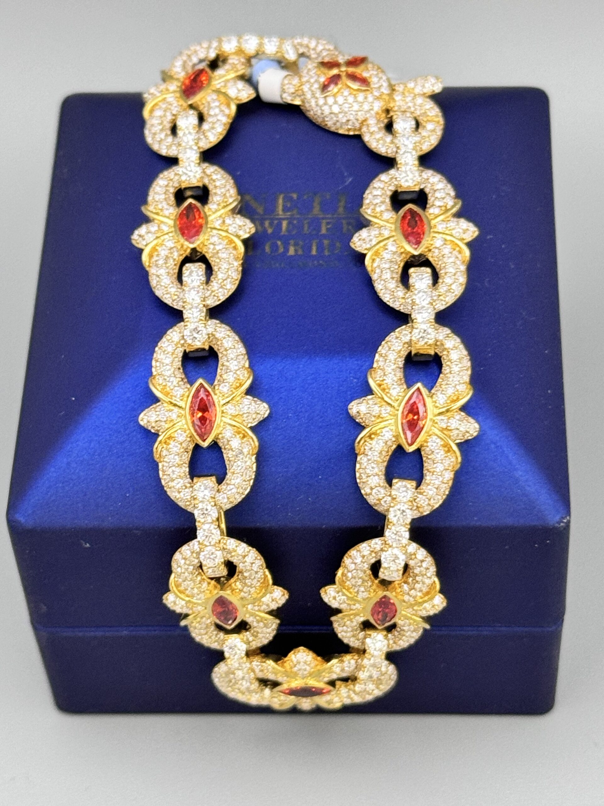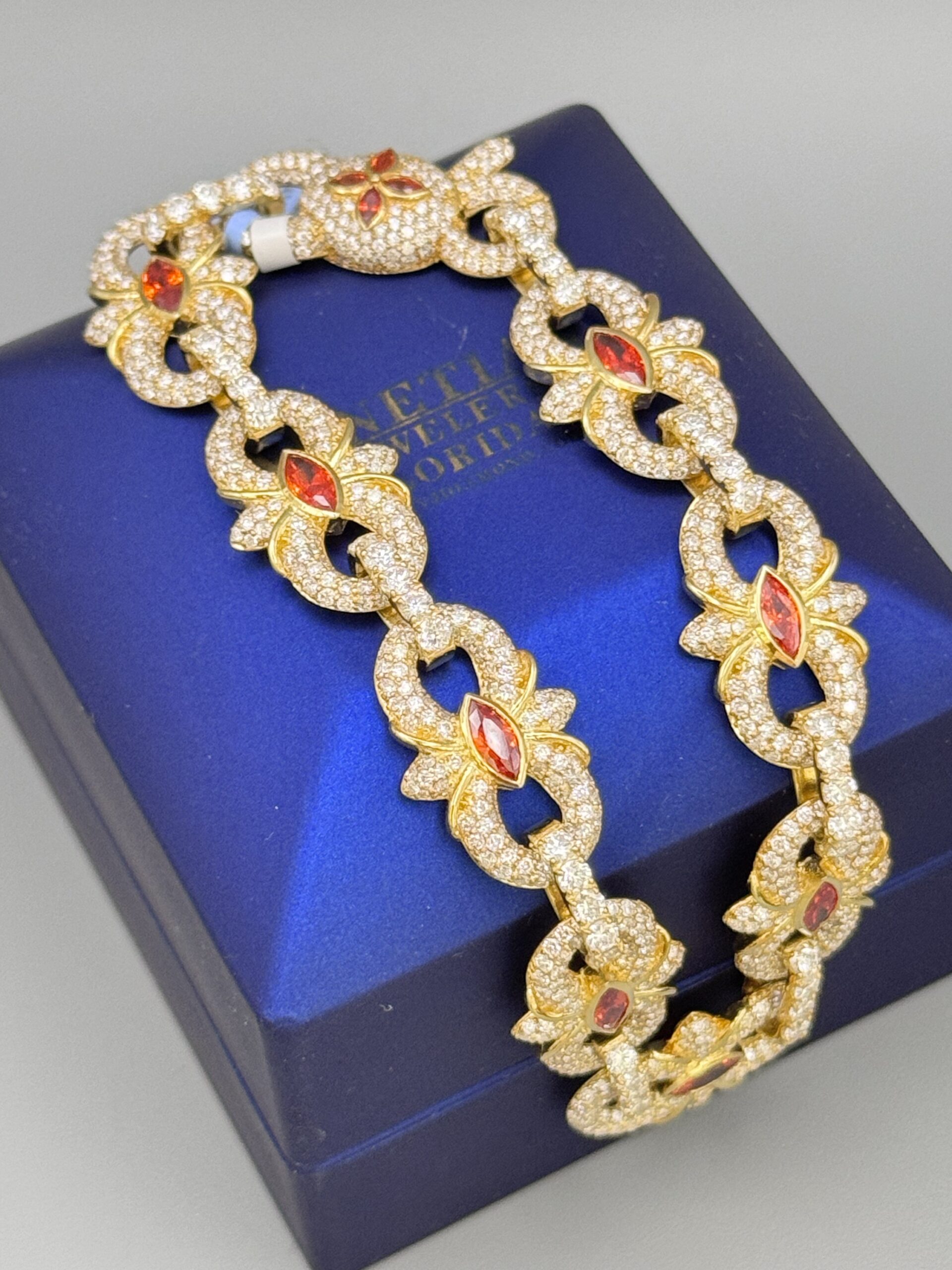 Elevate your style with this stunning 10KT gold men’s bracelet featuring 8.02CT diamonds in VVS clarity and a vibrant orange gemstone. Weighing 32.9 grams, it measures 8.5 inches for a perfect fit.