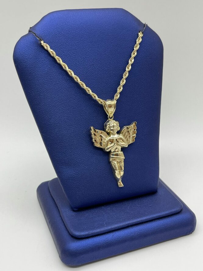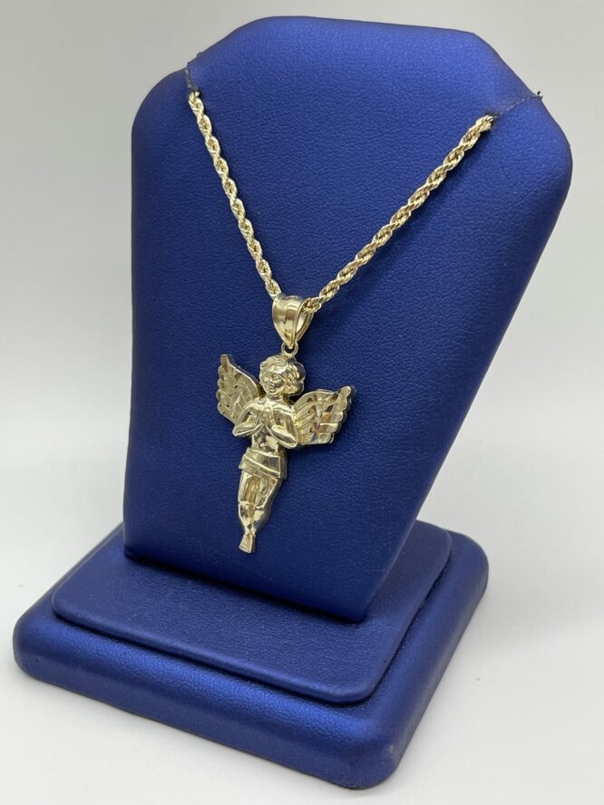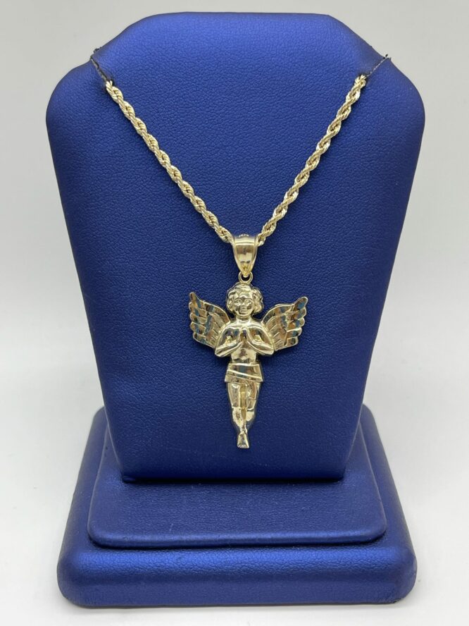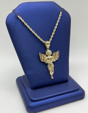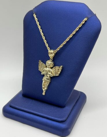 10KT Gold Angel Pendant ComboSet Comes With 10KT DiamondCut Rope Necklace 22″ 3MM Approx Gold Weight 4.83 Gram Pendant 1.75″ Tall Includes Bell By 1″ All Around Approx Gold Weight 3.42 Gram