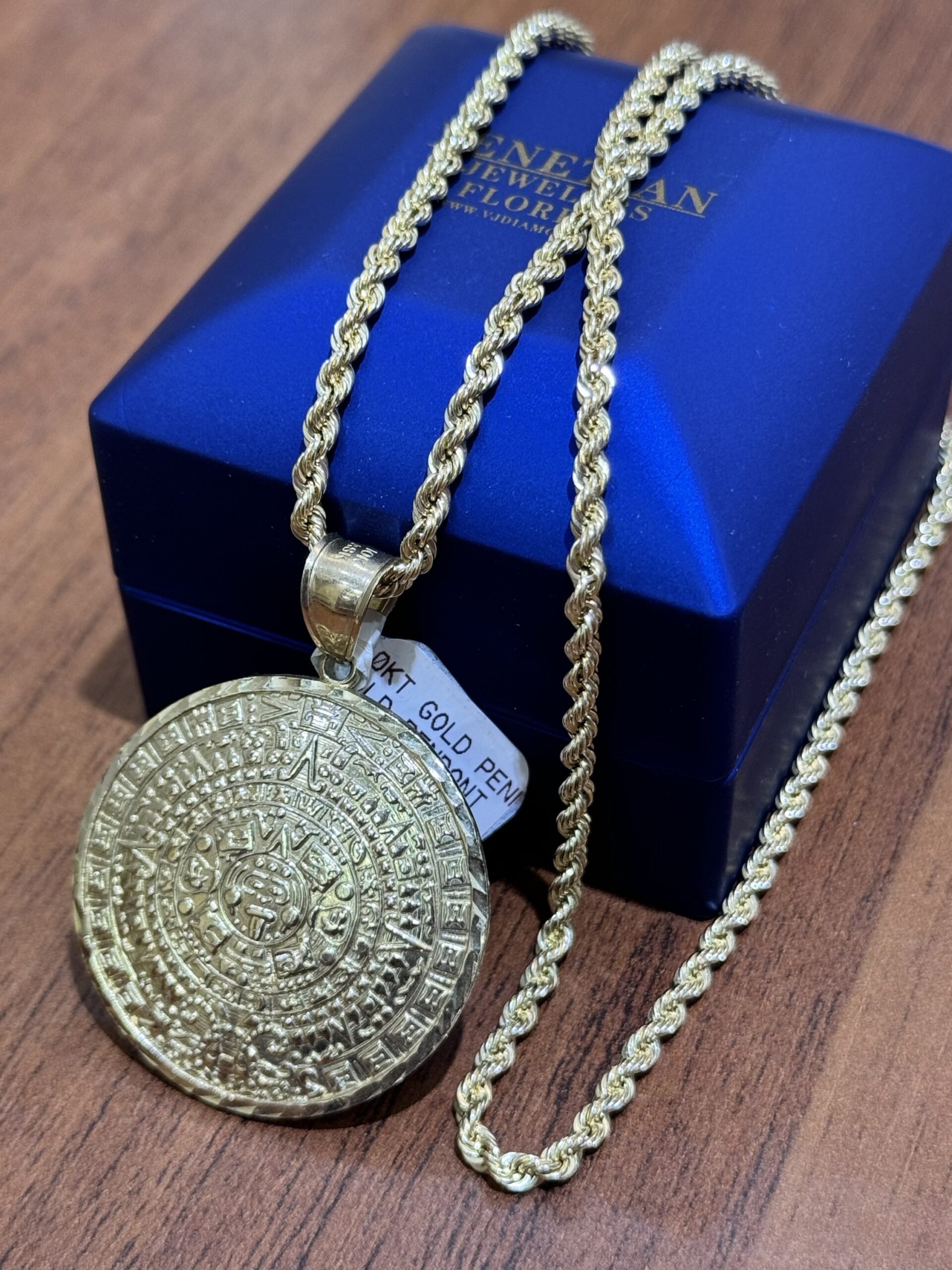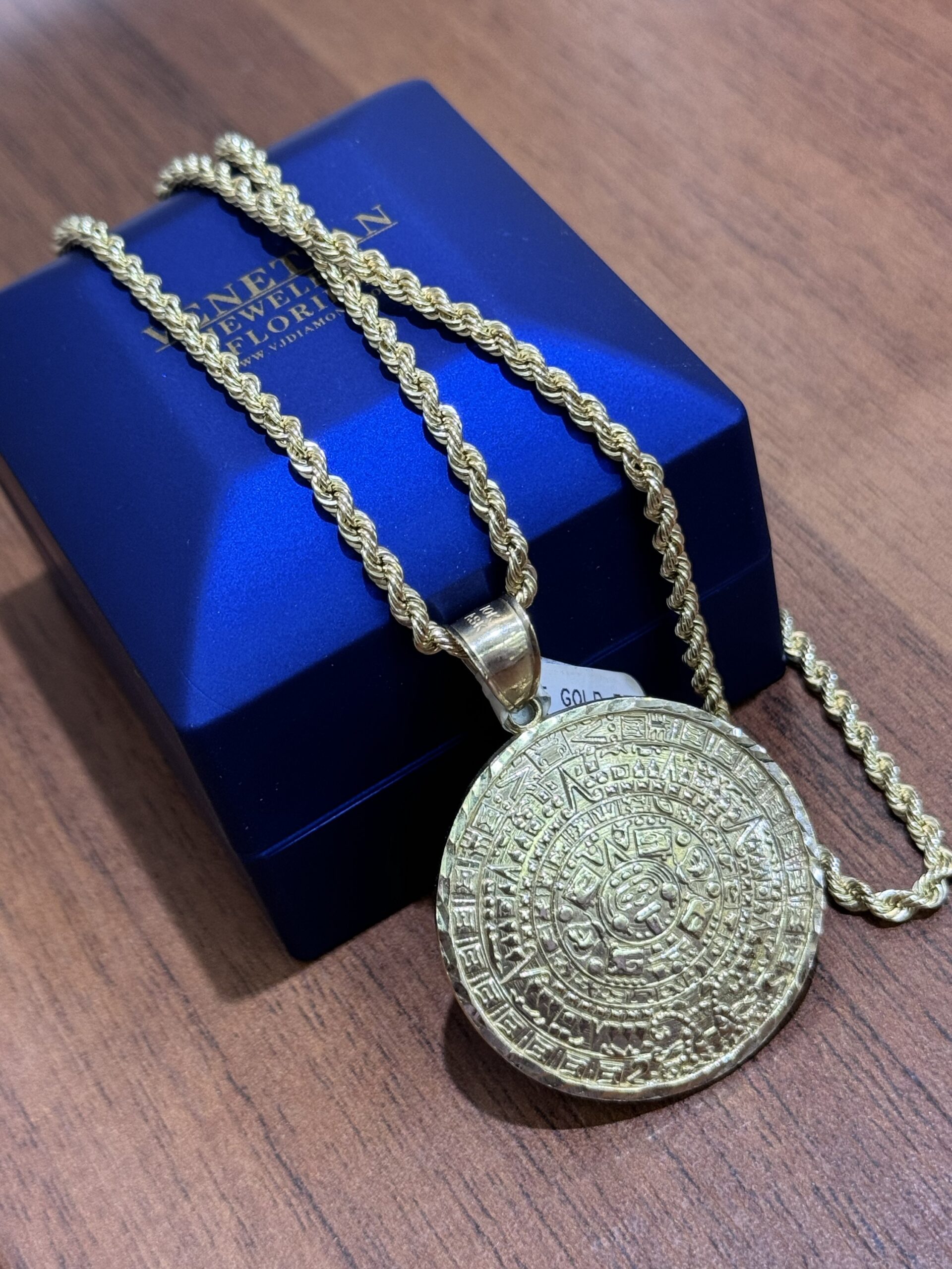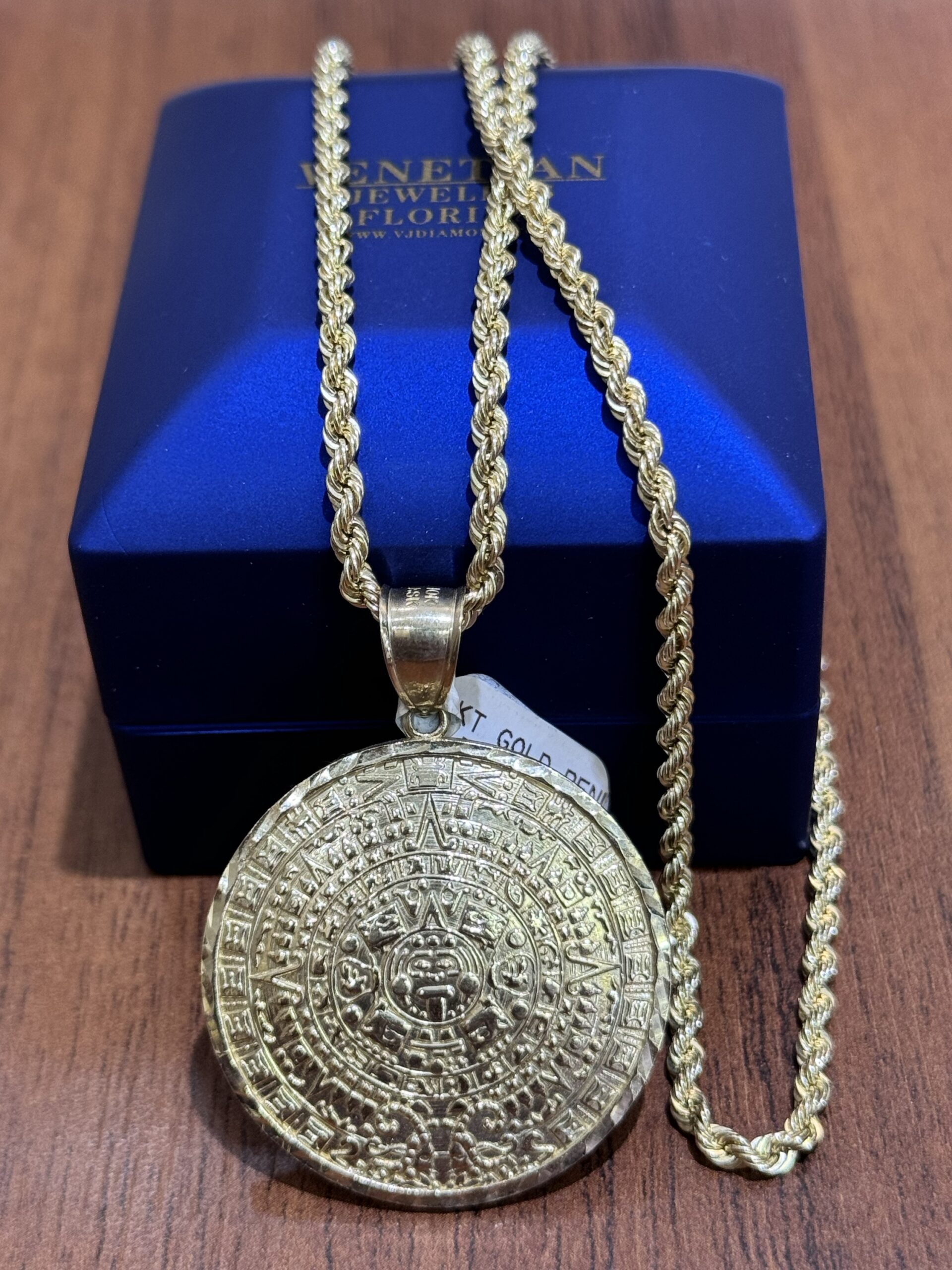 10KT Gold Aztec Calendar Pendant ComboSet Comes With 10KT Gold Rope 24″ Rope Necklace 3MM Approx Gold Weight 6.2 Gram Pendant 1.9″ Tall By 1.5″ Wide Approx Gold Weight 10.1 Gram