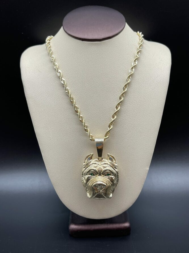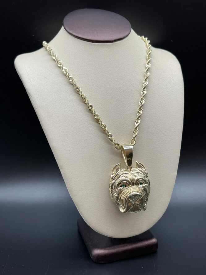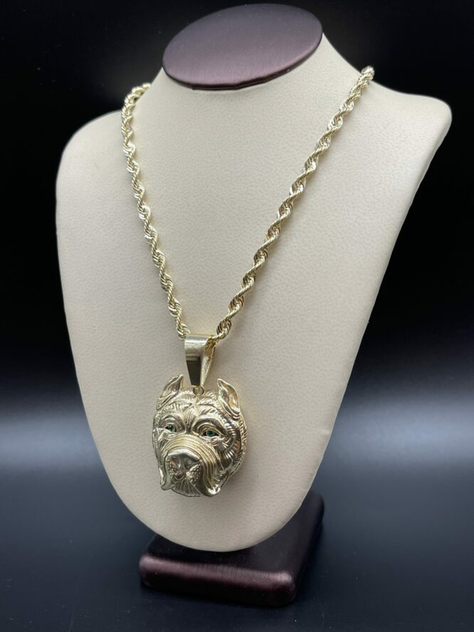 10KT Gold Green Eyed Bully Face Pendant ComboSet With 4 MM 10KT Gold Rope 20″ length 2.” Tall Approx Gold Weight Altogether 16.00 Grams