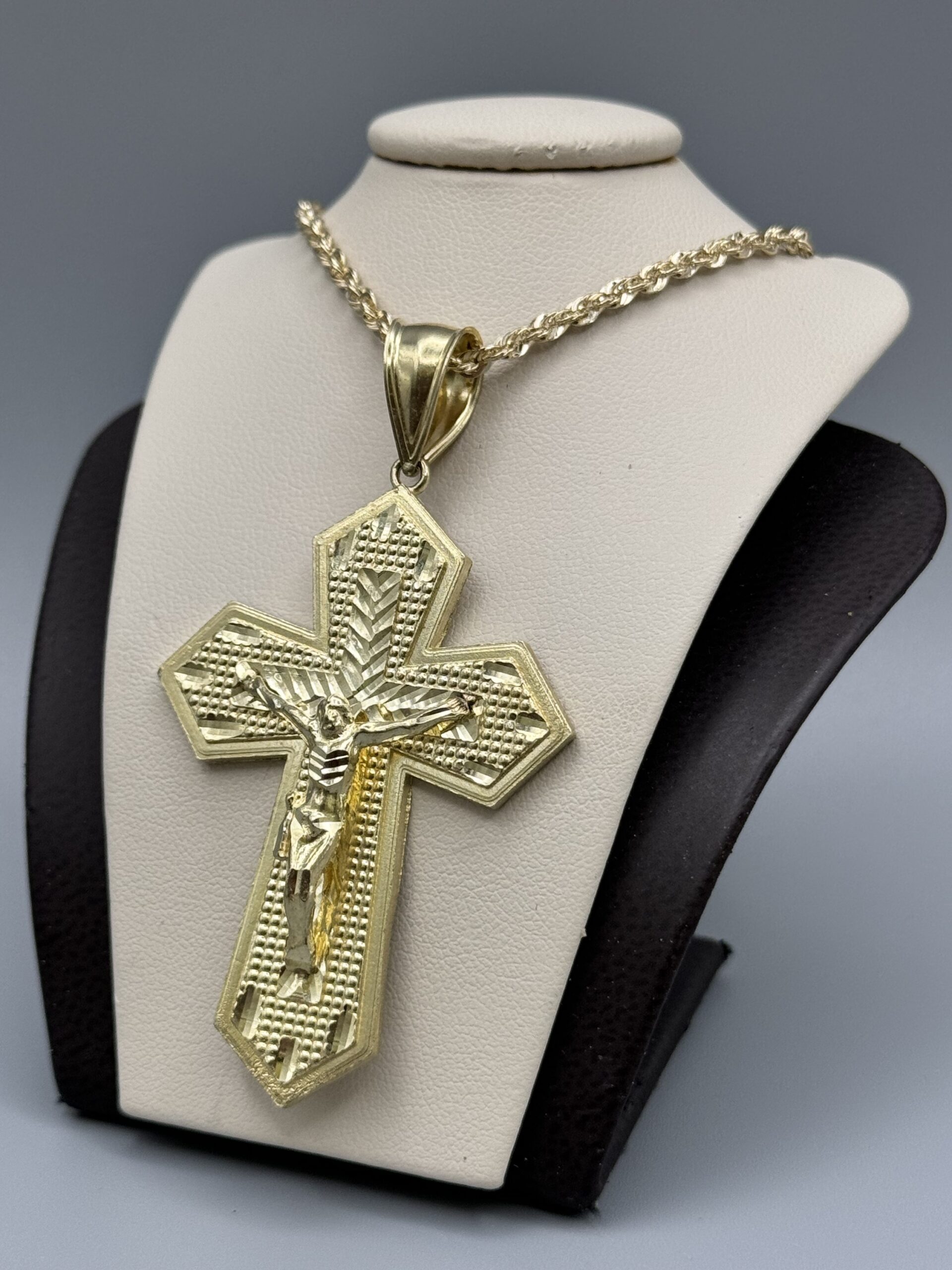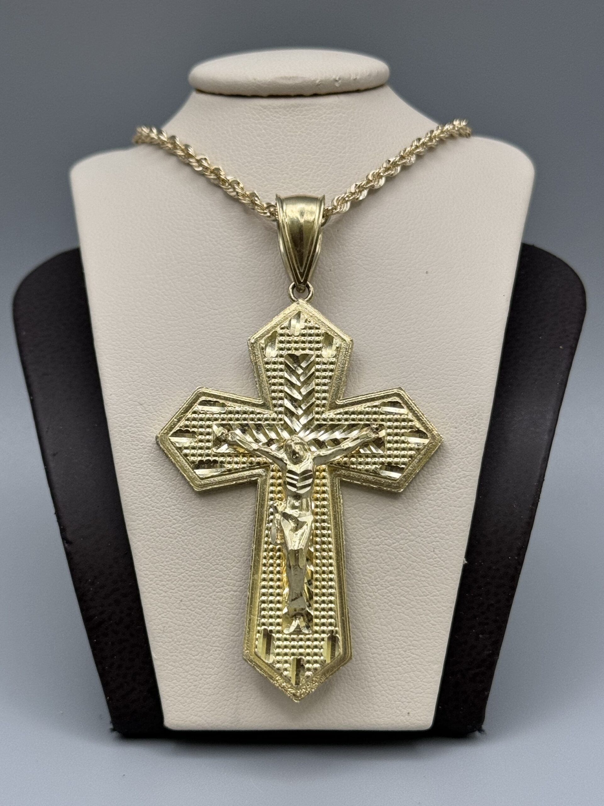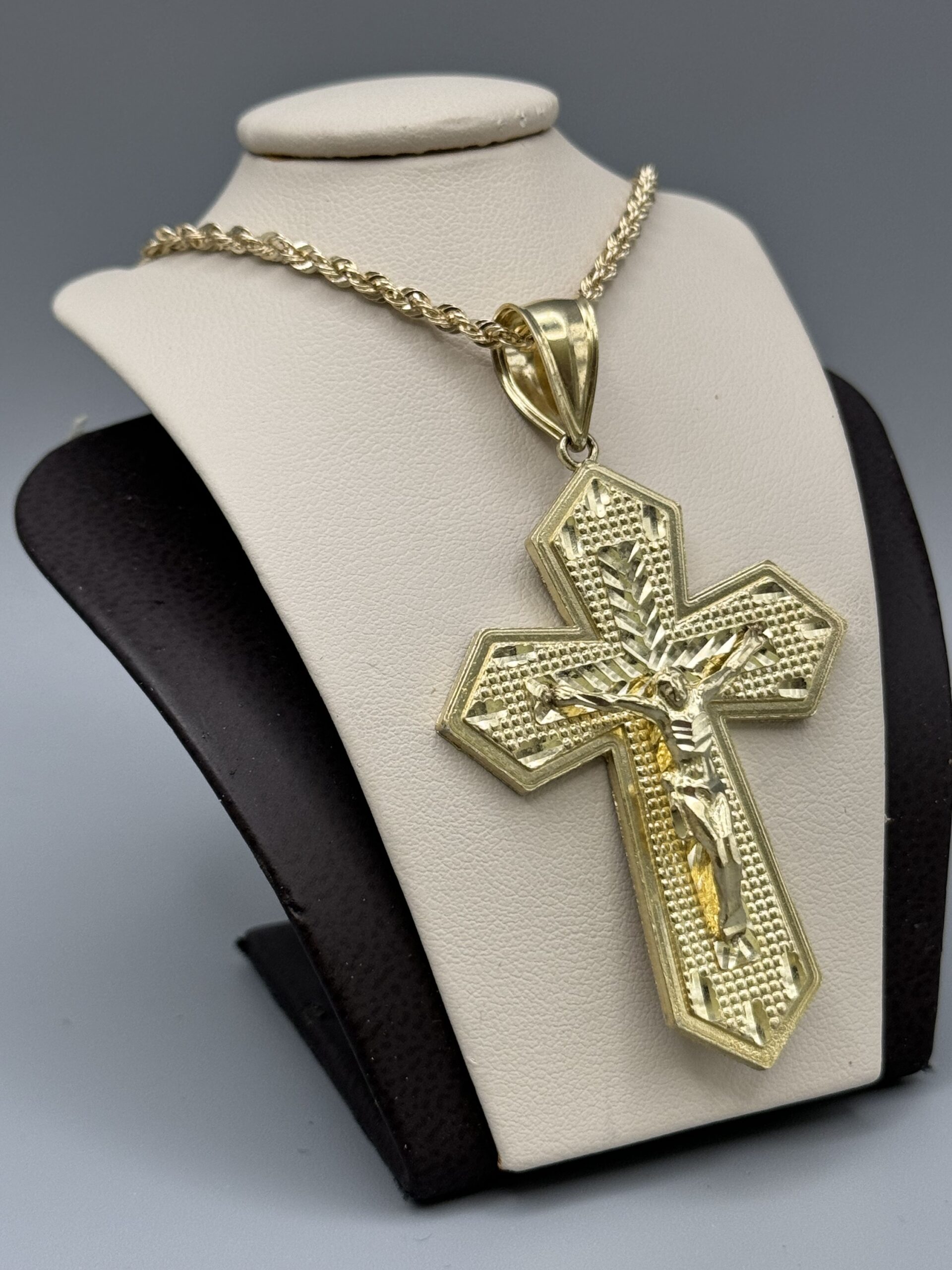10KT Gold Cross Pendant ComboSet Comes With 10KT Gold 3MM Rope Necklace 24″ Approx Gold Weight 3.8 Gram Pendant 2.75″ Tall By 1.5″ Wide Approx Gold Weight 8.4 Gram