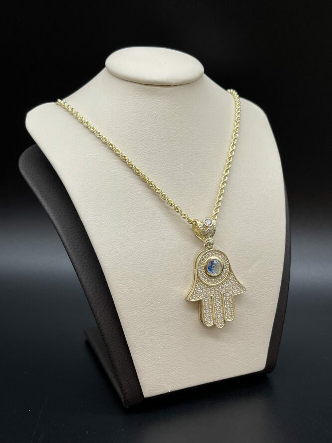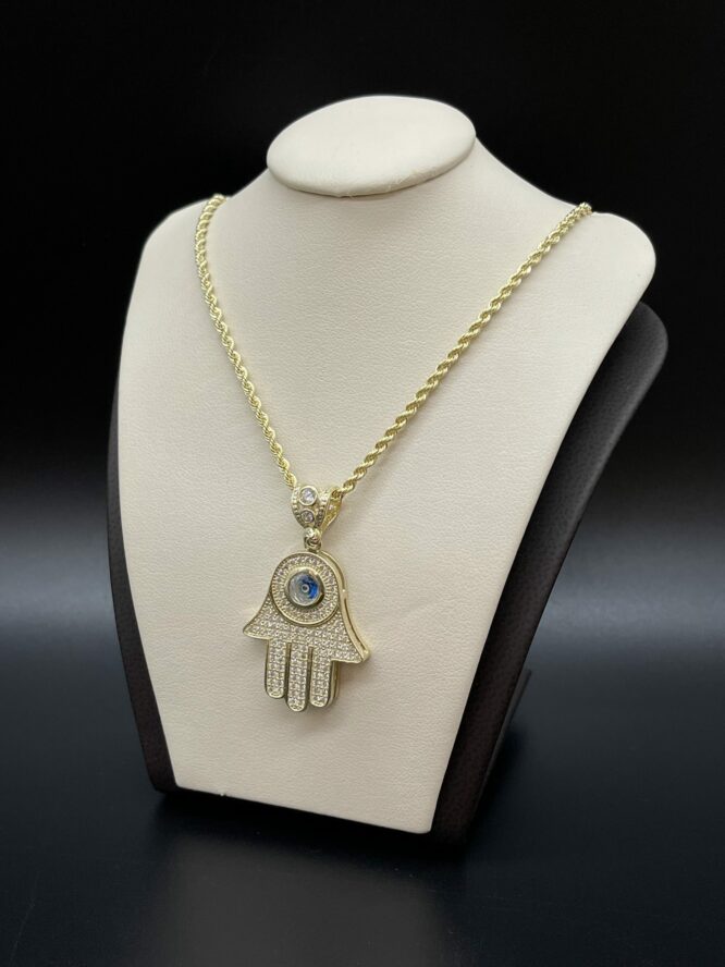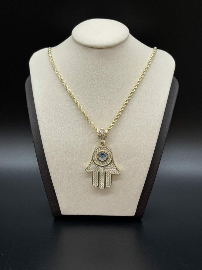 10Kt Gold CZ Hamza Pendant With EvilEye Combo Set Comes With 20″ Rope necklace Approx Gold Weight 7.74 Grams