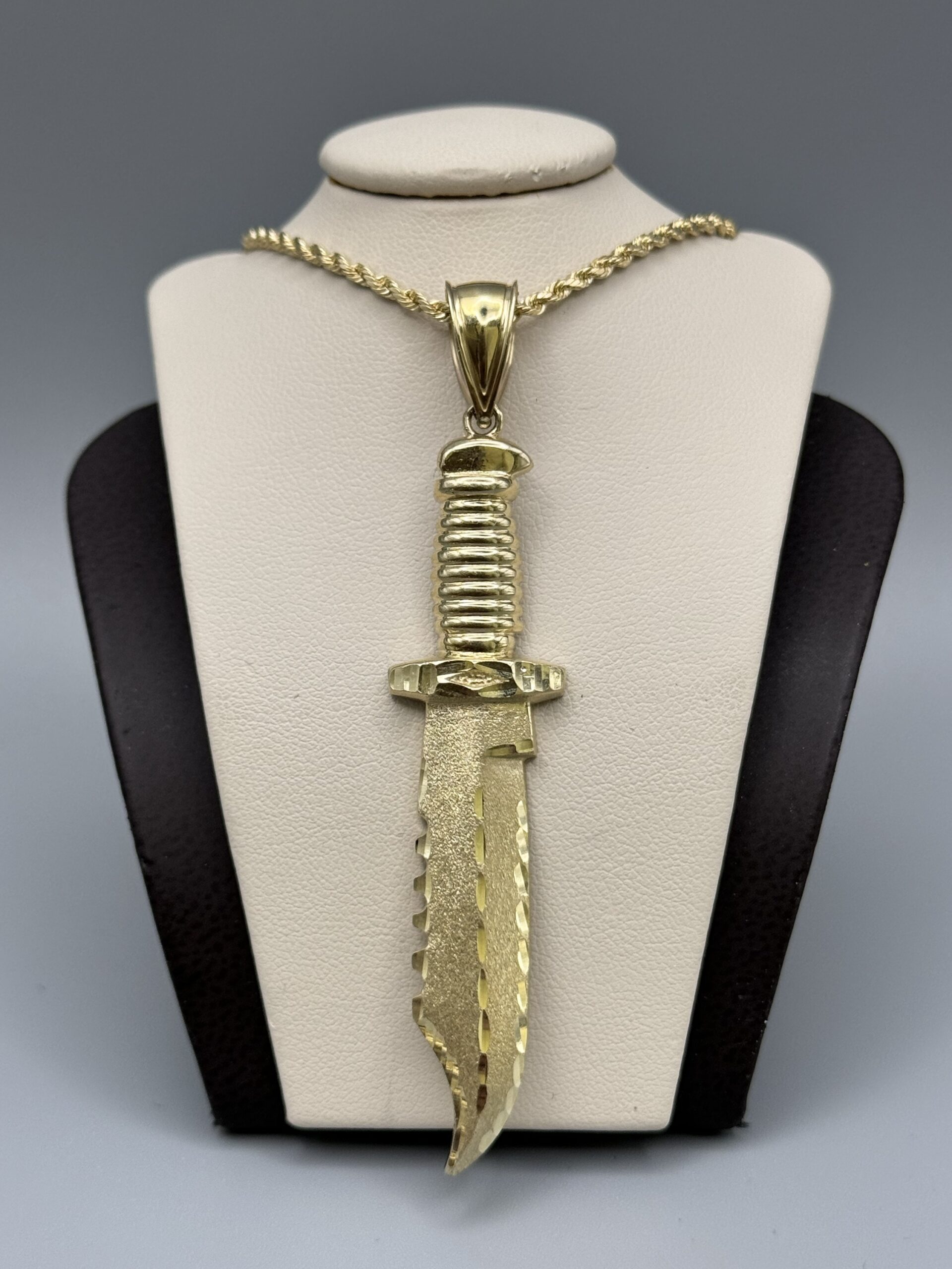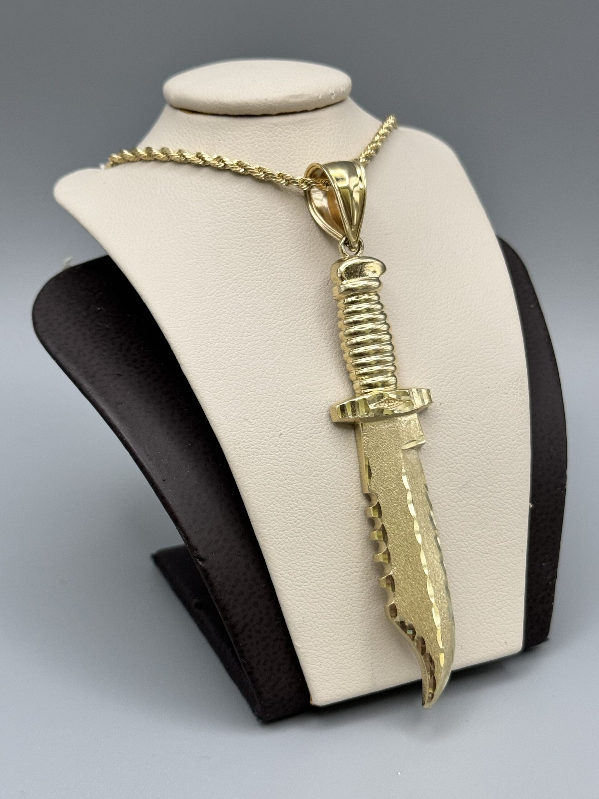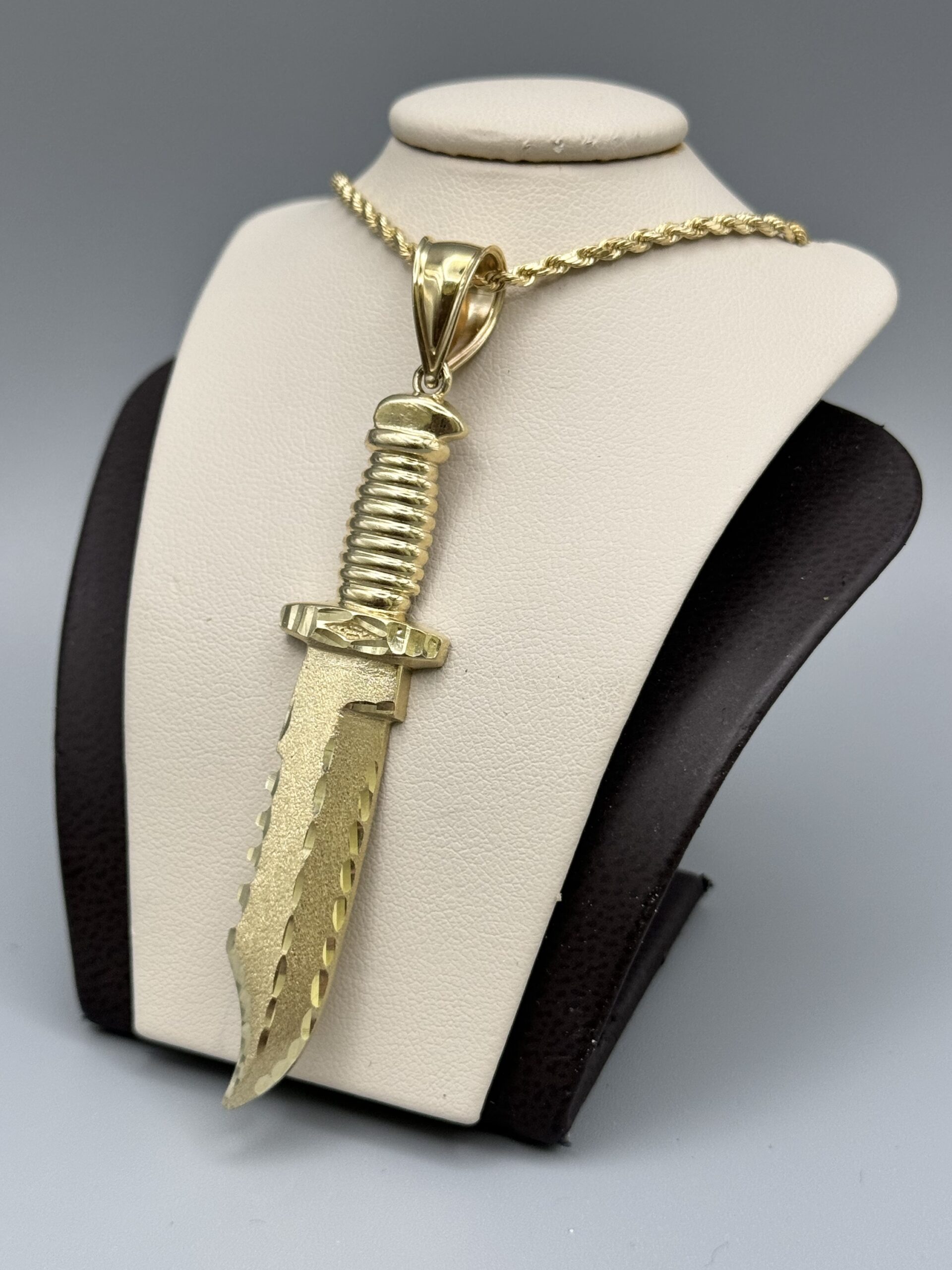10KT Gold Dagger Pendant ComboSet Comes With 10KT Gold 2MM Rope Necklace 22″ Approx Gold Weight 3.1 Gram Pendant 3.25″ Tall By 0.75″ Wide Approx Gold Weight 5.7 Gram