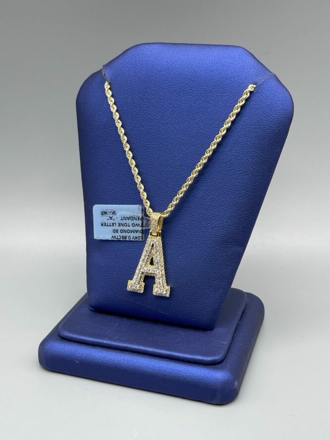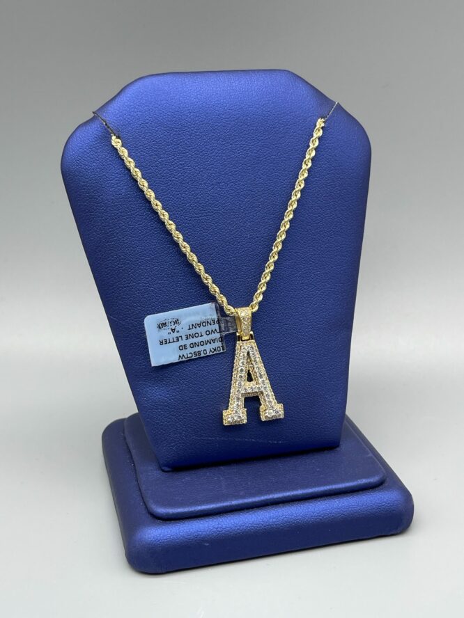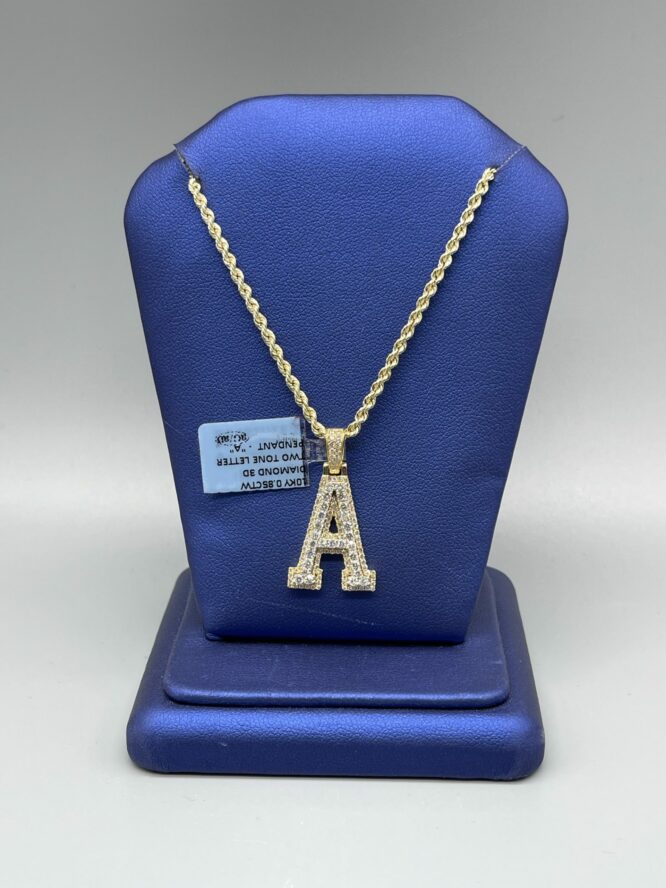 10KT 0.85CT Diamond A Initial Two Tone Double Layer Comes With 20″ Rope Chain Approx Weight For Necklace 3.0 Grams All Full Cut Excellent Clarity Diamonds Perfect For All Ages