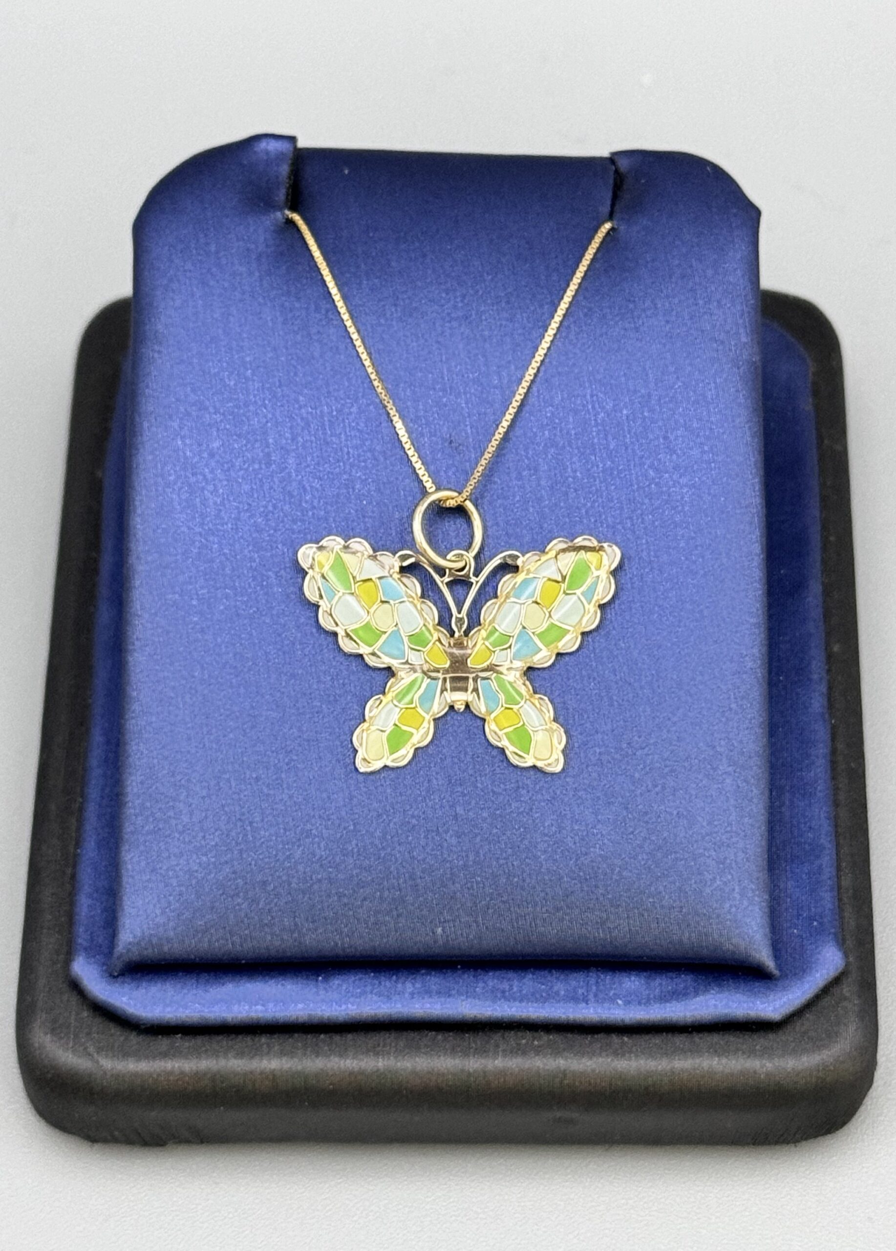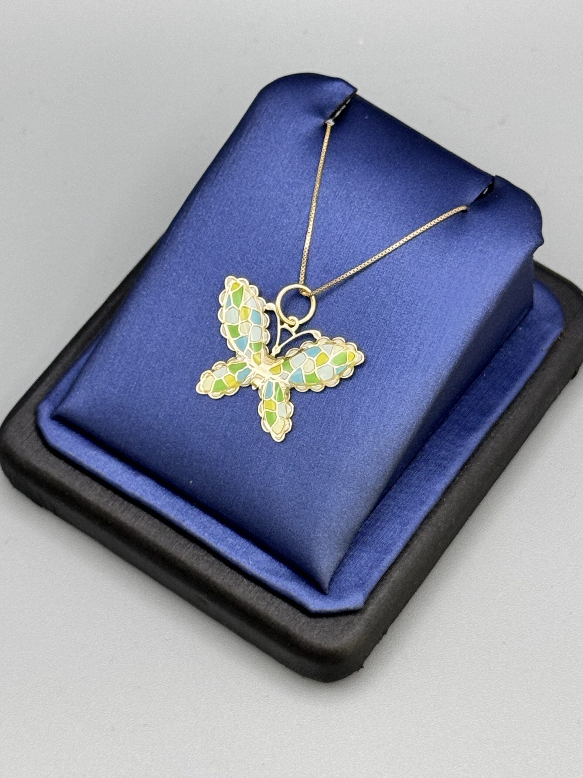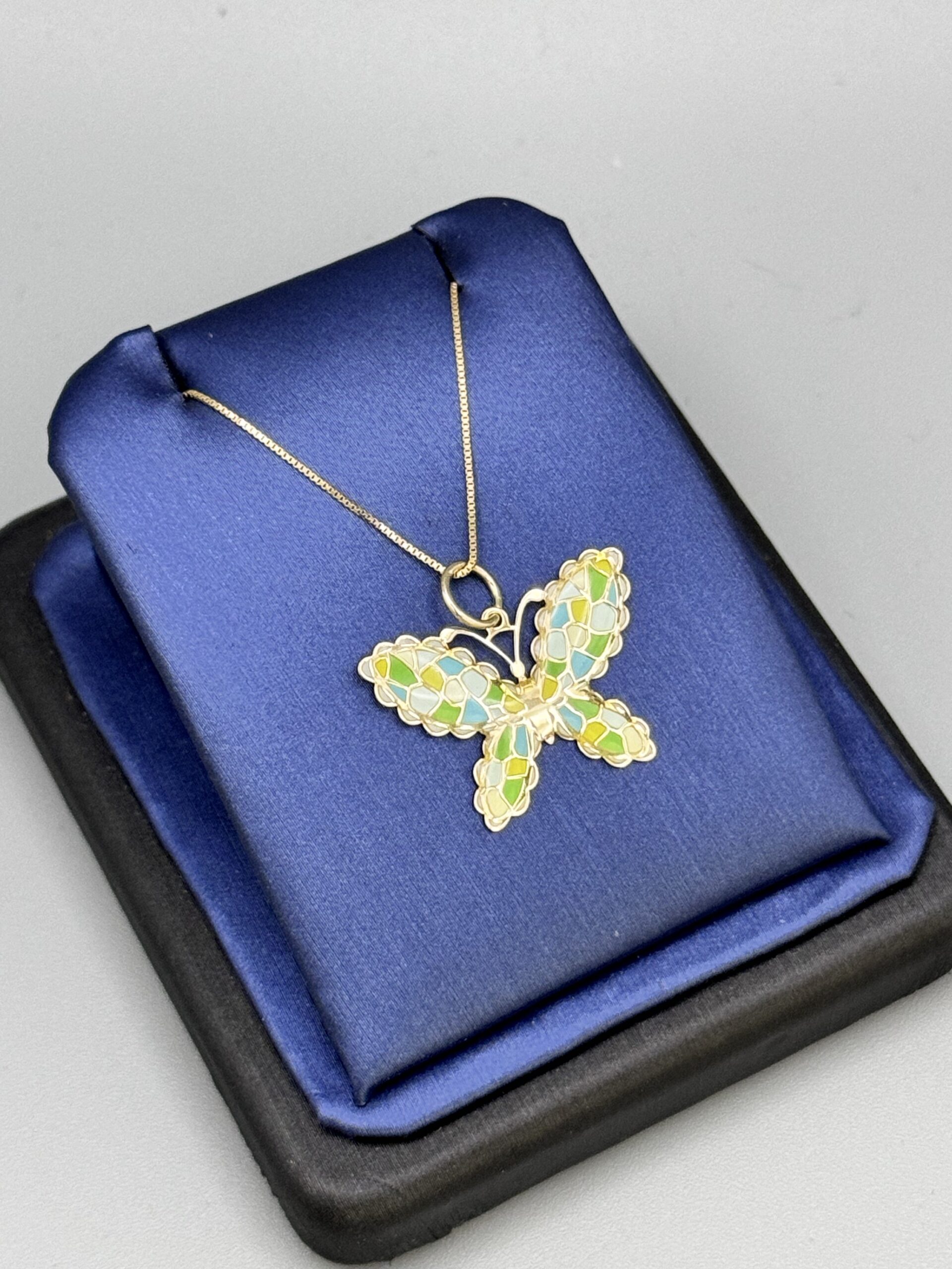 10KT Gold Fancy Butterfly Pendant Set Comes With 10KT Box Chain 18″ Approx Gold Weight 1.5 Gram All Together Big Look Double Side Enamel Pendant