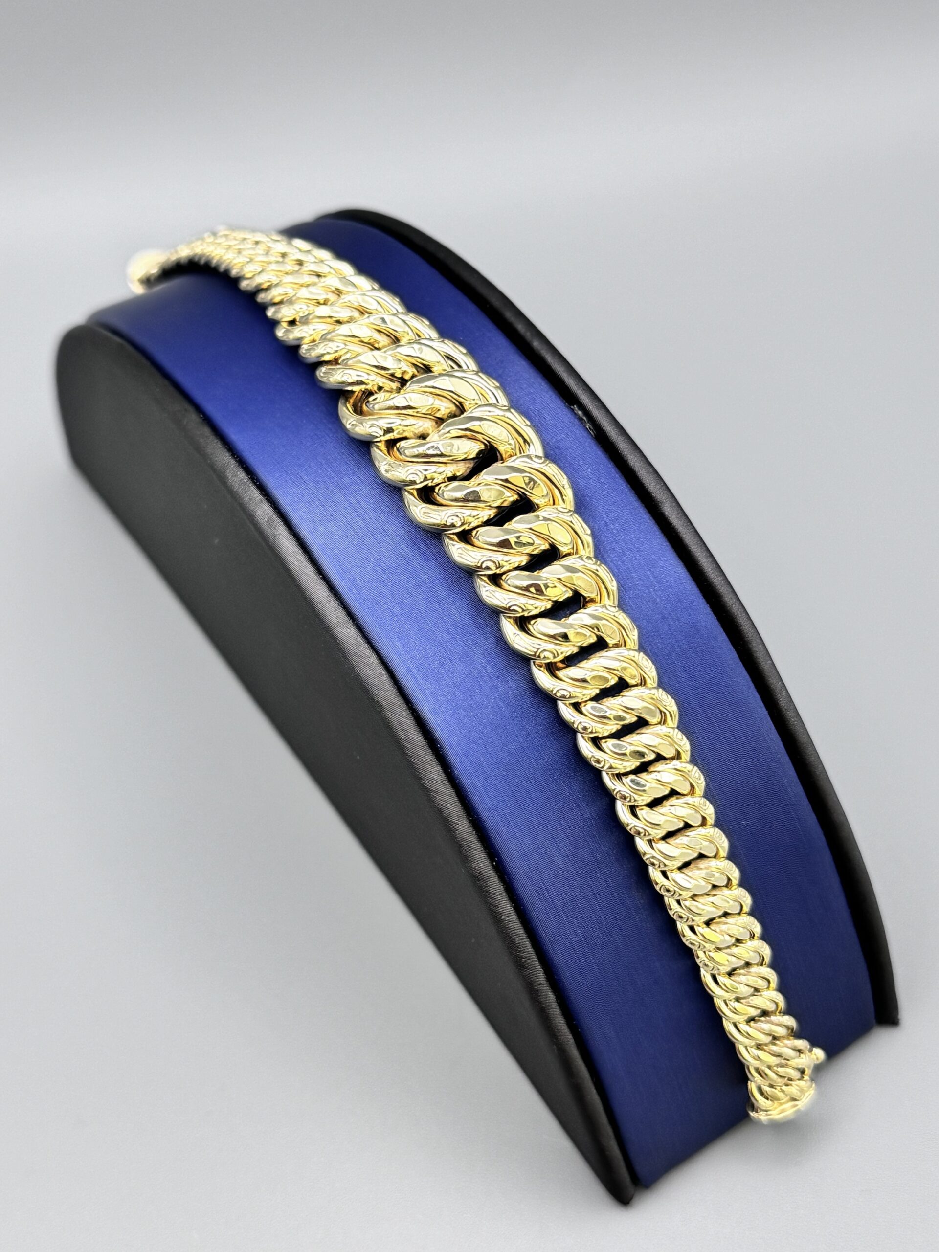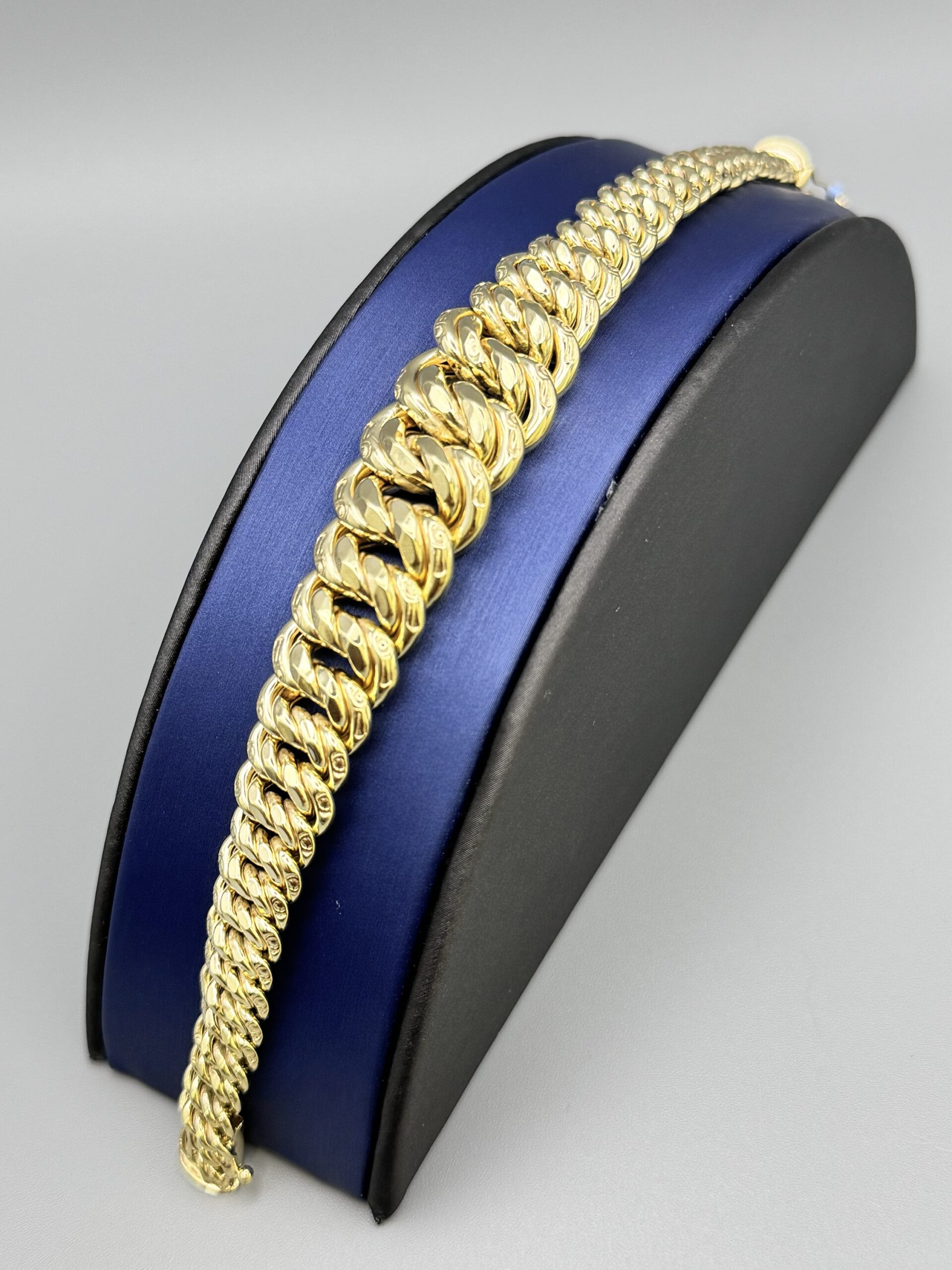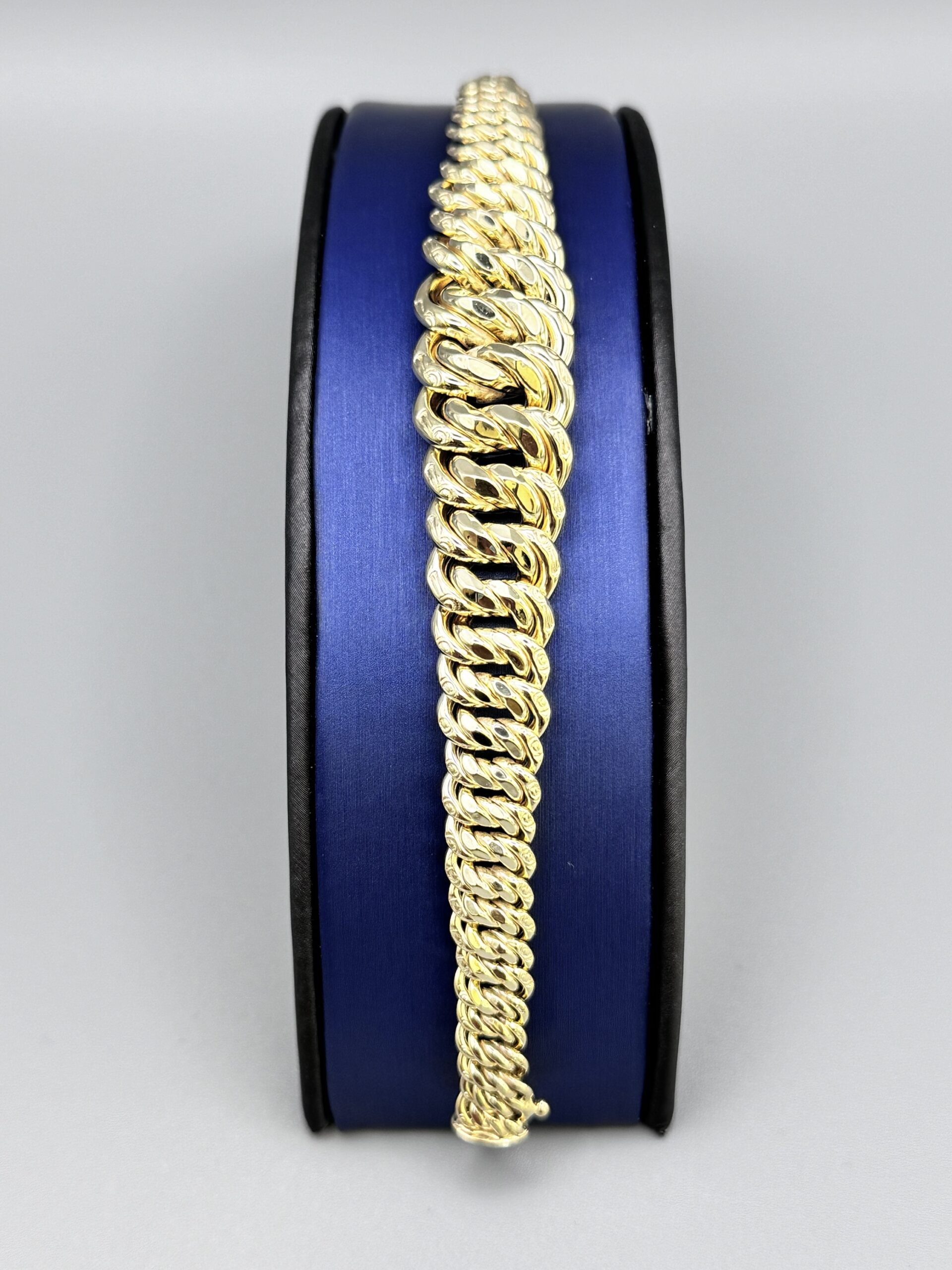 This elegant 10KT gold bracelet is a stunning addition to any jewelry collection. Measuring 7.5″ with a width of 18MM and weighing approximately 14.7 grams, it features a secure box lock for a perfect fit.