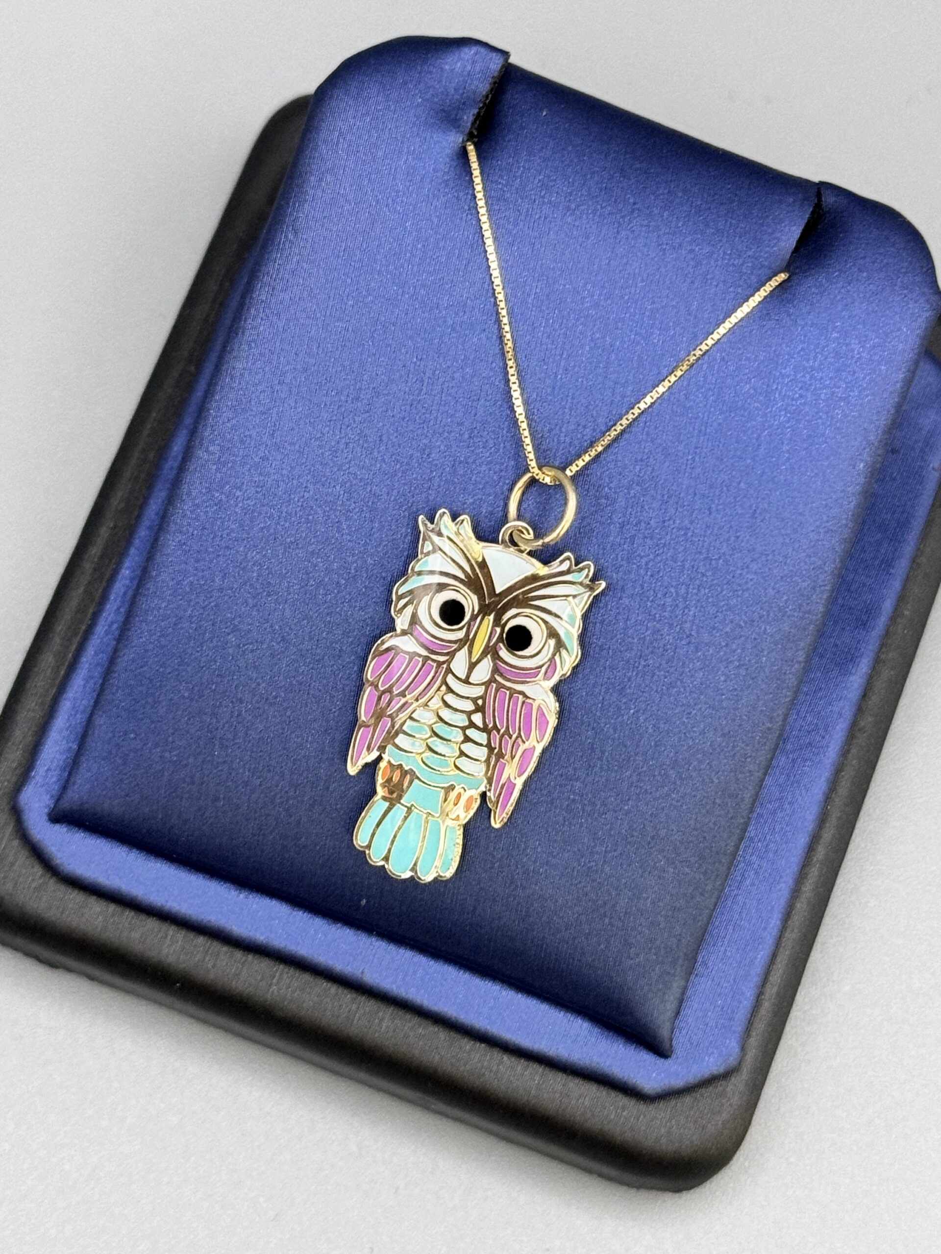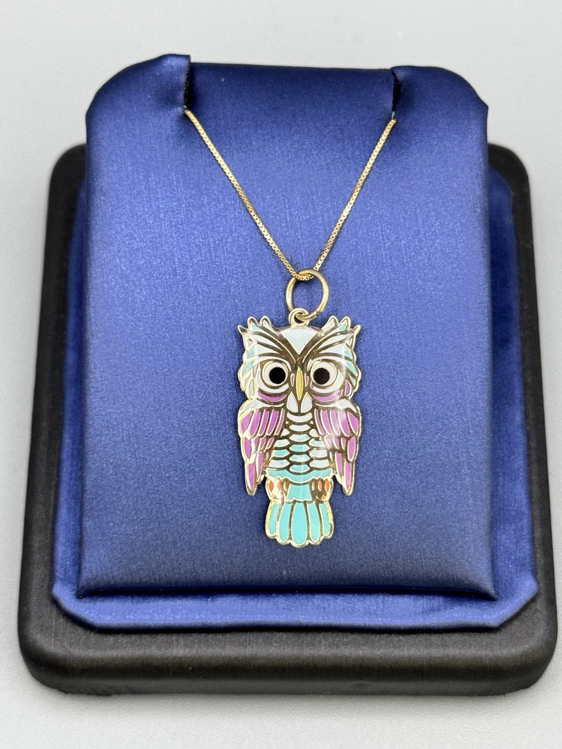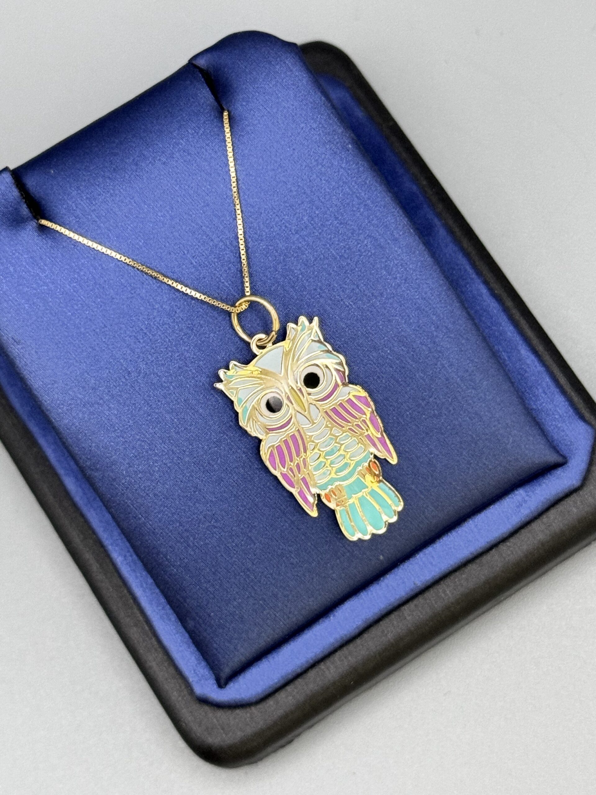 10KT Gold Fancy Owl Pendant Set Comes With 10KT Box Chain 18″ Approx Gold Weight 1.8 Gram All Together Big Look Double Side Enamel Pendant
