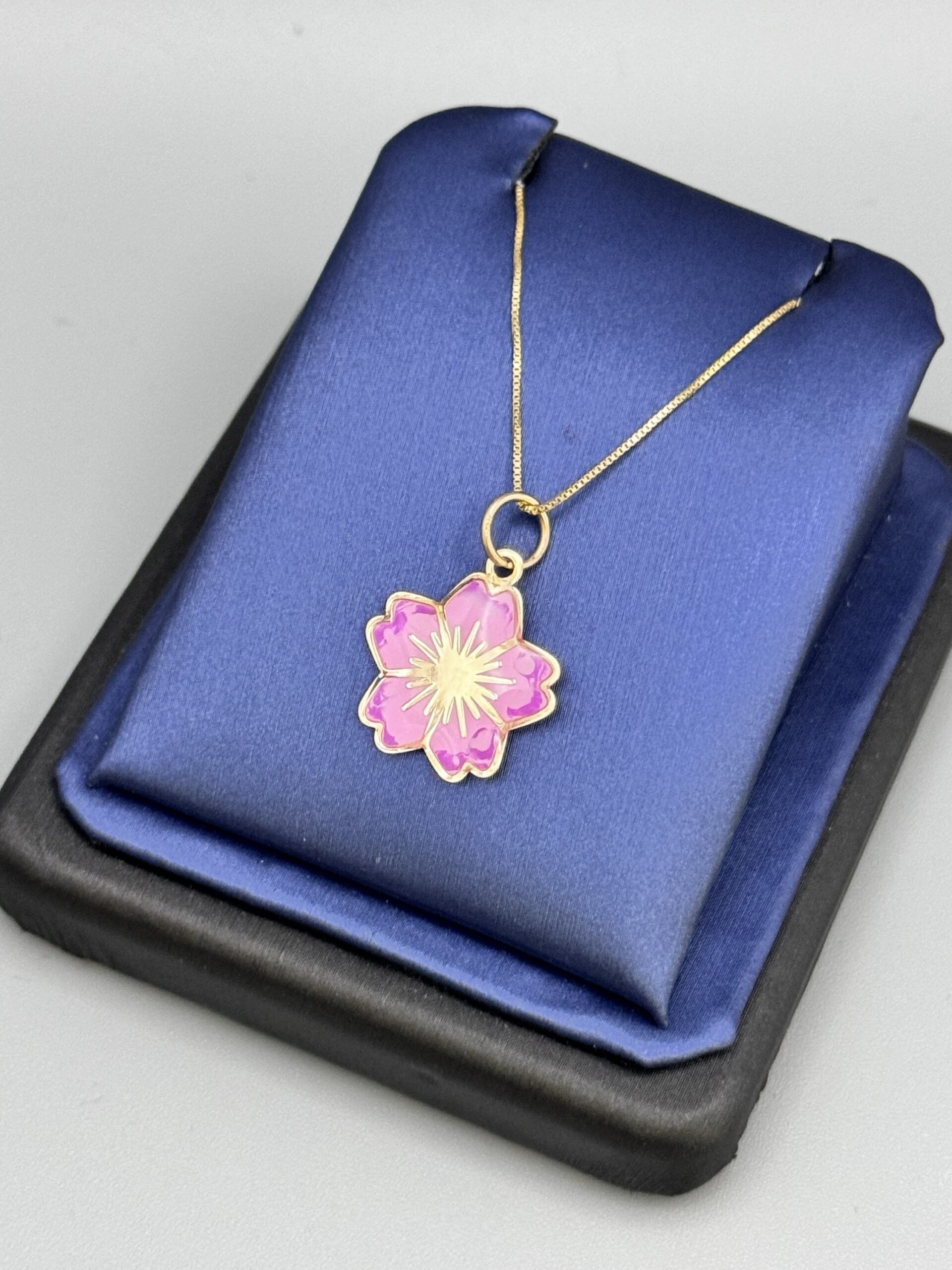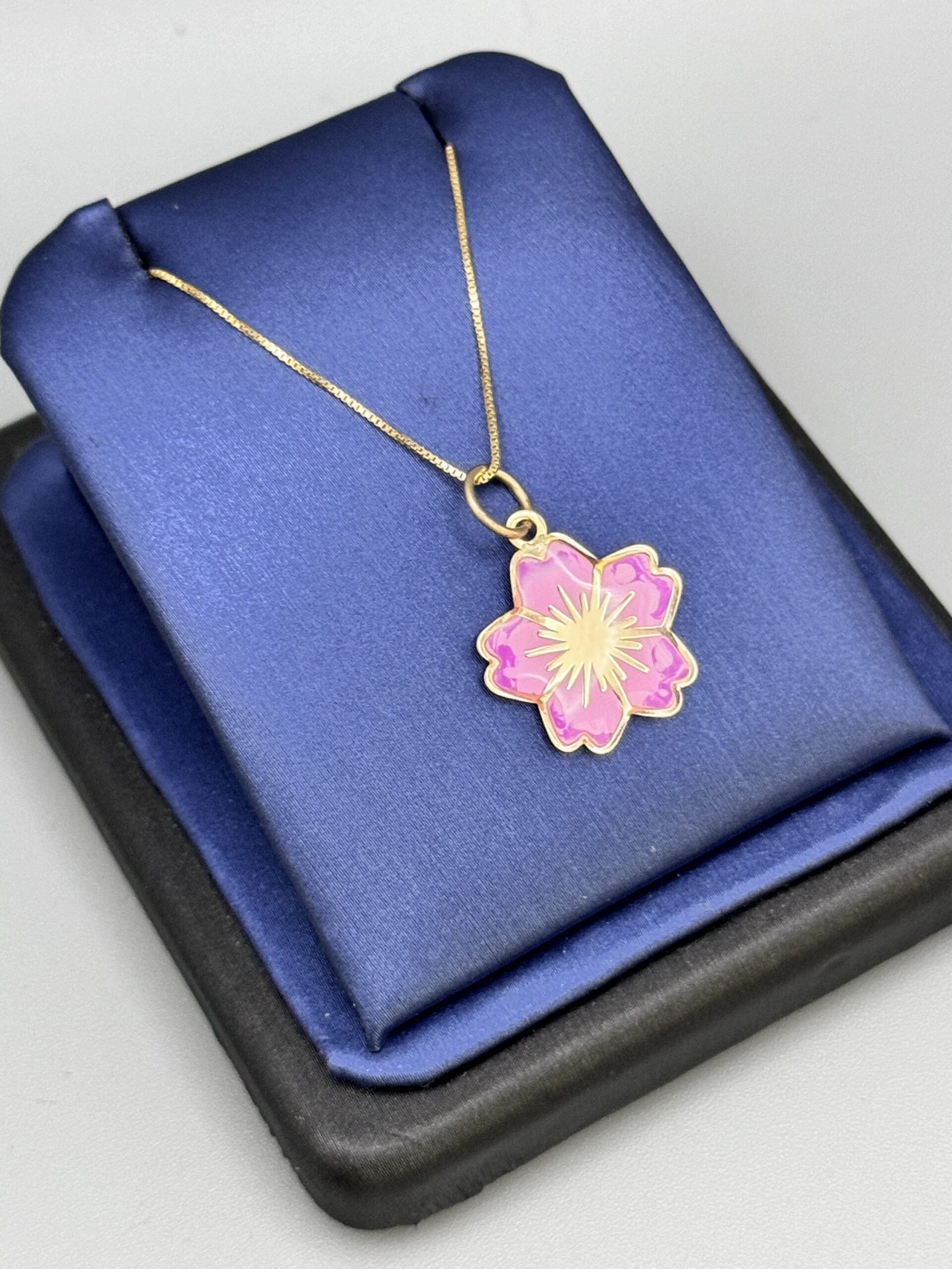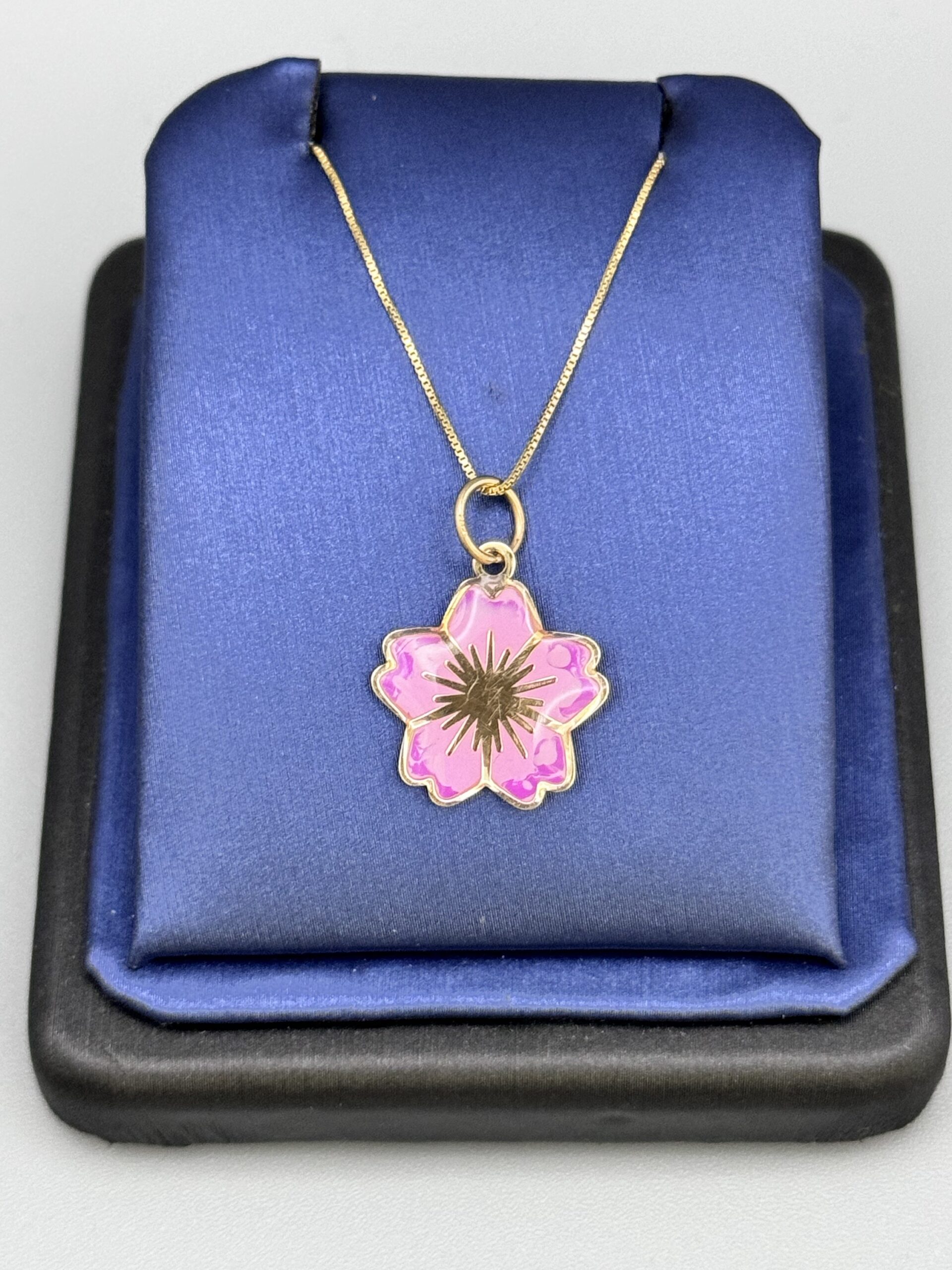 10KT Gold Fancy Pink Flower Pendant Set Comes With 10KT Box Chain 18″ Approx Gold Weight 1.5 Gram All Together Big Look Double Side Enamel Pendant