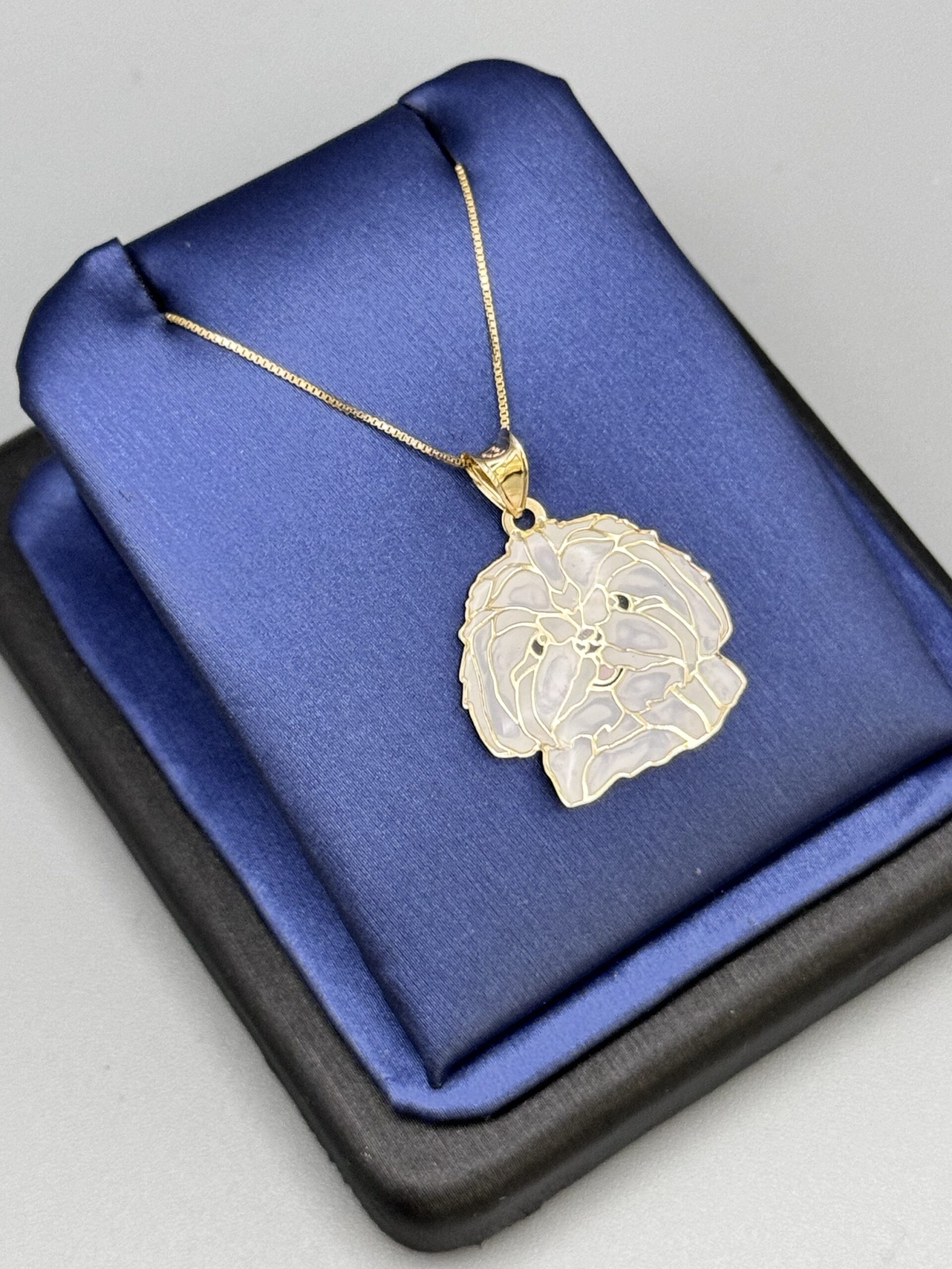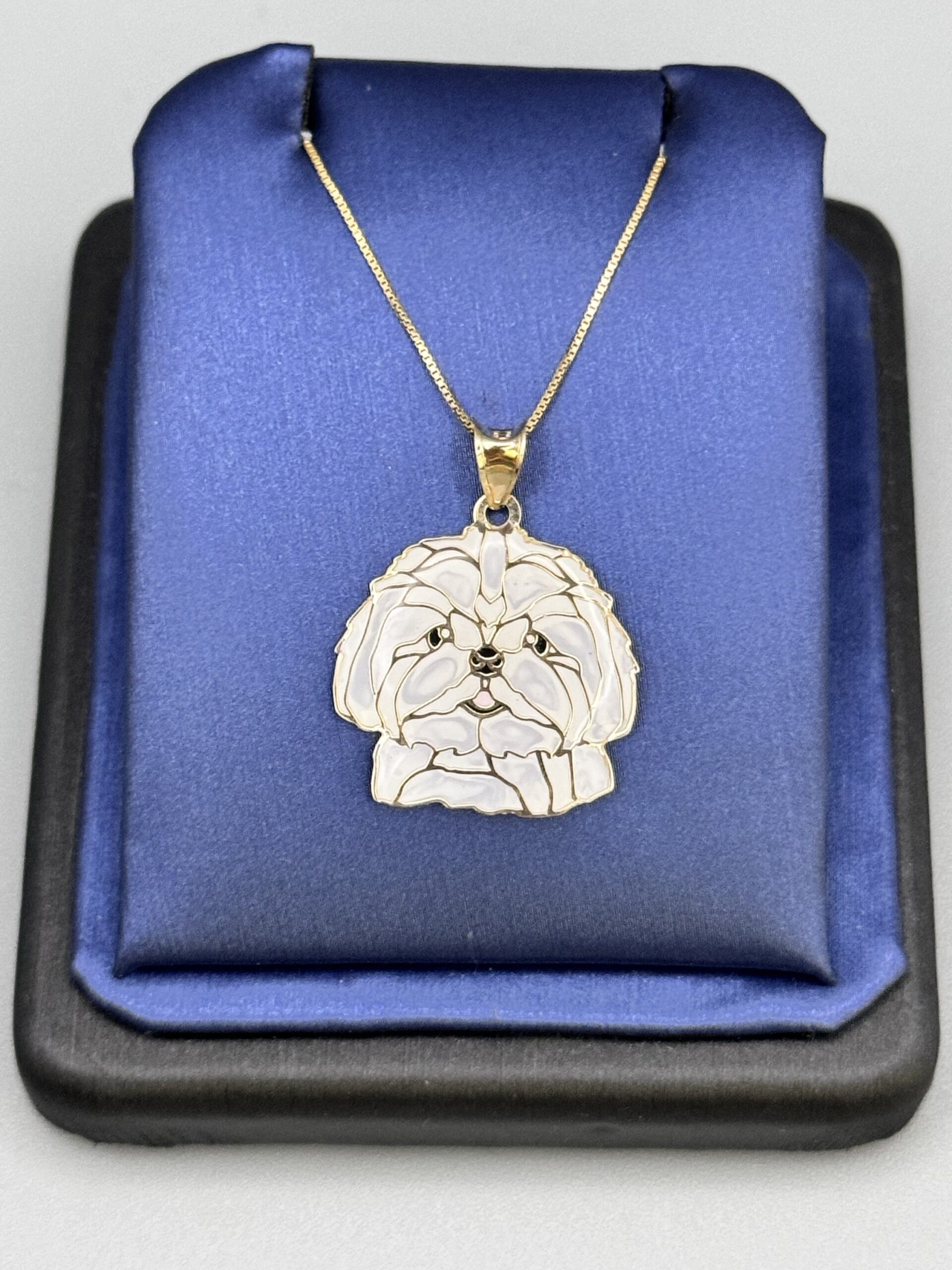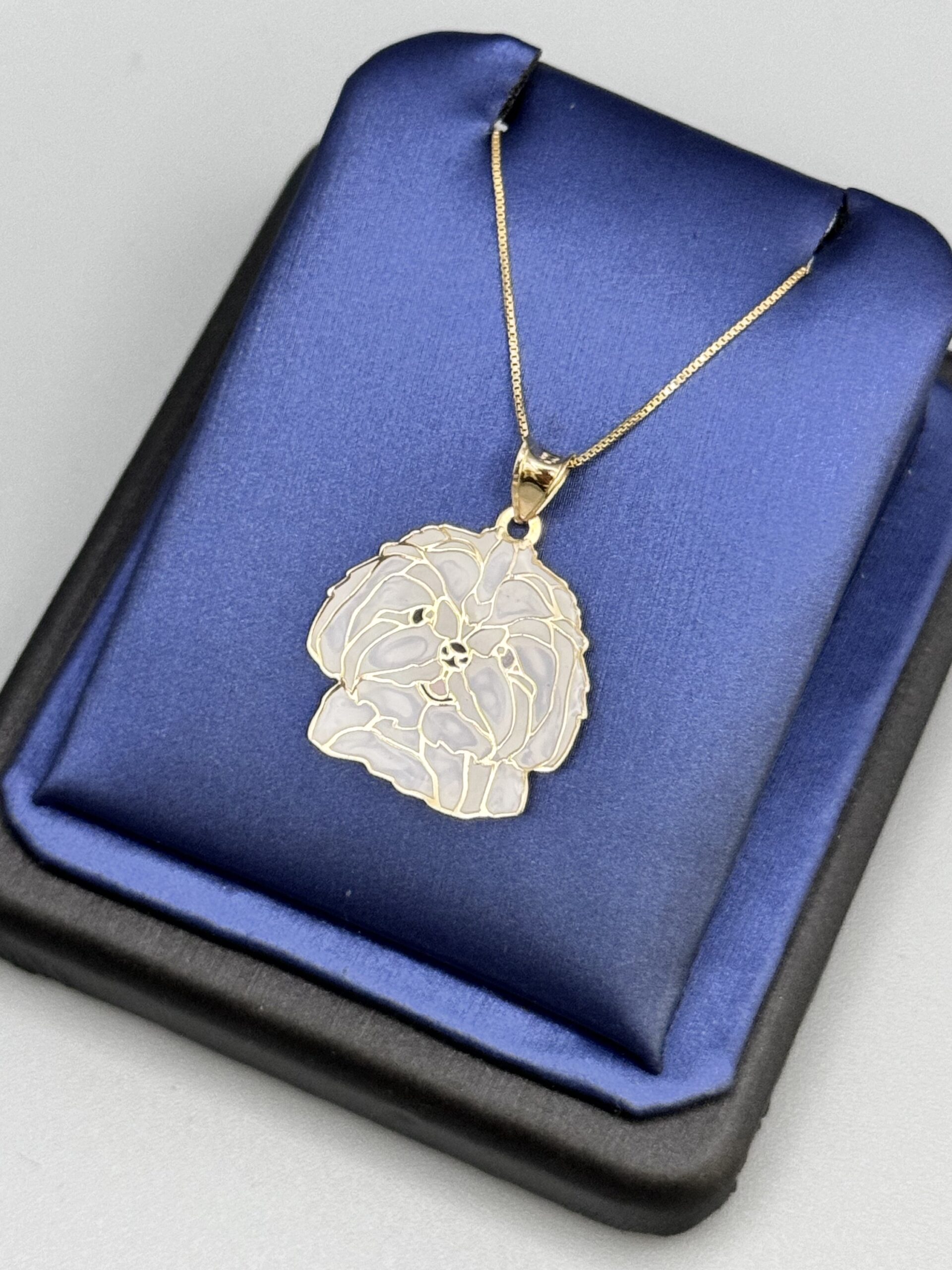 Adorn yourself with this charming 10KT Gold Fancy Puppy Pendant Set, featuring a double-sided enamel pendant and an 18″ box chain. Light, elegant, and perfect for pet lovers.