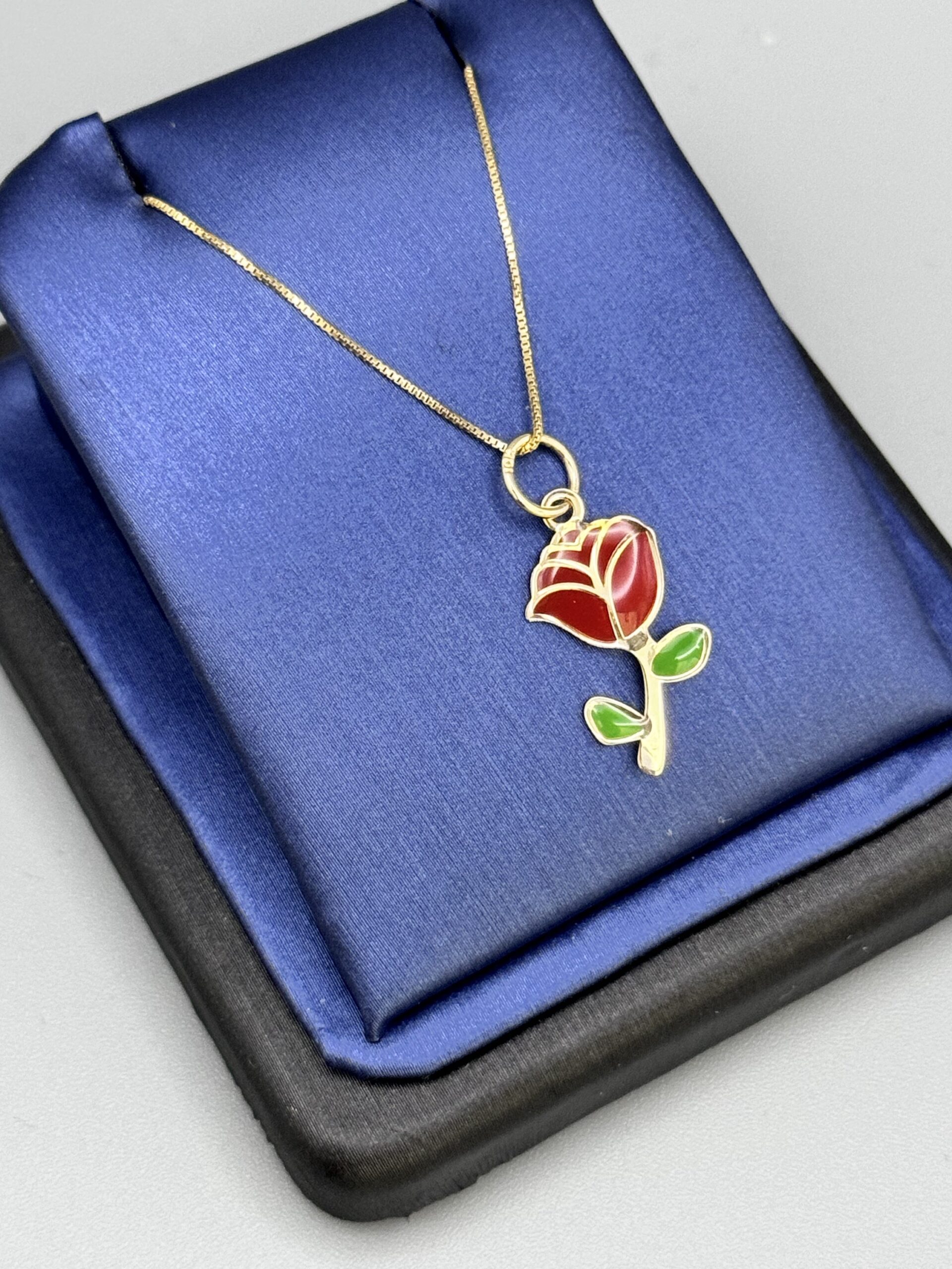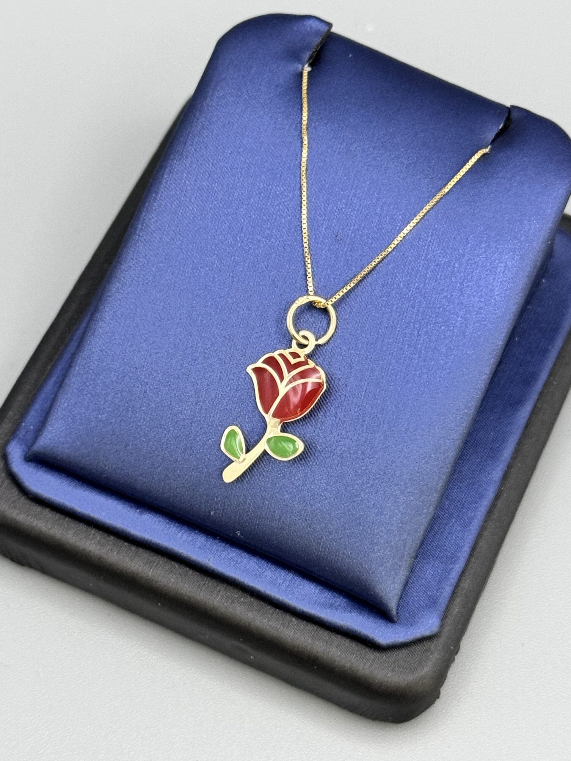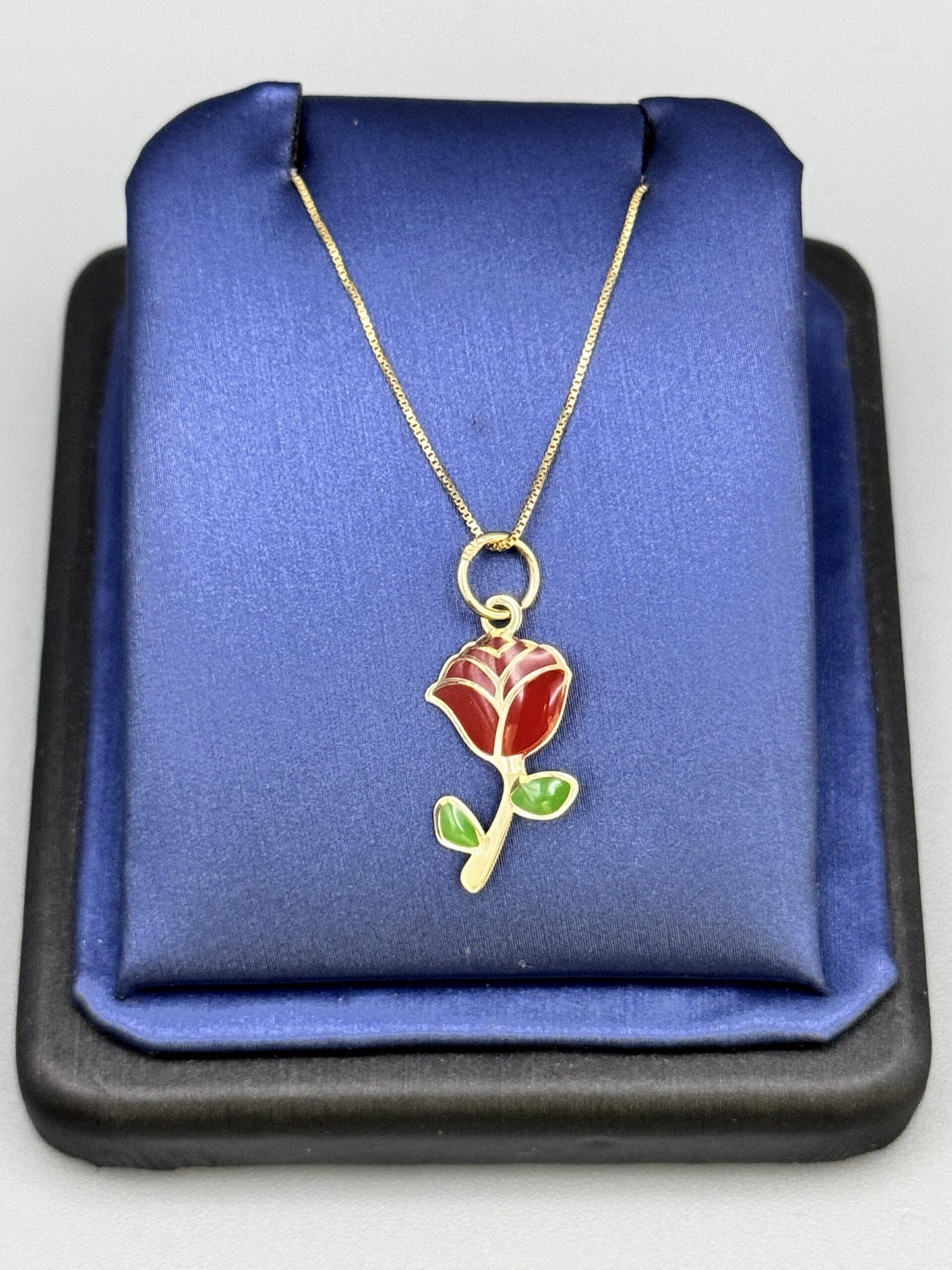 10KT Gold Fancy Rose Pendant Set Comes With 10KT Box Chain 18″ Approx Gold Weight 1.2 Gram All Together Big Look Double Side Enamel Pendant