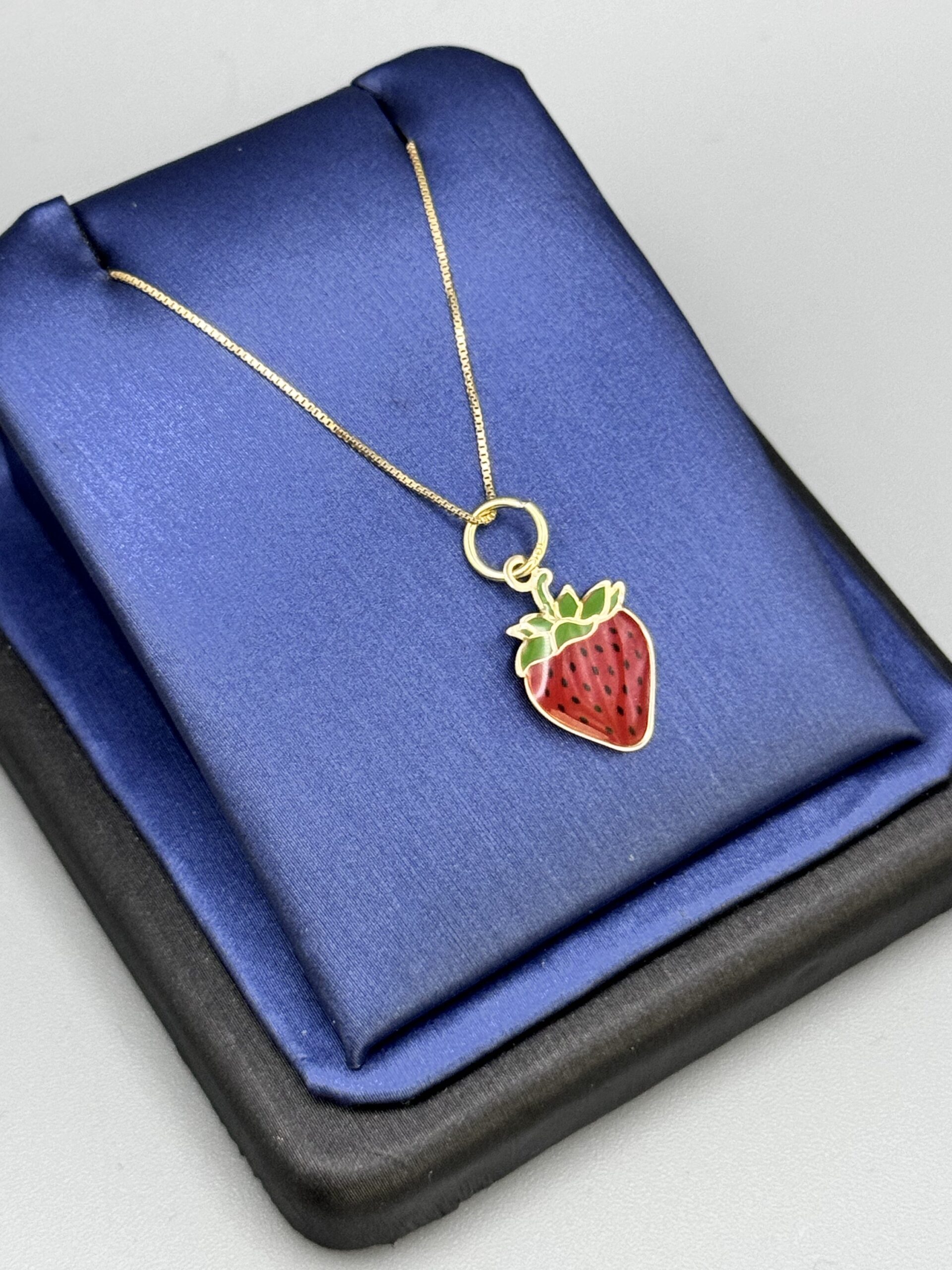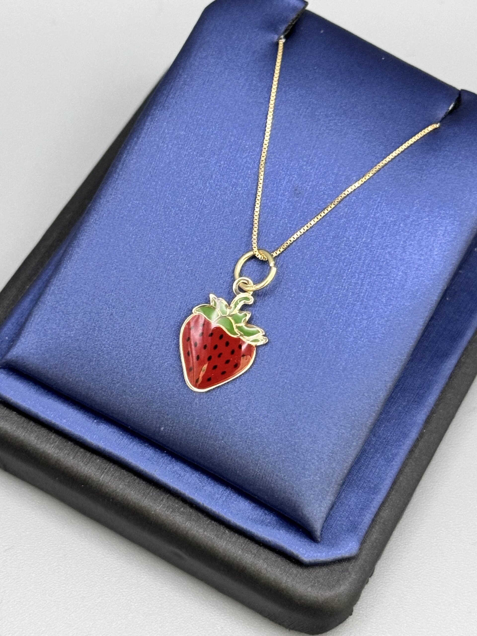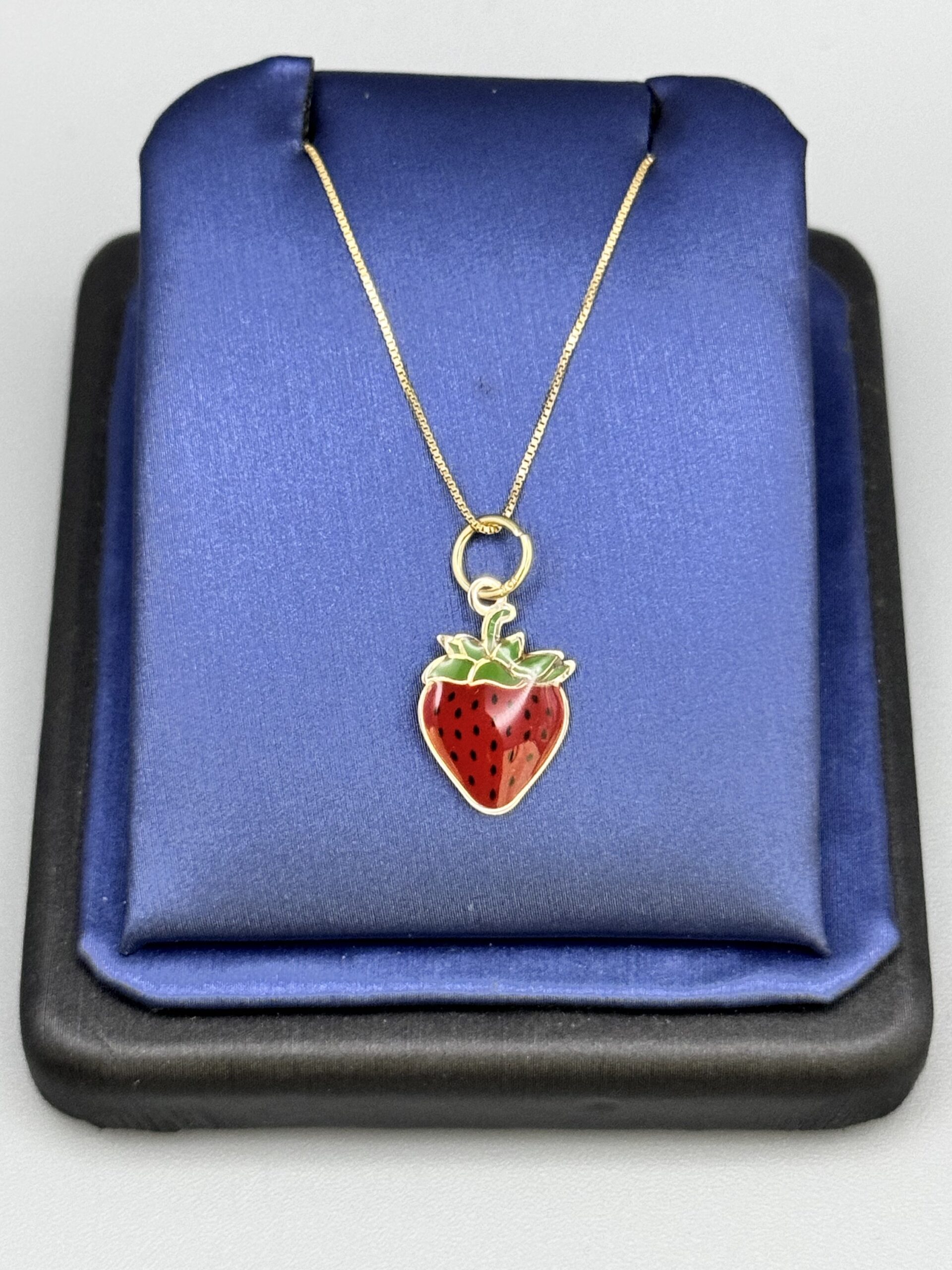 10KT Gold Fancy Strawberry Pendant Set Comes With 10KT Box Chain 18″ Approx Gold Weight 1.2 Gram All Together Big Look Double Side Enamel Pendant