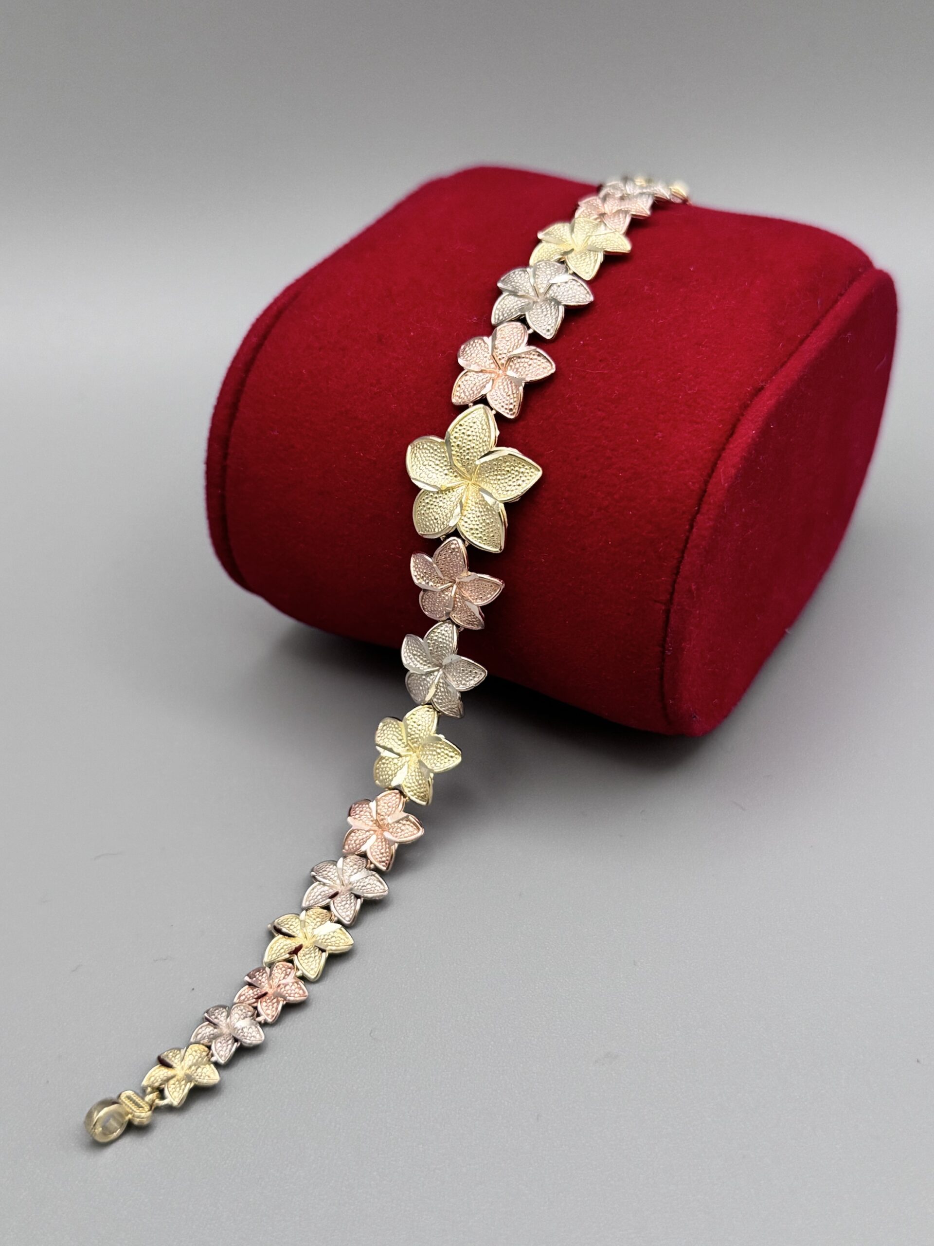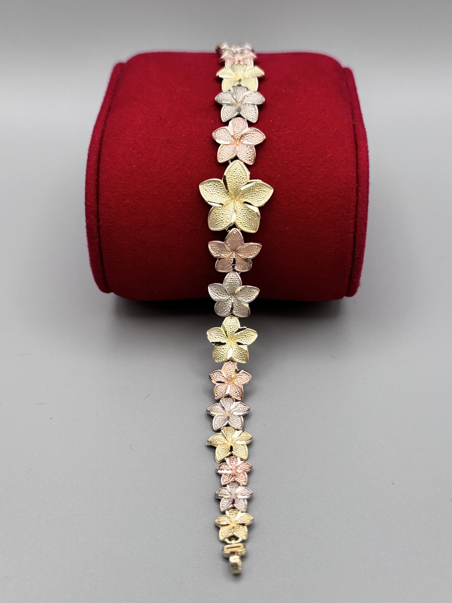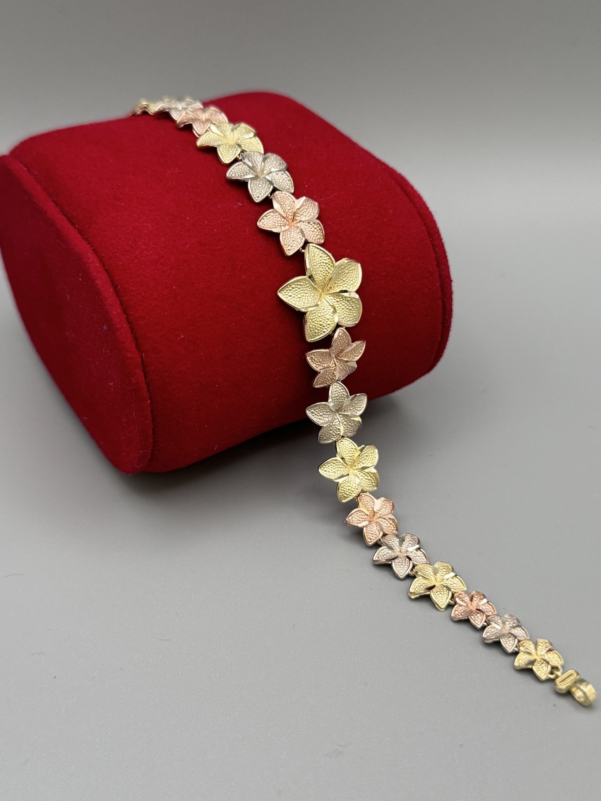 Embrace elegance with our 10Kt Gold Fancy TriColor Flower Bracelet! At size 7 and weighing 6.7 grams, it’s the perfect blend of charm and sophistication for any occasion. Wear floral flair today!