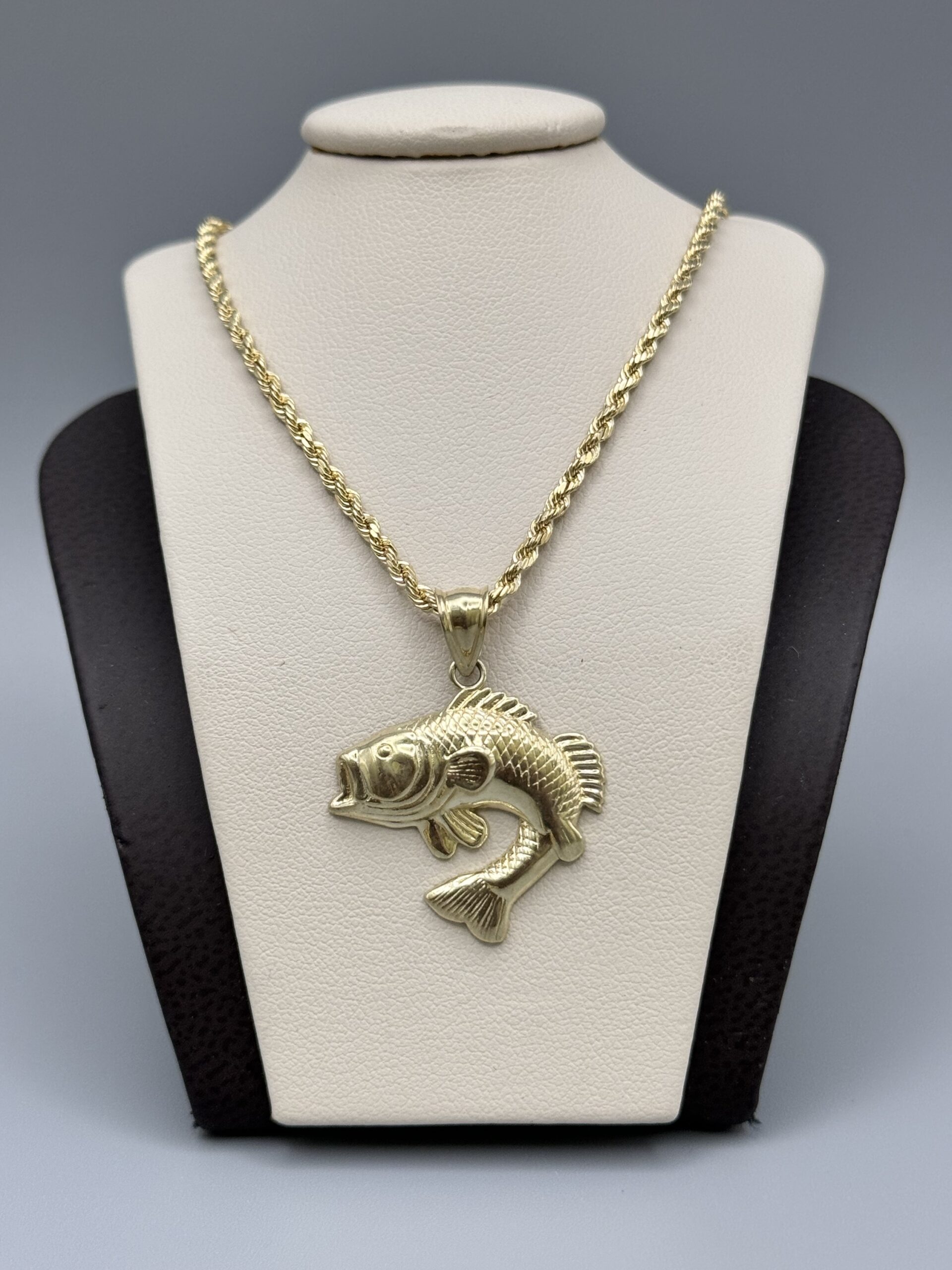 10KT Gold Fish Pendant ComboSet Comes With 10KT Gold 2MM Rope Necklace 22″ Approx Gold Weight 3.1 Gram Pendant 1.25″ Tall By 1.0″ Wide Approx Gold Weight 1.9 Gram
