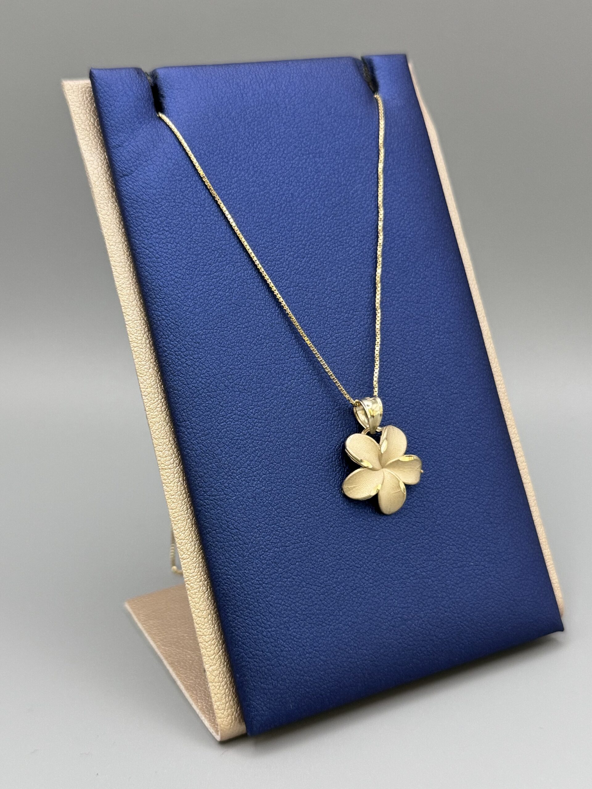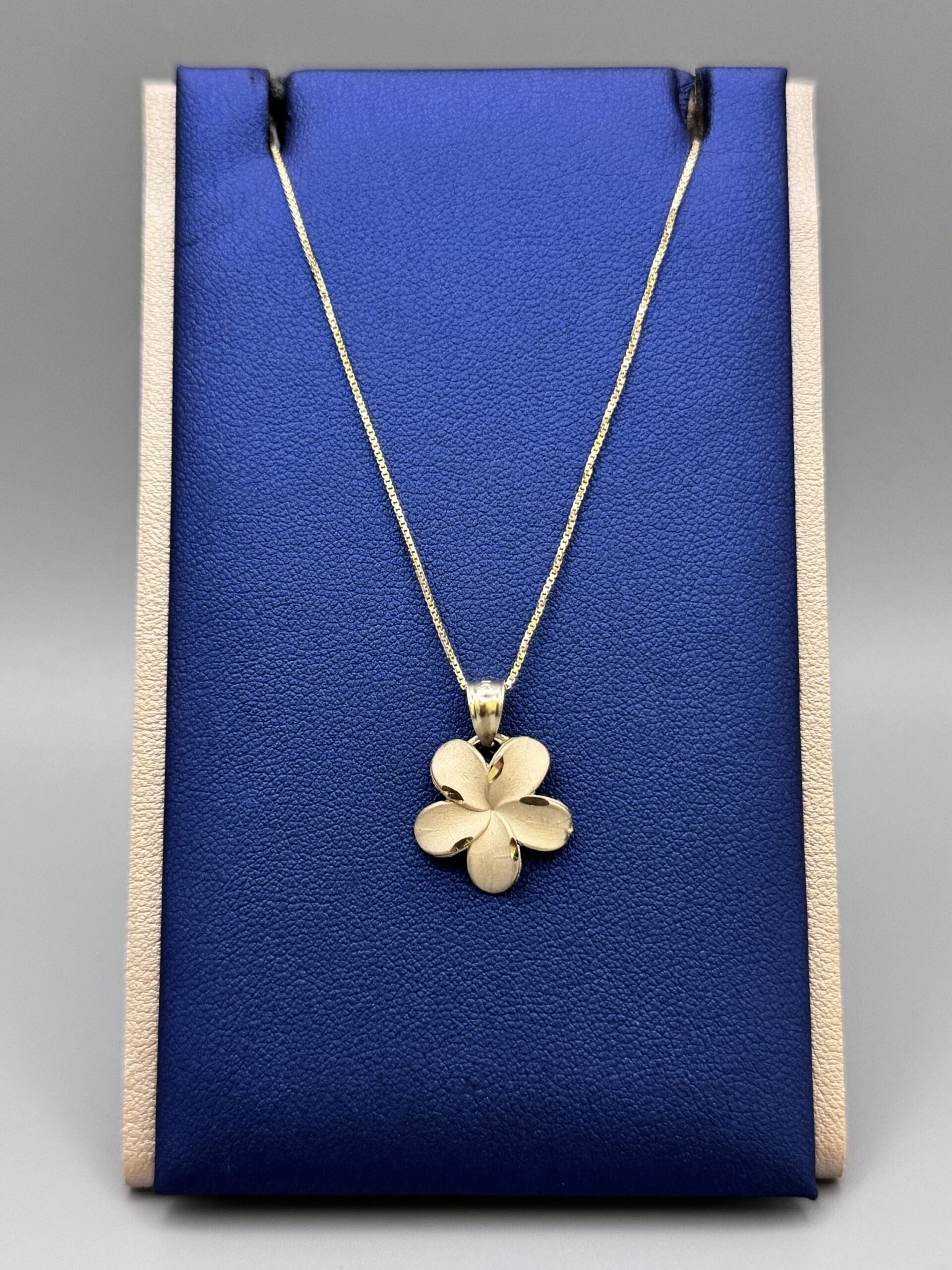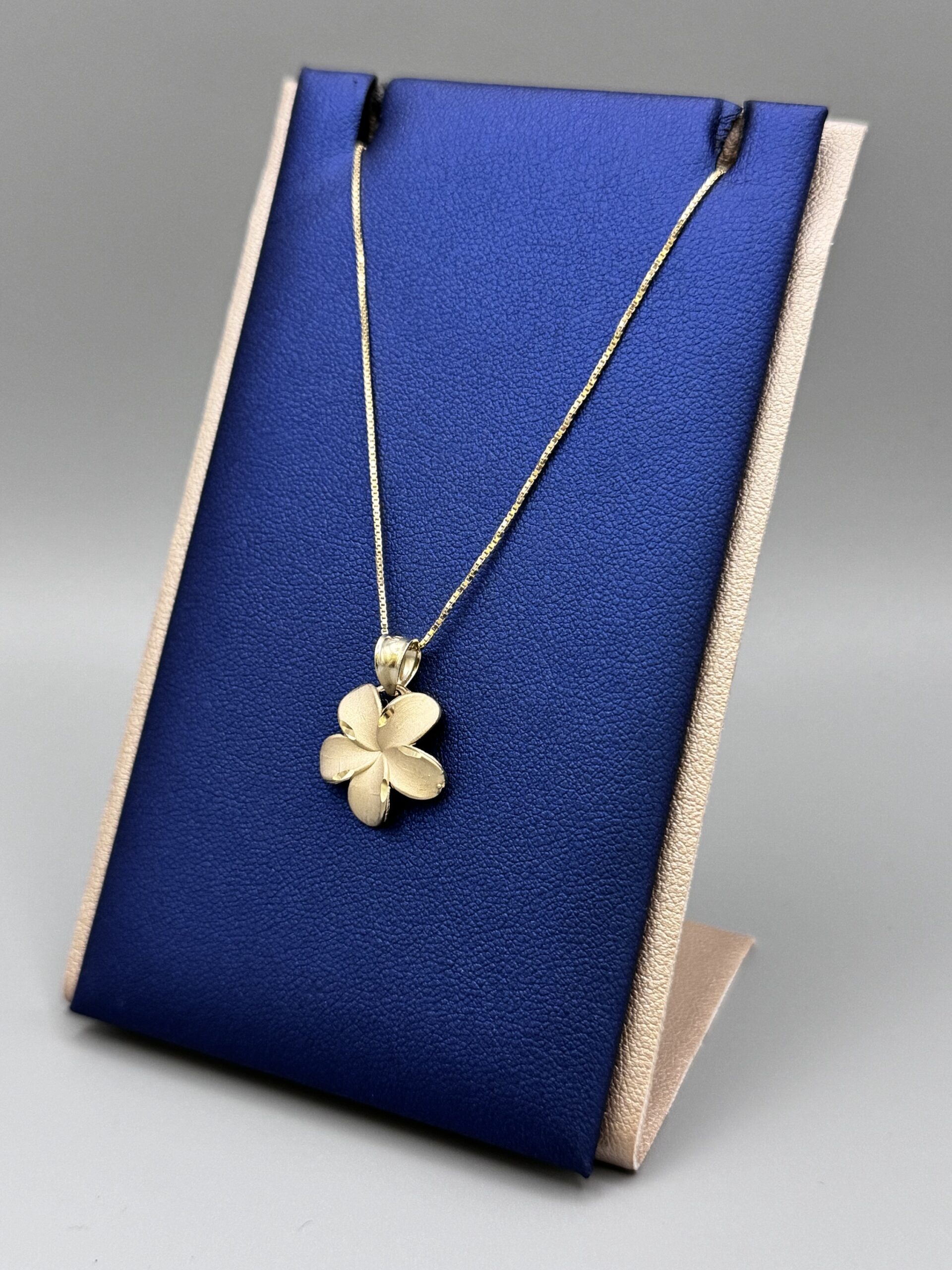 Elevate your style with this charming 10KT Gold Flower Pendant Set, complete with an 18″ box chain. Weighing just 2.5 grams, it’s a delightful blend of elegance and whimsy—perfect for any occasion!