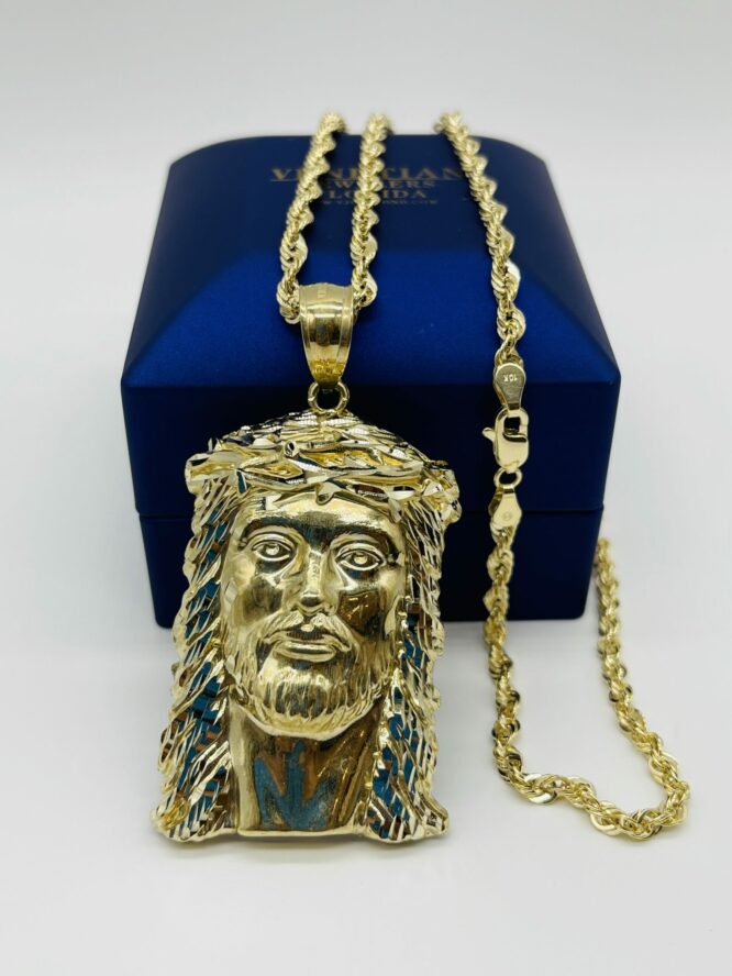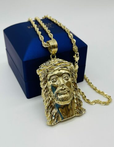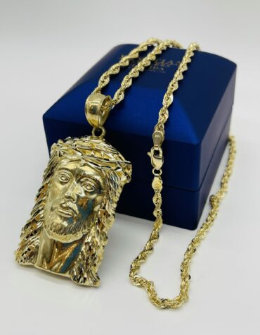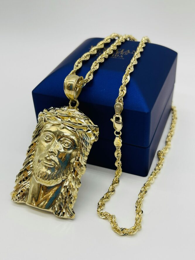 10Kt Gold Jesus Pendant ComboSet Comes With 10KT Rope 3.5MM 22″ Rope Necklace Approx Gold Weight Of Necklace 5.12 Grams Pendant 2.5″ Tall By 1.30″ Wide Approx Gold Weight 9.87 Grams