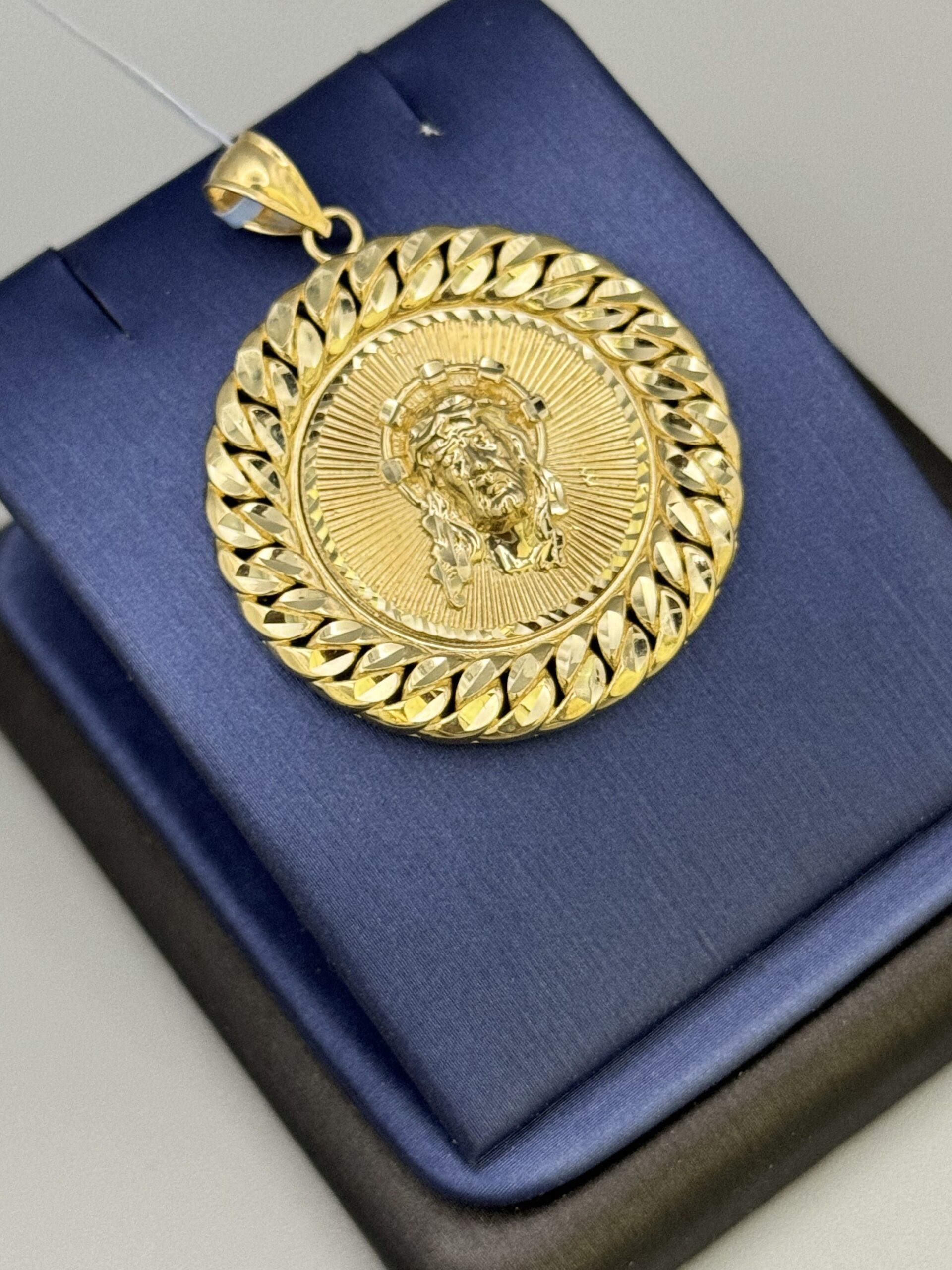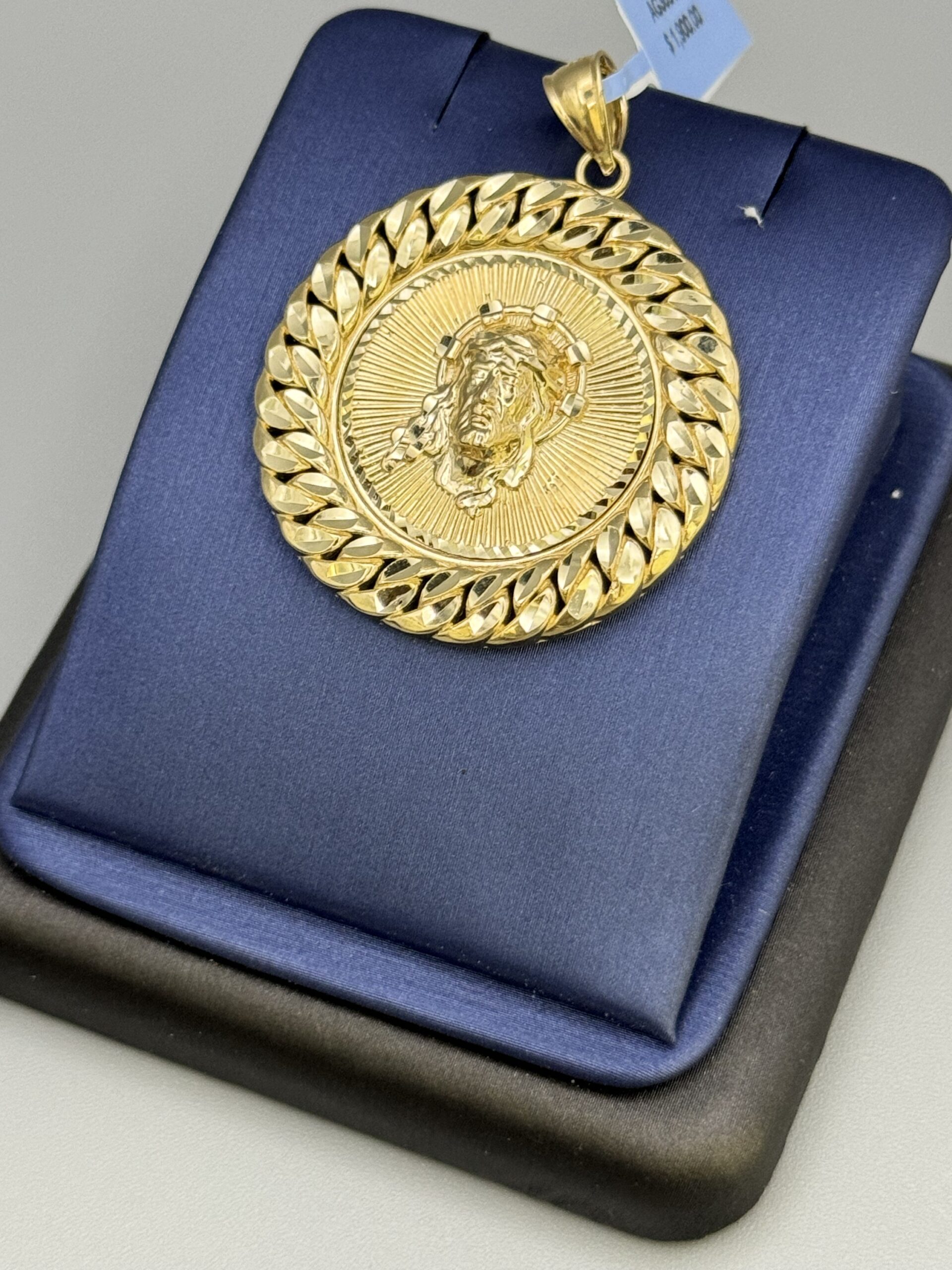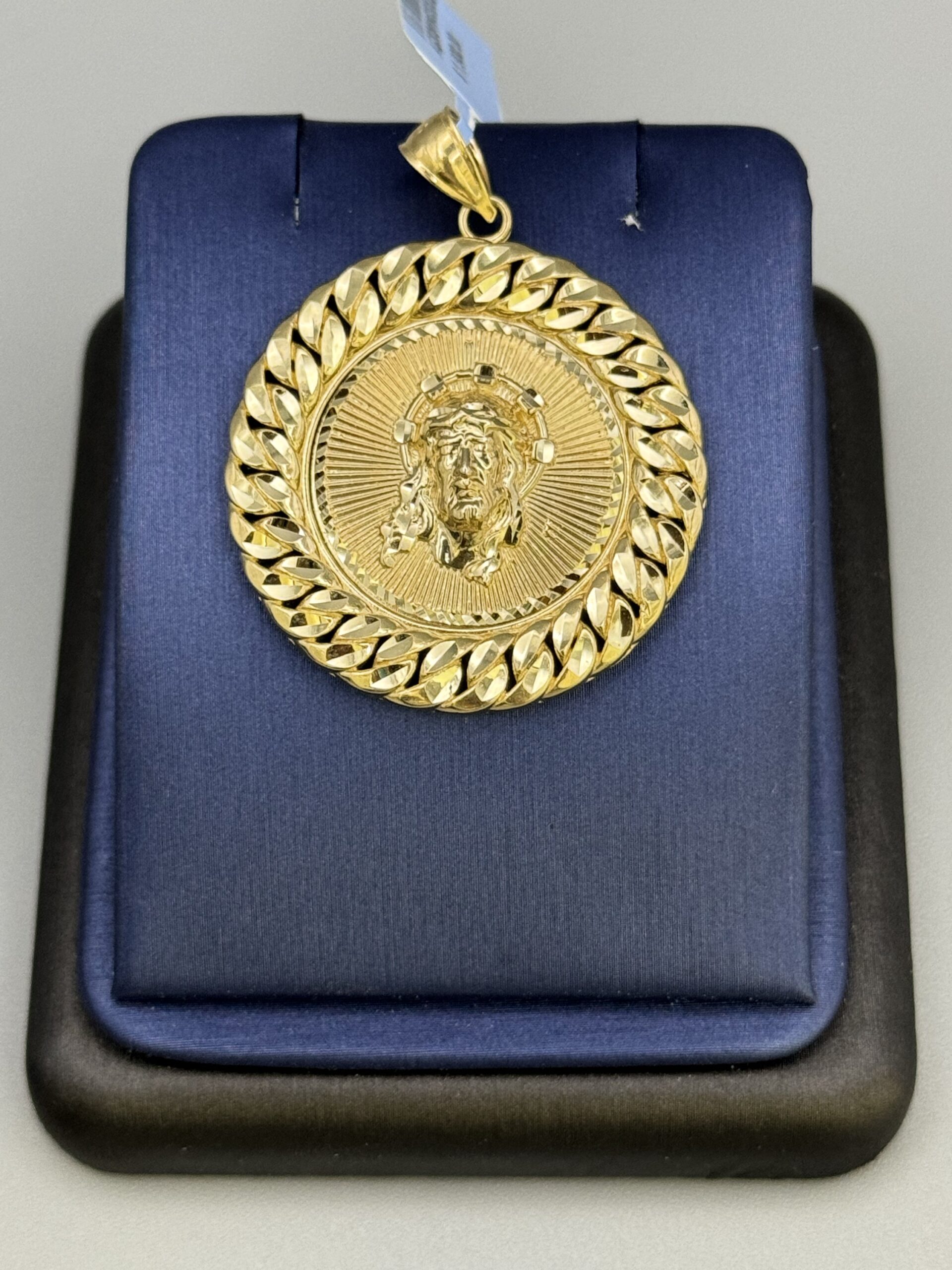 10KT Gold Jesus Face Round Medallion Pendant With Cuban Design Bezel Approx Gold Weight 6.5 Gram 1.4″ All Around 1.75″ Tall Includes Bell