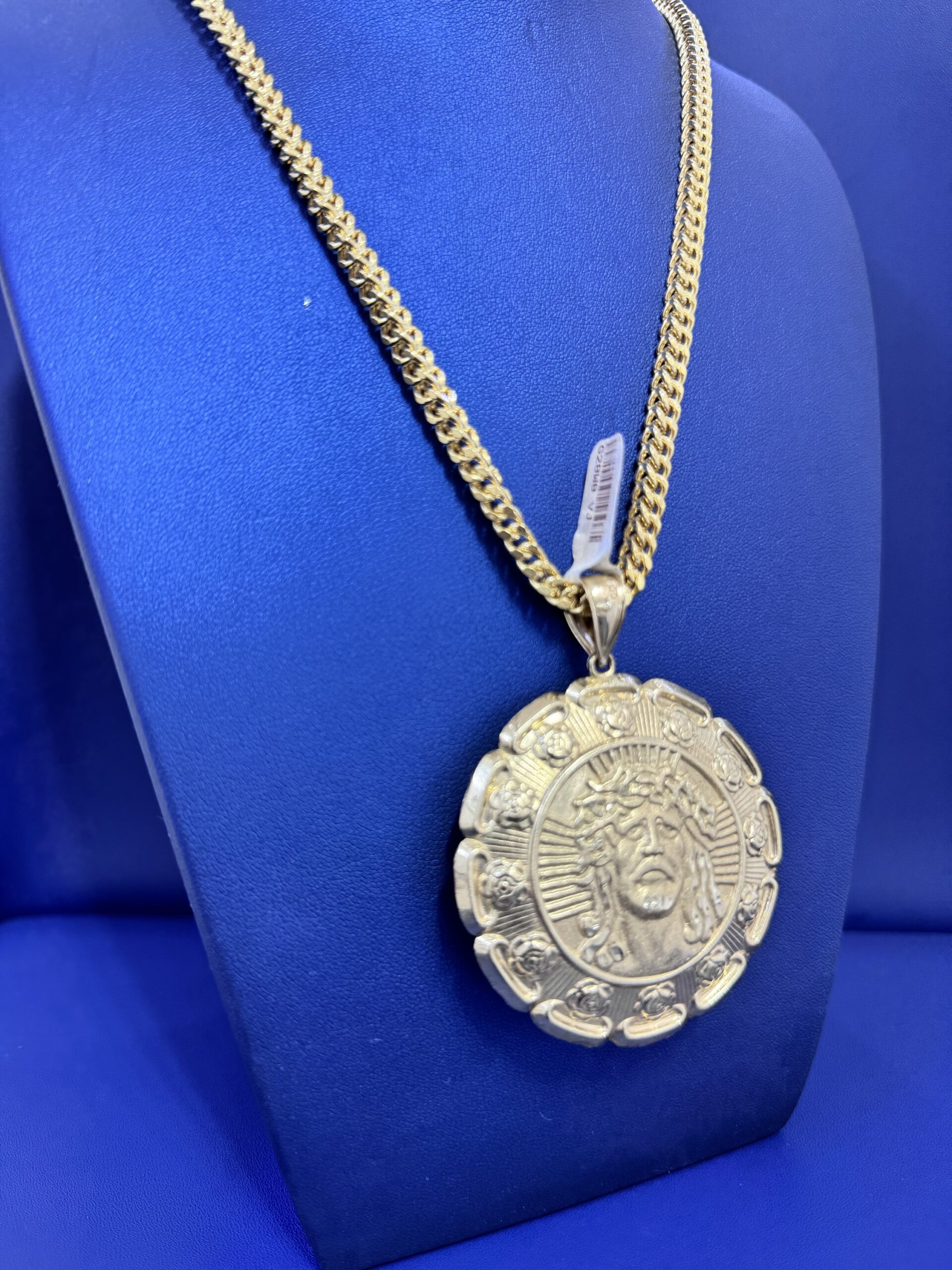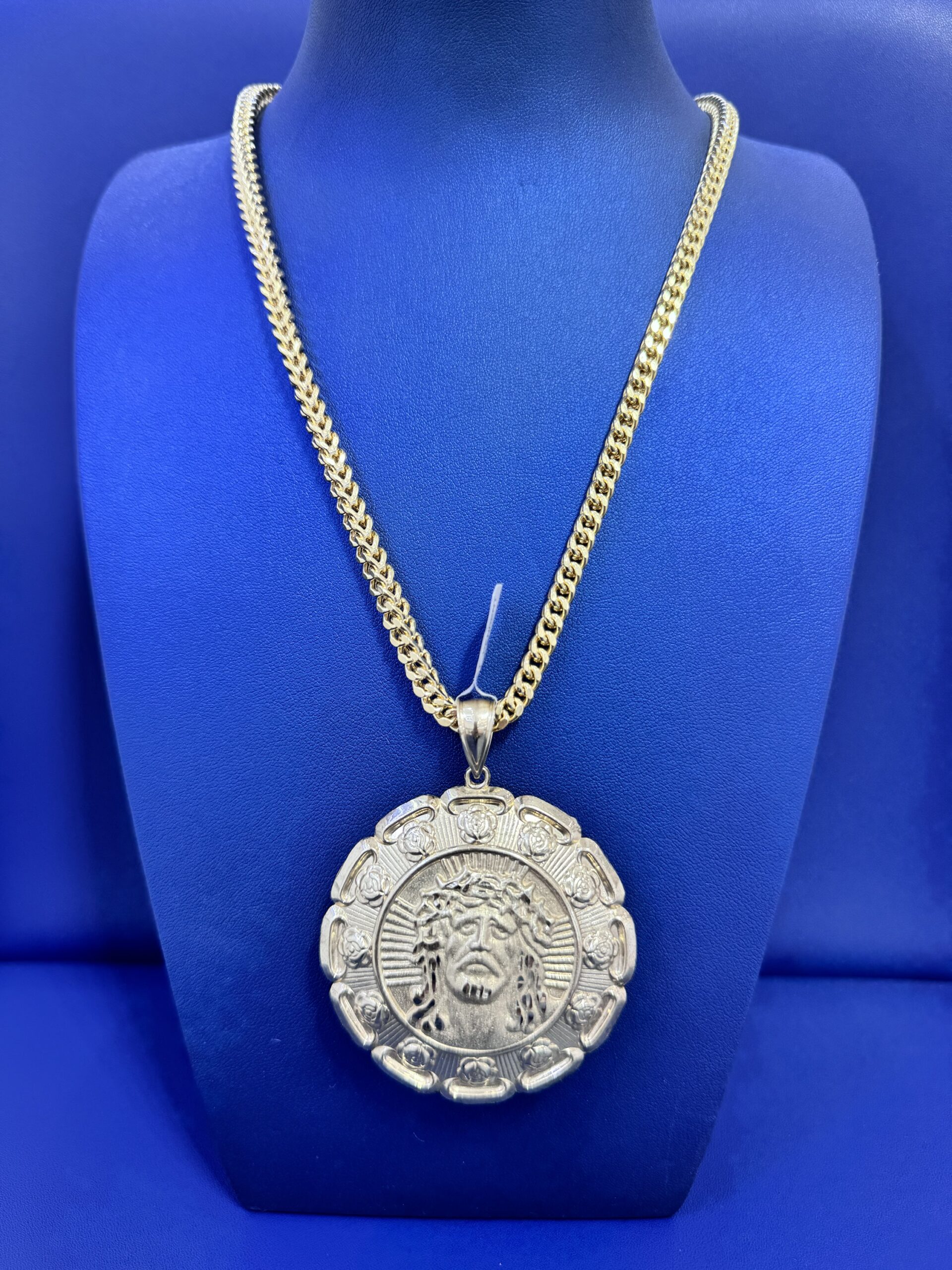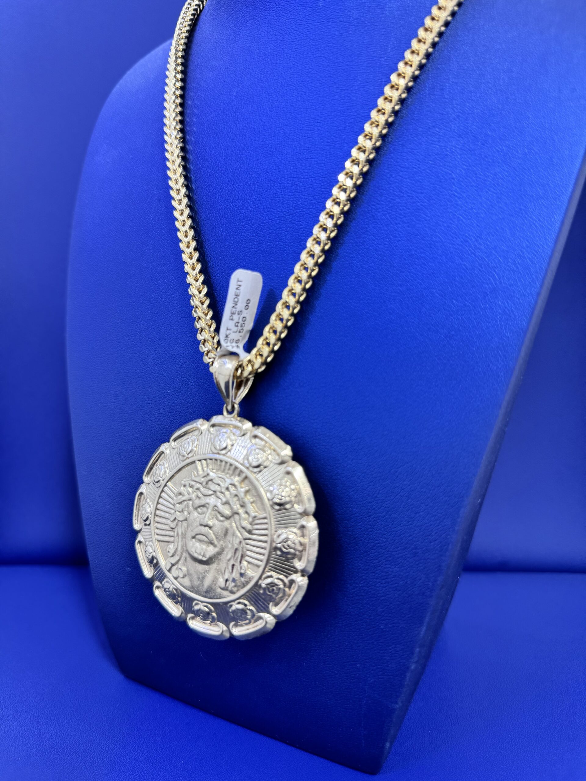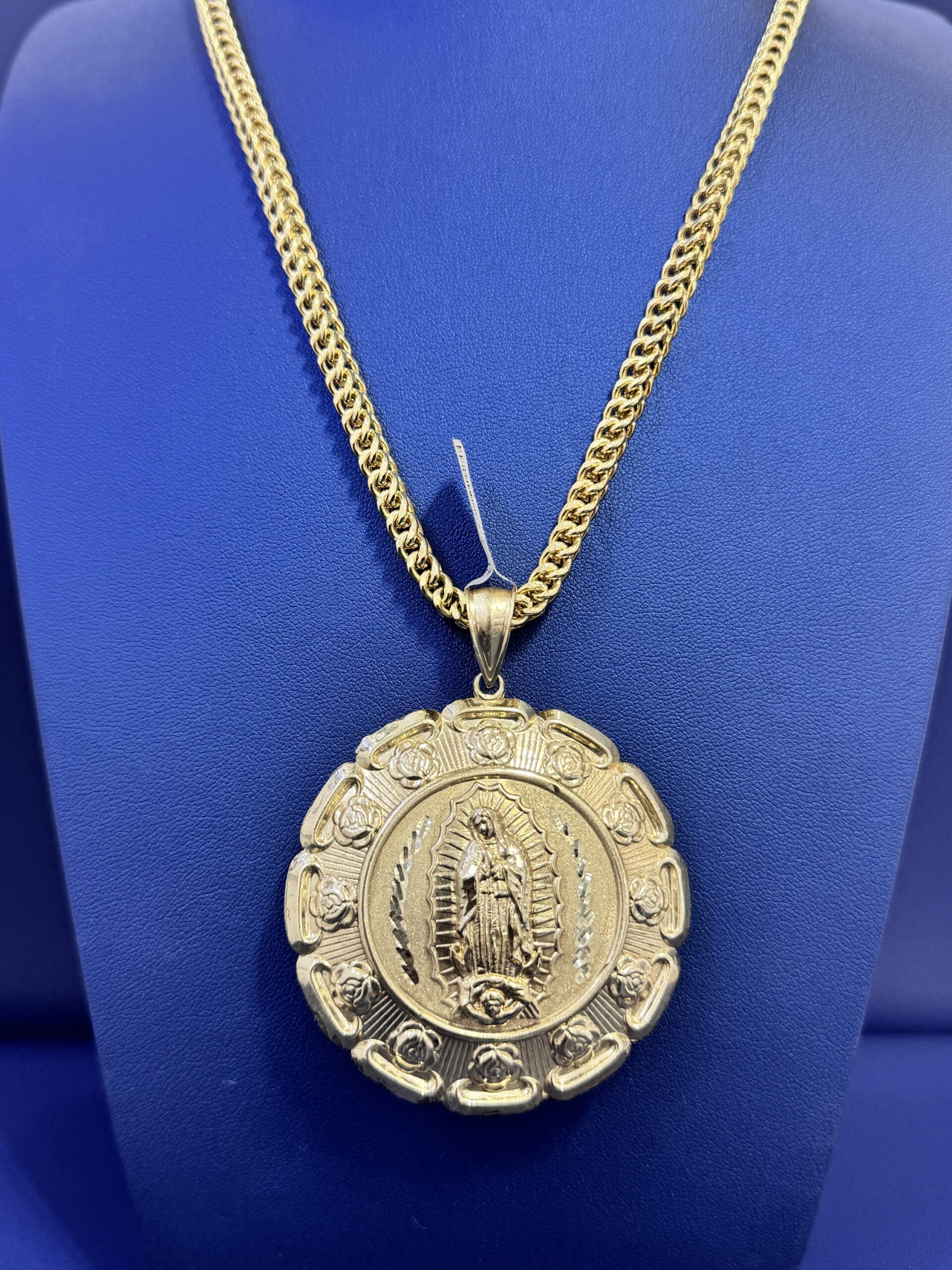 10KT Gold Jesus Mary Pendant ComboSet Comes With 5MM Franco Necklace 22″ Approx Gold Weight 24.2 Gram Pendant 2.75″ Tall By 2.25″ All Around 3D Double Sided Approx Gold Weight 29.3 Gram