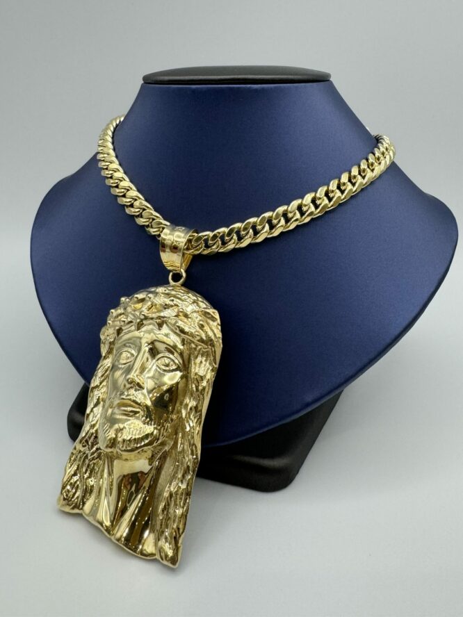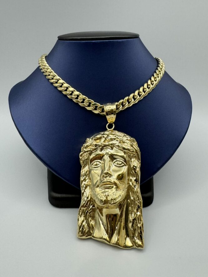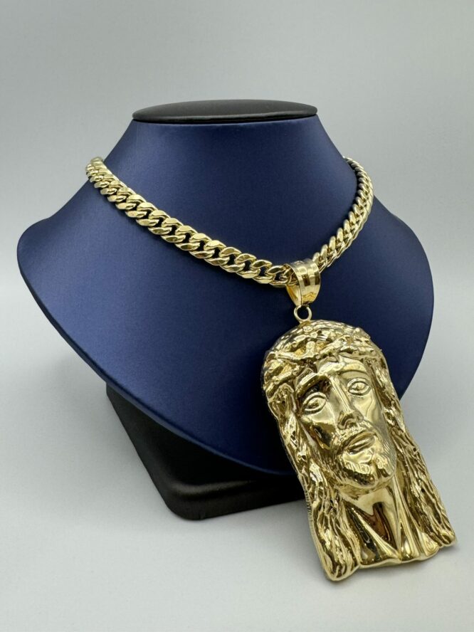 10KT Gold Jumbo Size Jesus Pendant Comes With 9MM 10KT Gold MiamiCuban Necklace 22″ Approx Gold Weight 43.9 Gram Pendant 3.75″ Tall By 1.80″ Wide Approx Gold Weight 28.6 Gram